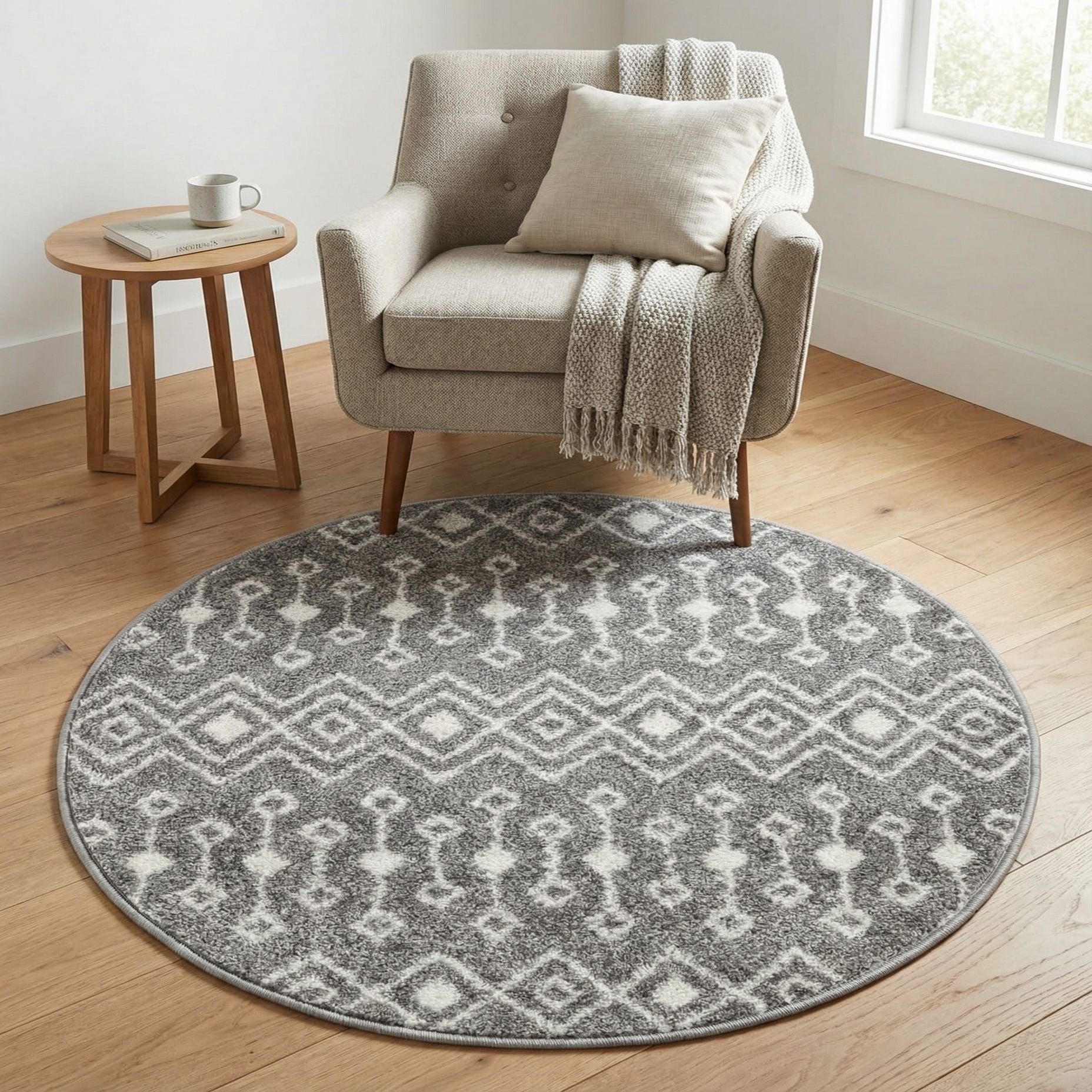 A round rug with a Moroccan-inspired trellis pattern in ivory set against a gray background. The design alternates diamond bands with small elongated dot motifs, creating a balanced, rhythmic layout that feels both classic and contemporary. Machine-made from polypropylene, the pile is soft and slightly cushioned, with a subtle texture where the ivory motifs sit against the gray field for gentle visual depth.