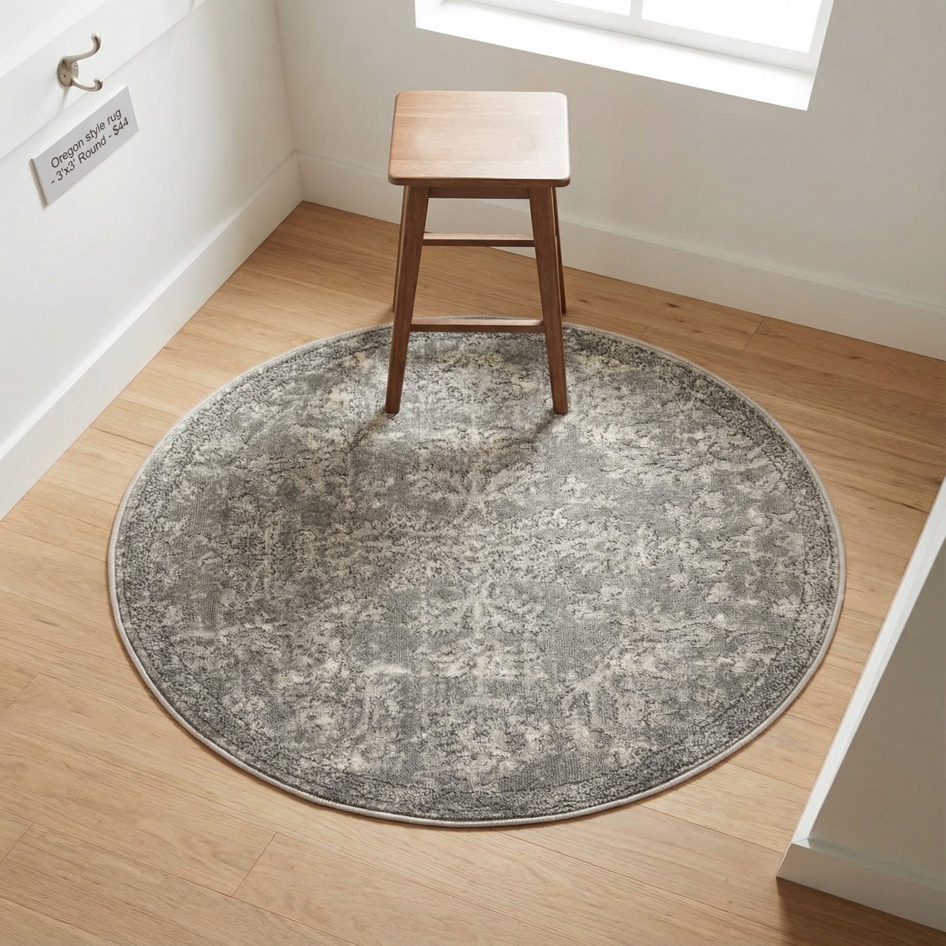 Machine made from 85% polypropylene and 15% polyester, the surface offers a smooth, touchable feel with faintly raised areas where the design is defined. It’s well suited to small, focused spaces — place it under a round bistro table, in a cozy reading nook, at the foot of a bed, or near an entryway to anchor a seating vignette. The neutral gray and ivory palette works easily with modern, transitional, or farmhouse interiors, pairing especially well with light woods, metal accents, and soft textiles.