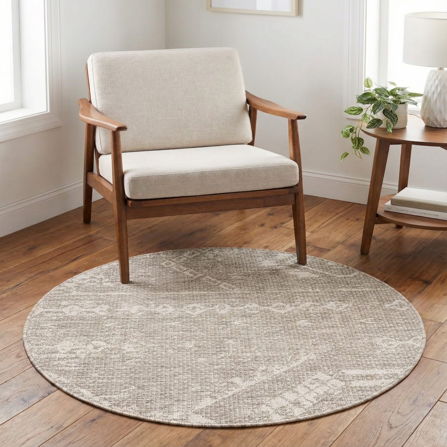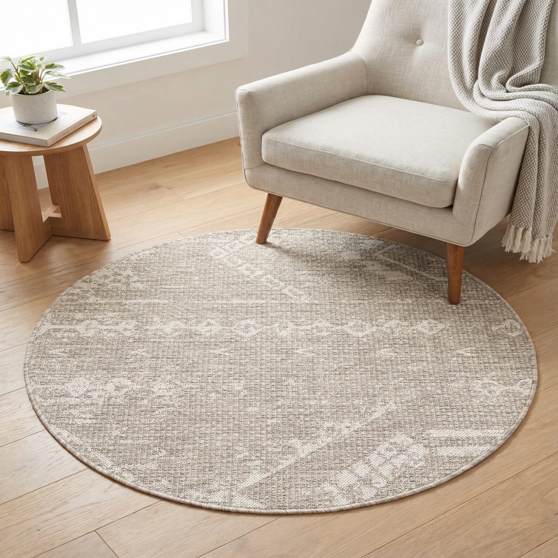 Machine-made from 100% polypropylene, this round rug pairs a soft gray background with ivory geometric and tribal-inspired motifs for a calm, collected look. The design uses linear banding and small diamond accents that are woven into a low, tightly constructed surface; when you run your hand across it you’ll notice a subtle, slightly textured weave rather than a plush pile. The neutral gray grounds the pattern while the ivory details add gentle contrast, giving the piece a relaxed, modern-boho feel.