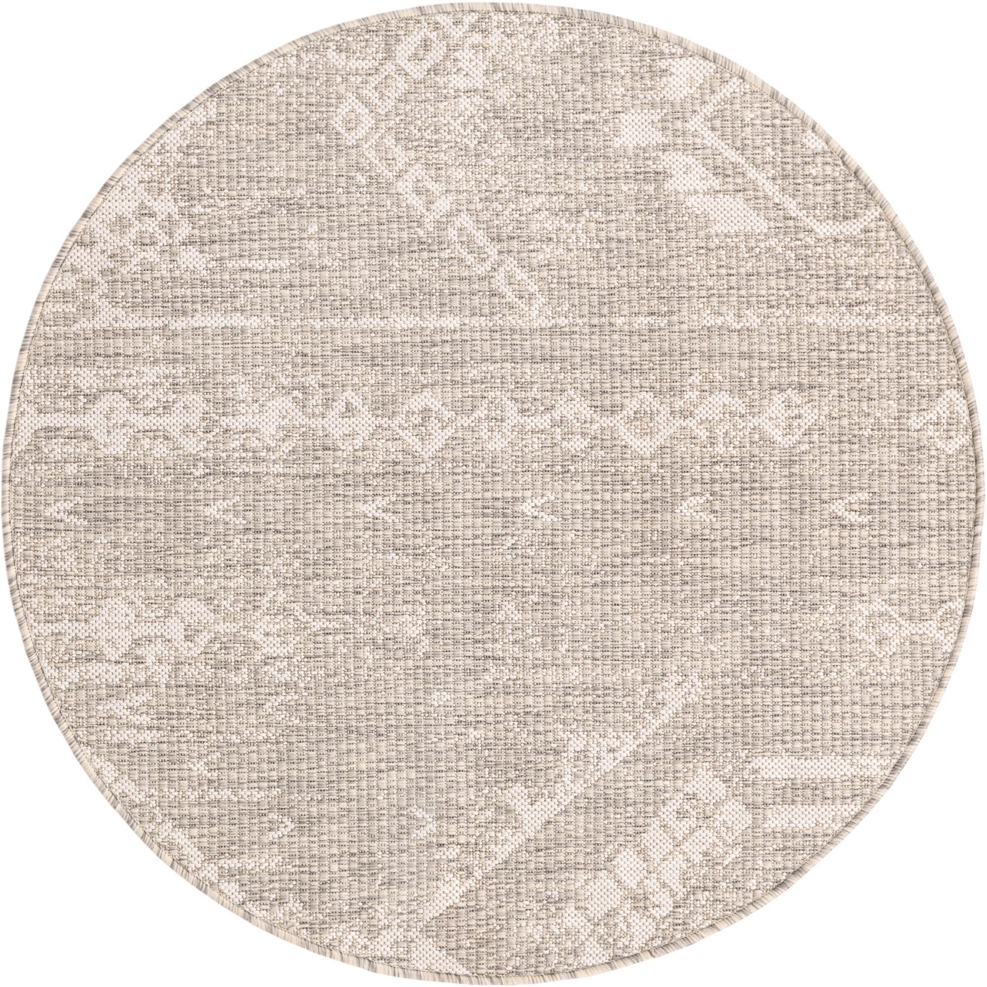 Machine-made from 100% polypropylene, this round rug pairs a soft gray background with ivory geometric and tribal-inspired motifs for a calm, collected look. The design uses linear banding and small diamond accents that are woven into a low, tightly constructed surface; when you run your hand across it you’ll notice a subtle, slightly textured weave rather than a plush pile. The neutral gray grounds the pattern while the ivory details add gentle contrast, giving the piece a relaxed, modern-boho feel.