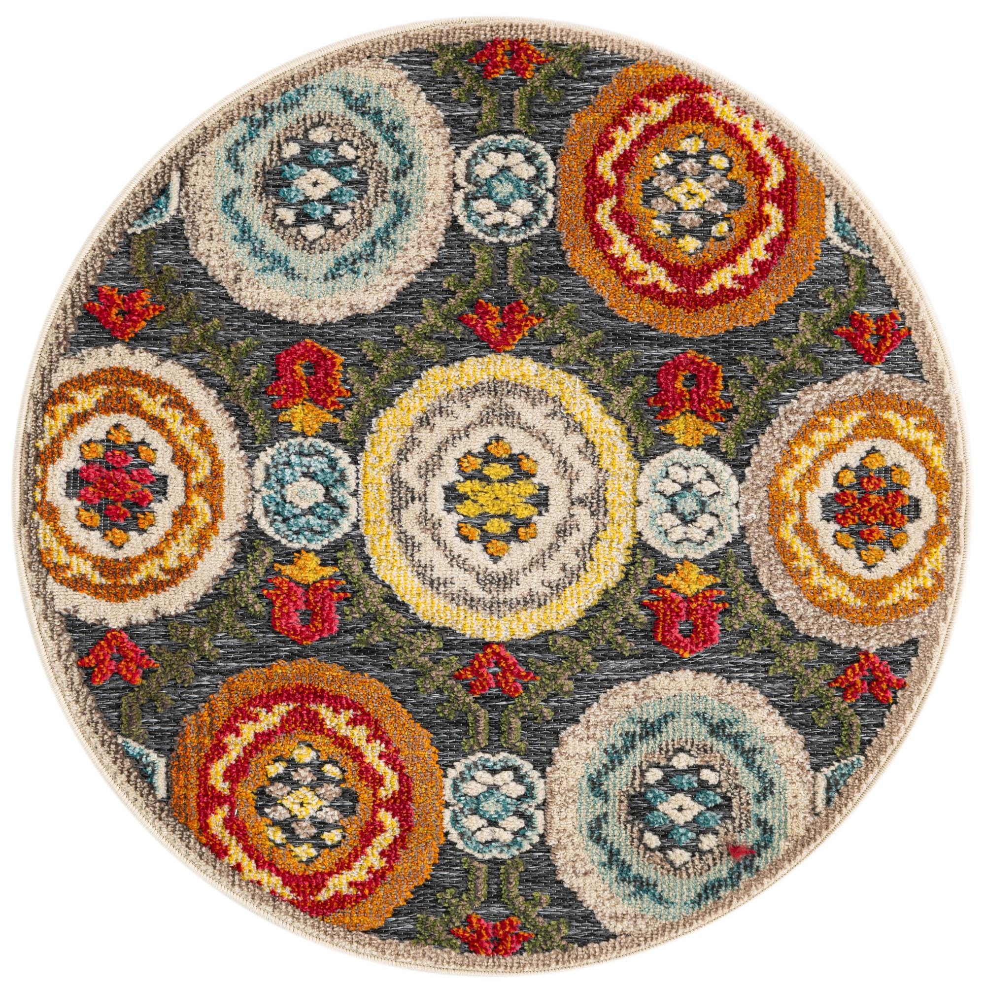 A 3' round gray modern rug with colorful medallion patterns in red, orange, yellow, and blue, suitable for indoor/outdoor use.