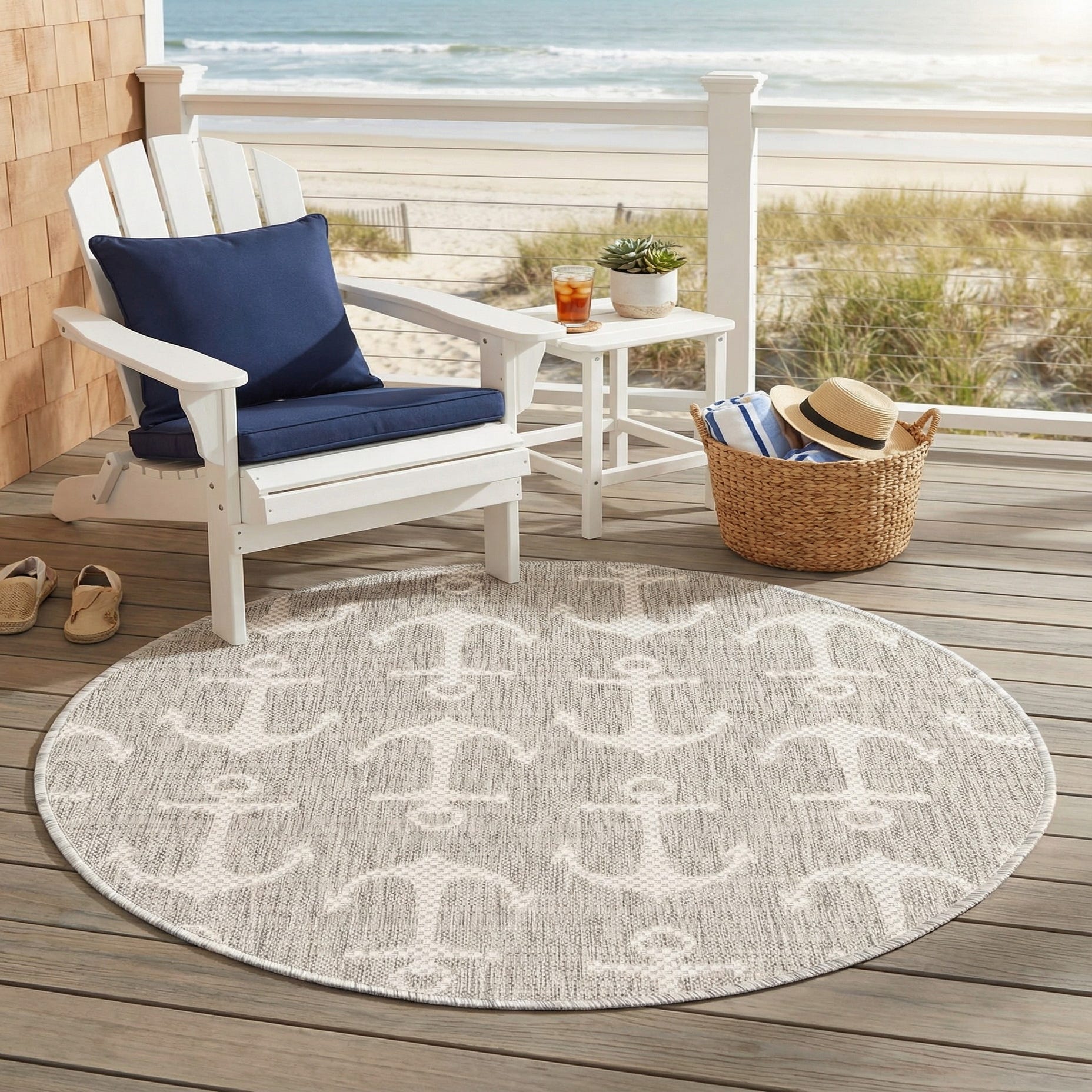 A round 3' gray and white coastal rug featuring a repeating anchor pattern, ideal for indoor or outdoor use.