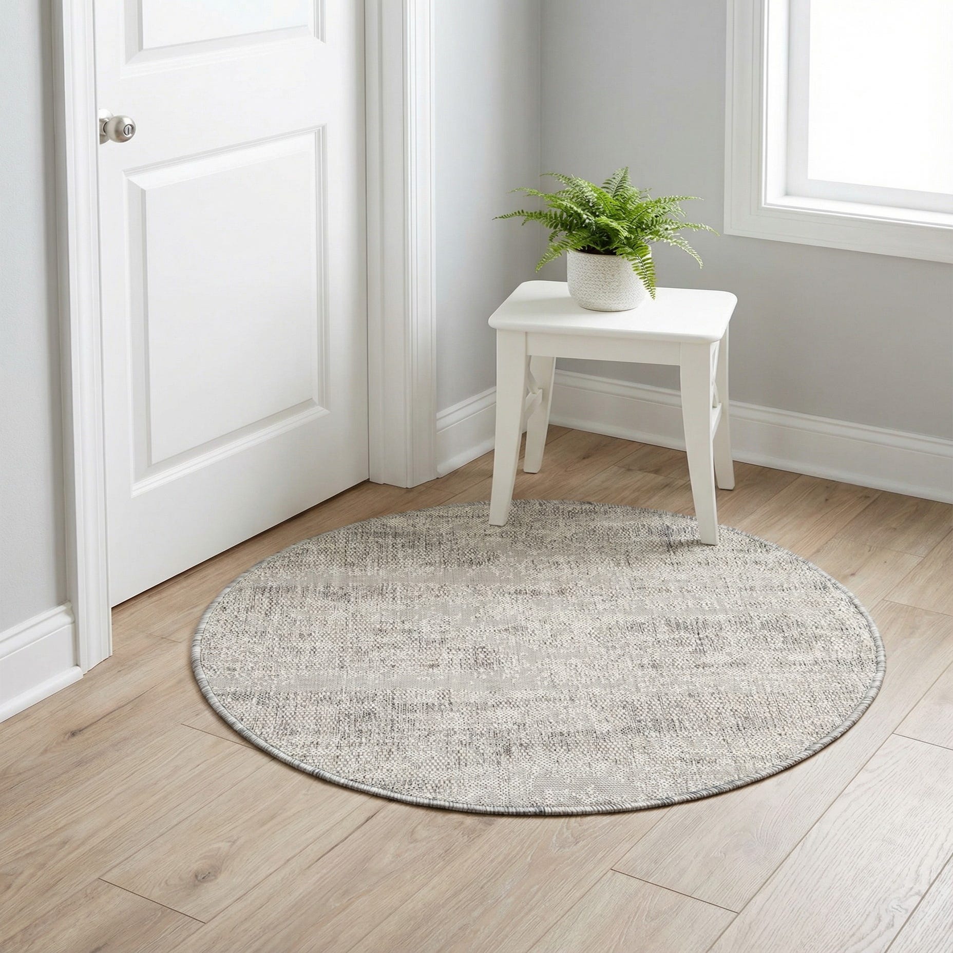The understated color palette—predominantly gray with ivory accents—meshes seamlessly with contemporary, minimalistic, or Scandinavian-inspired decor, while its round shape offers a harmonious counterpoint to angular furniture, providing a soft visual break in an outdoor sitting area or patio dining space. The pet-friendly nature and shed-free properties of this rug reinforce its practicality for homes with pets, where ease of cleaning is often a priority.