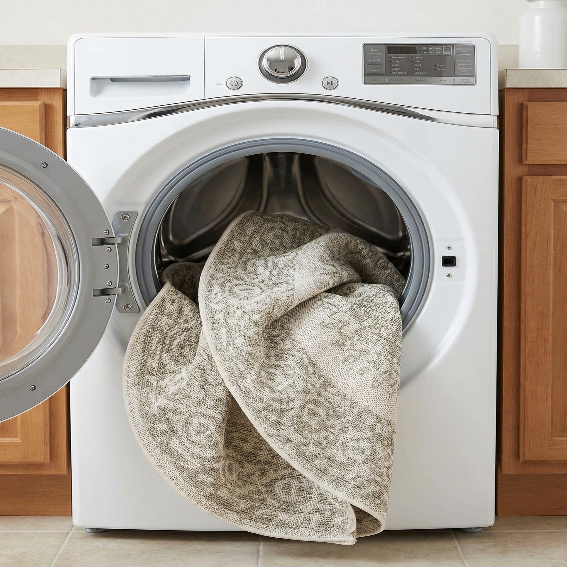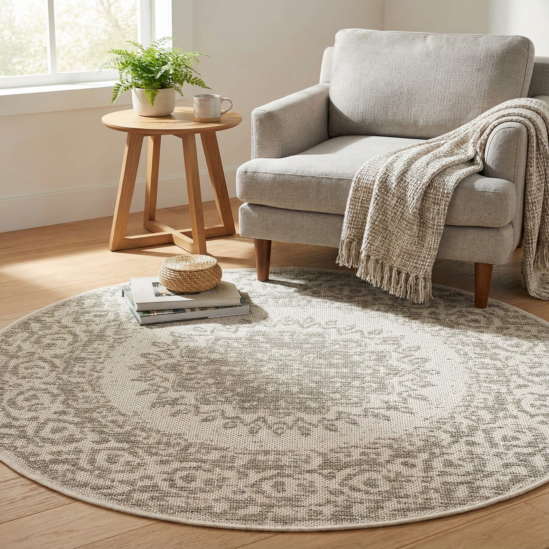 Machine-made from 100% polypropylene, the rug has a low-profile, tightly woven texture that feels slightly textured underfoot rather than plush. That construction makes it a good choice for outdoor seating areas, covered porches, sunrooms, or a small entry where you want pattern without bulk. Pair it with wicker or rattan furniture and neutral cushions for a coastal or farmhouse vibe, or set it under a bistro table on a balcony for a quiet, refined spot to relax.