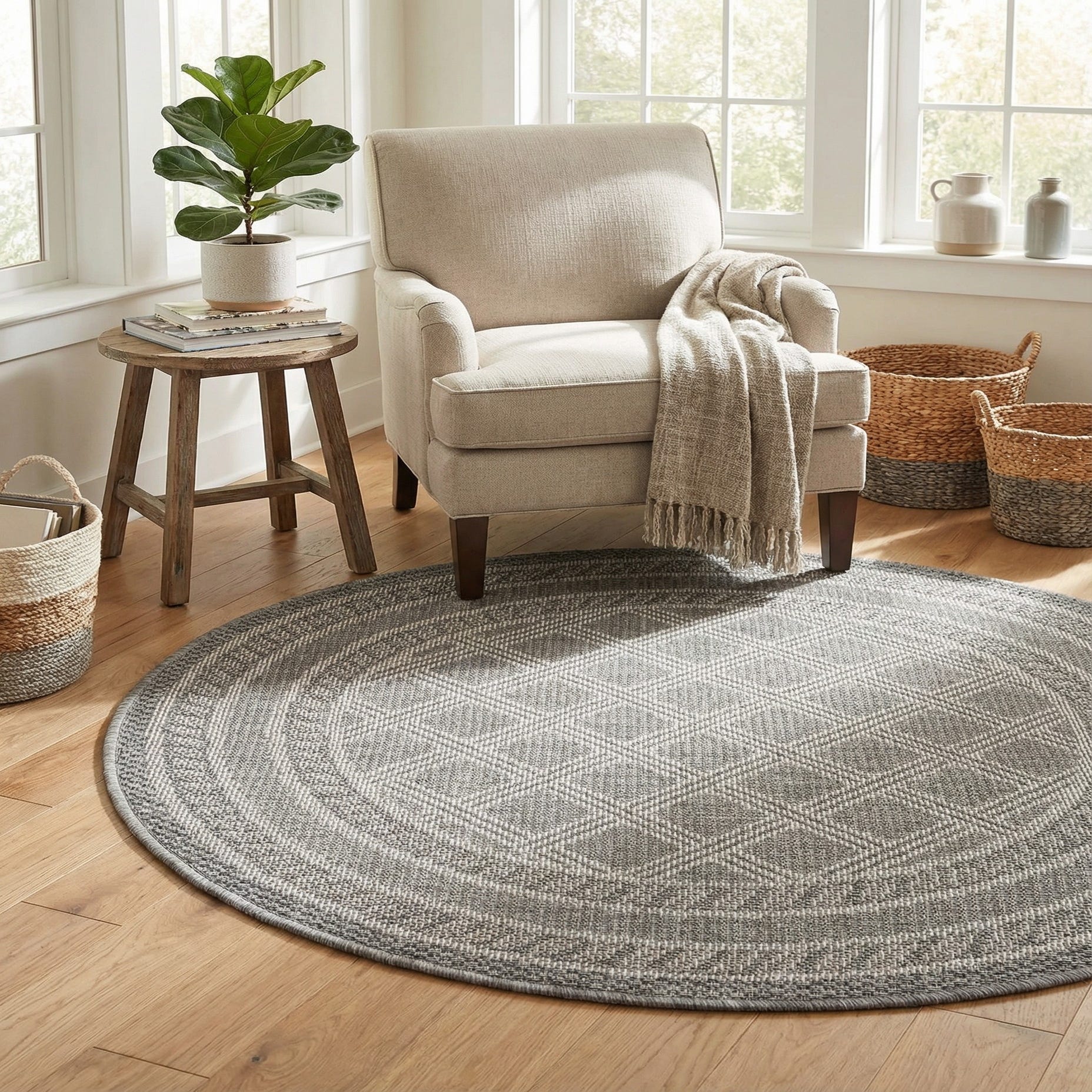 A 3' 3 round gray indoor/outdoor rug with a contemporary lattice pattern and textured flatweave.
