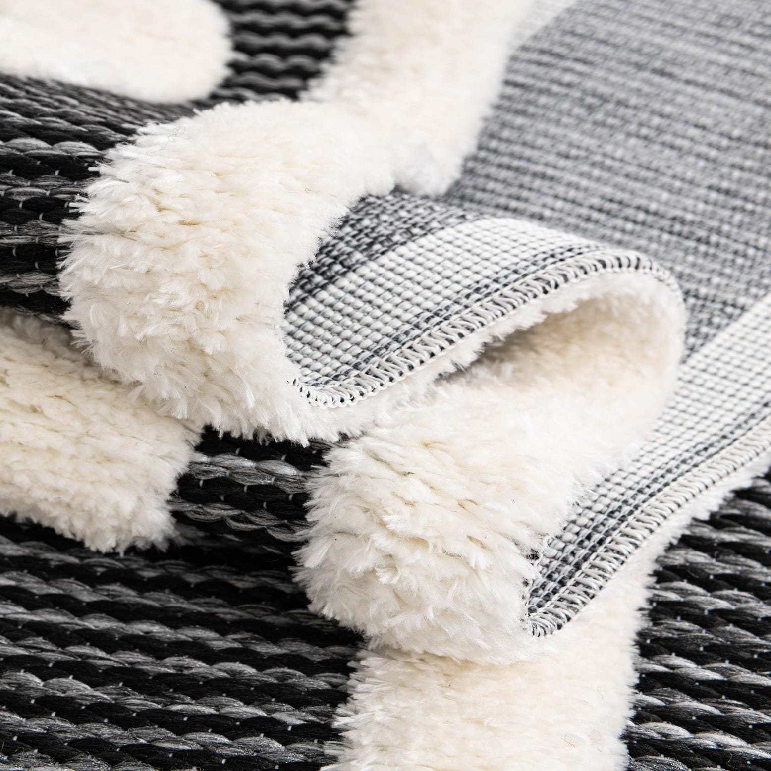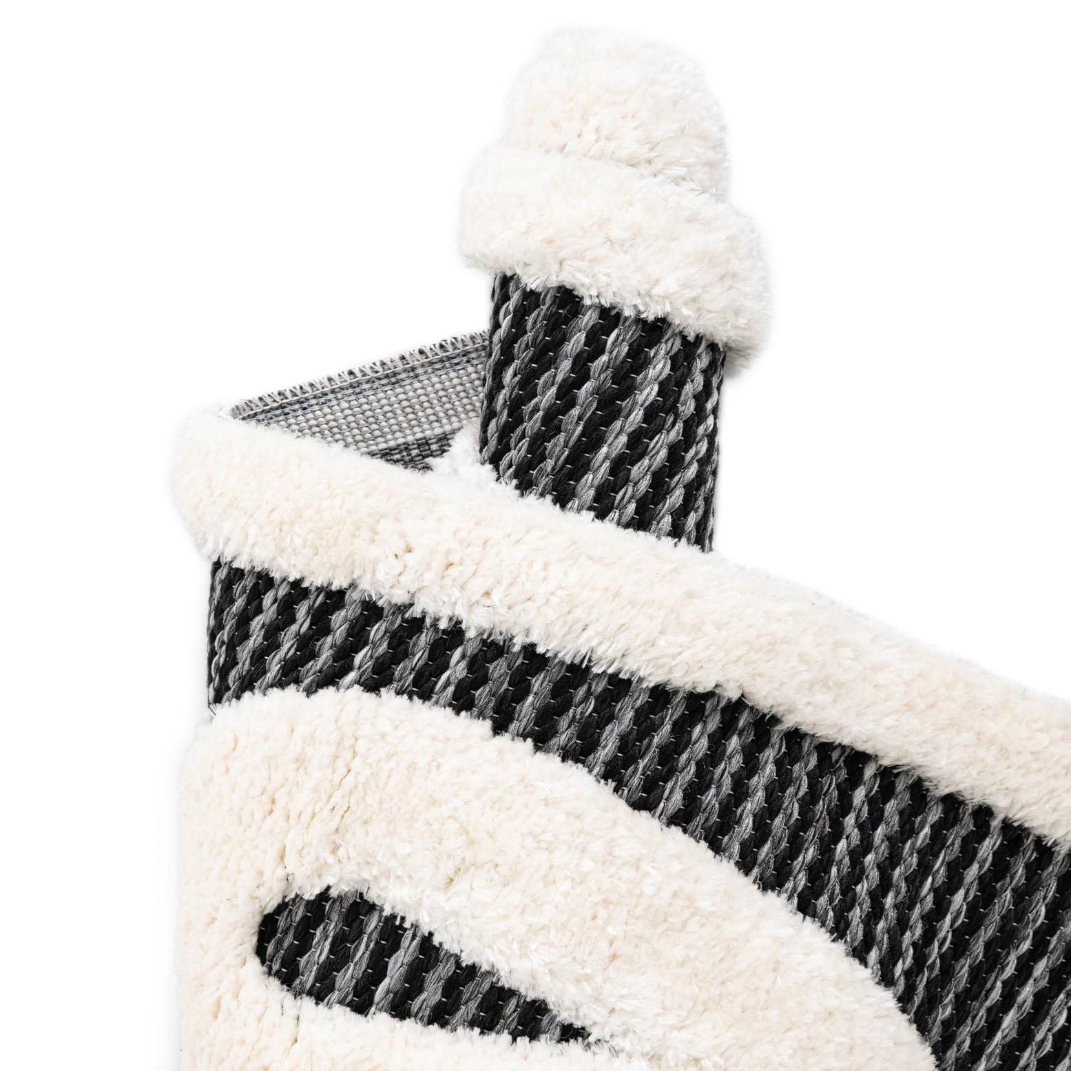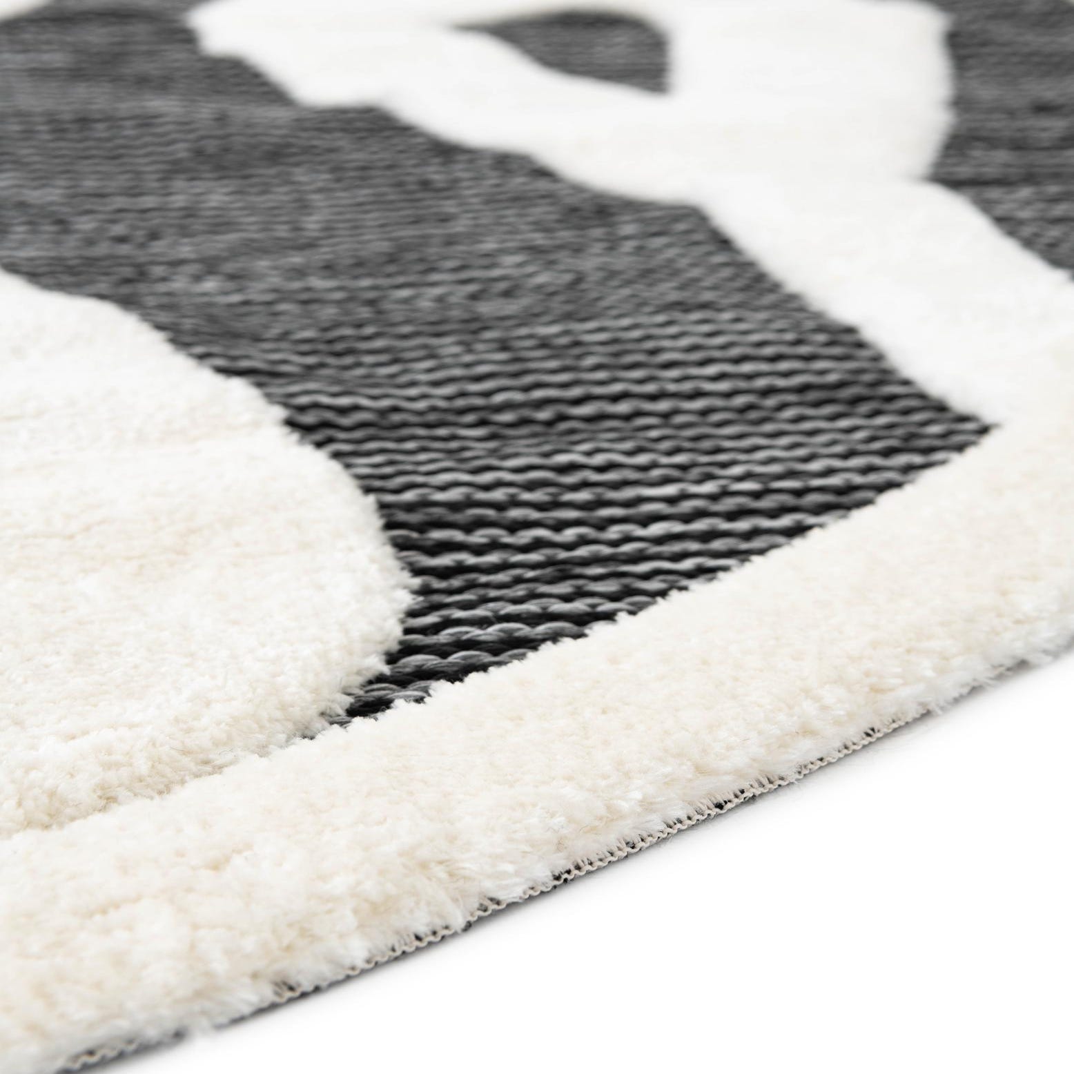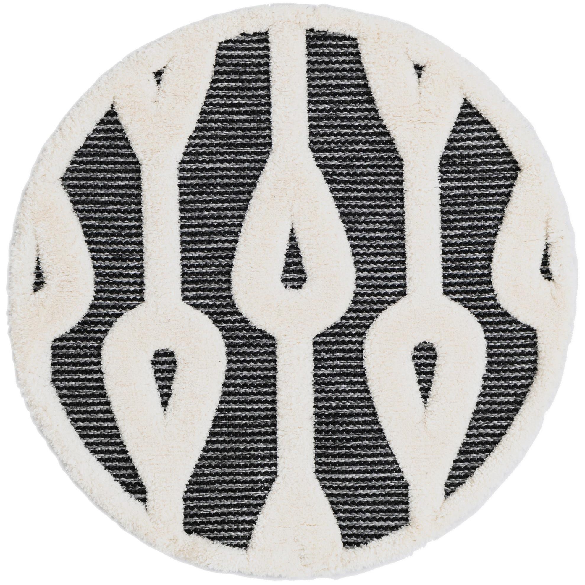 A 3' round gray and white rug with a bold, abstract geometric pattern, featuring a textured pile.