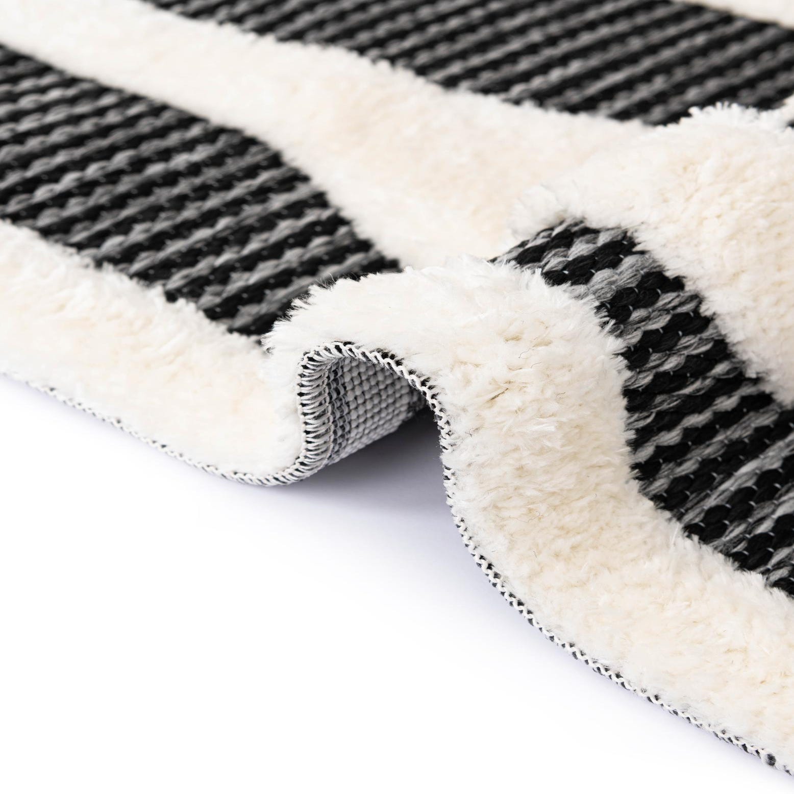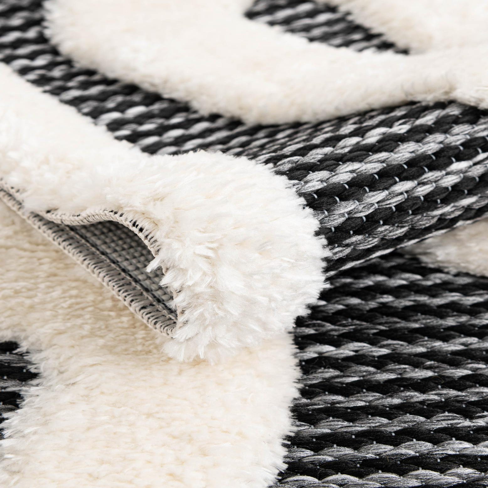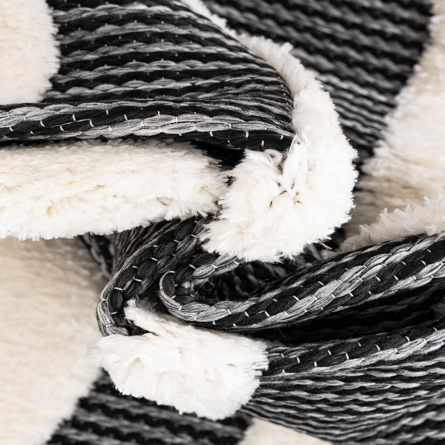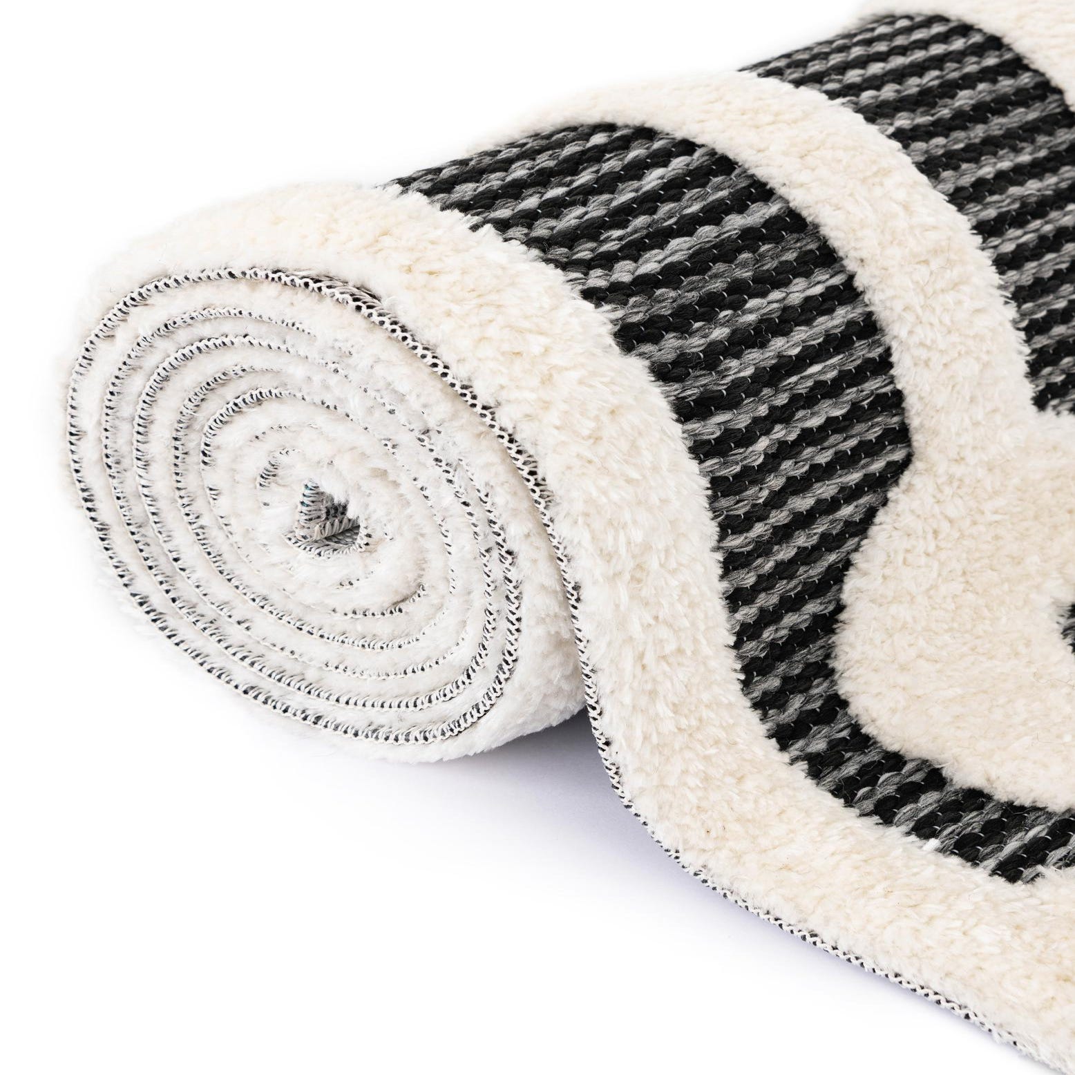 A 3' round gray and white rug with a bold, abstract geometric pattern, featuring a textured pile.