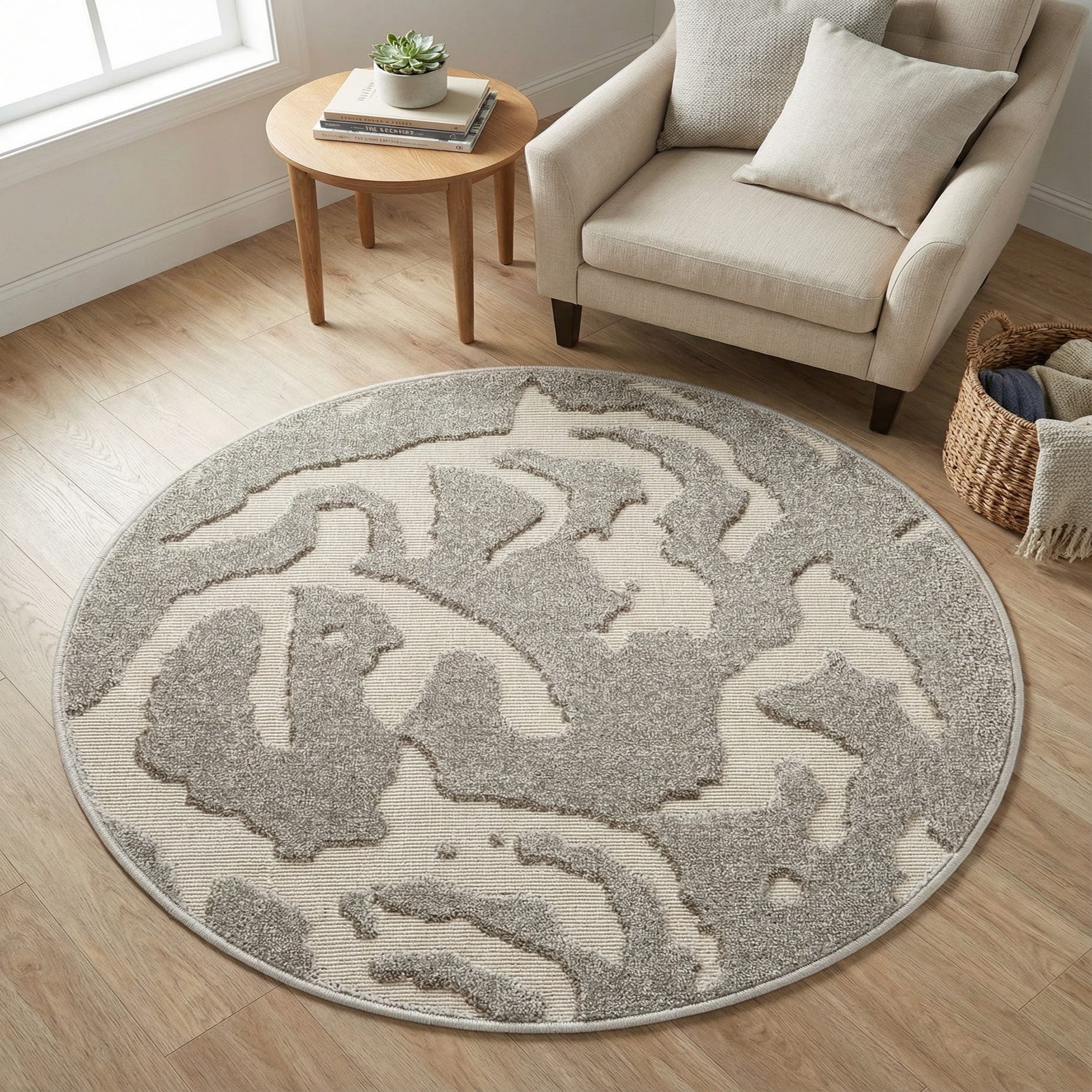 A 3' round gray and silver modern rug with an abstract, organic pattern, suitable for indoor or outdoor use.