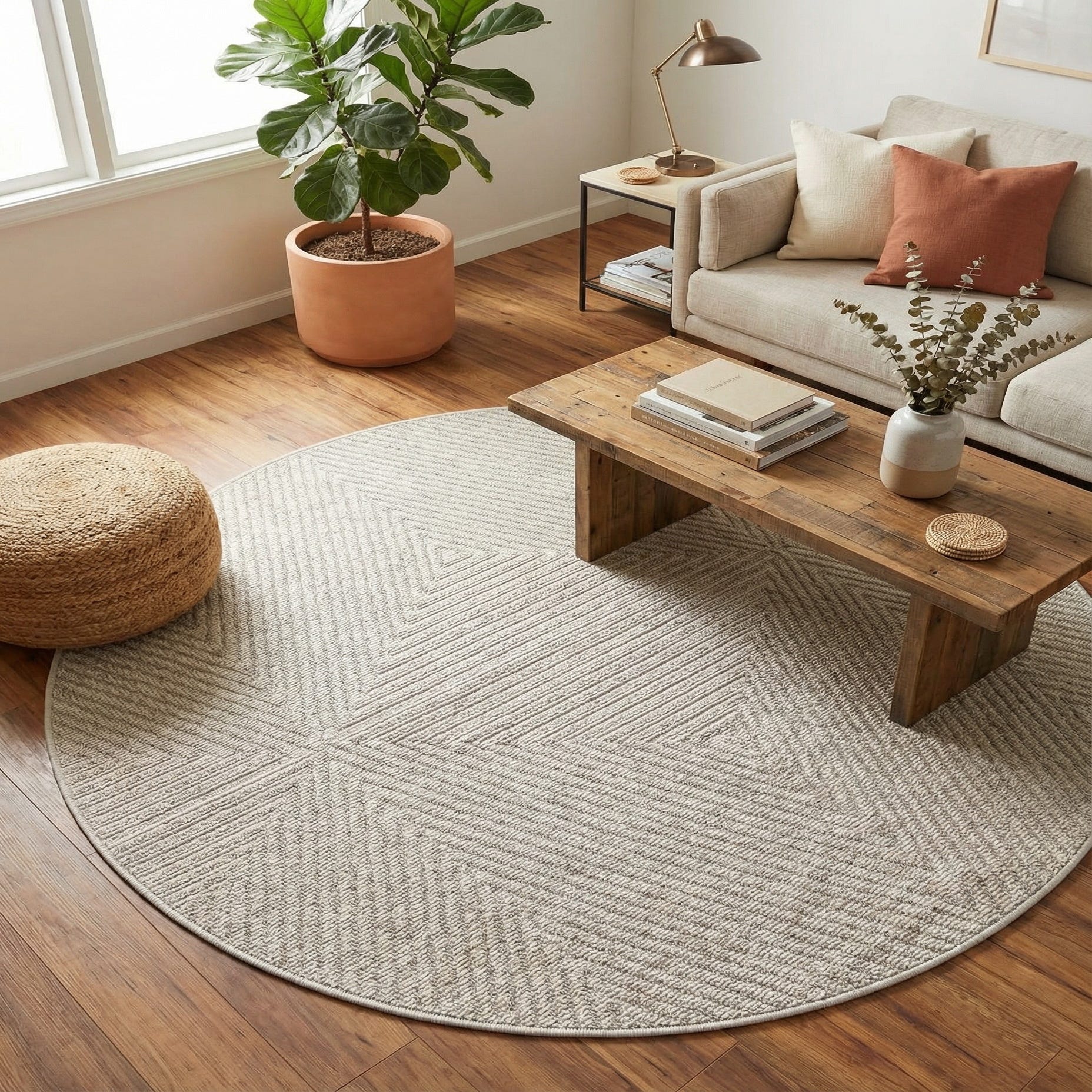 A 3' round gray modern rug with a textured geometric pattern of interlocking triangles and lines, suitable for indoor or outdoor use.
