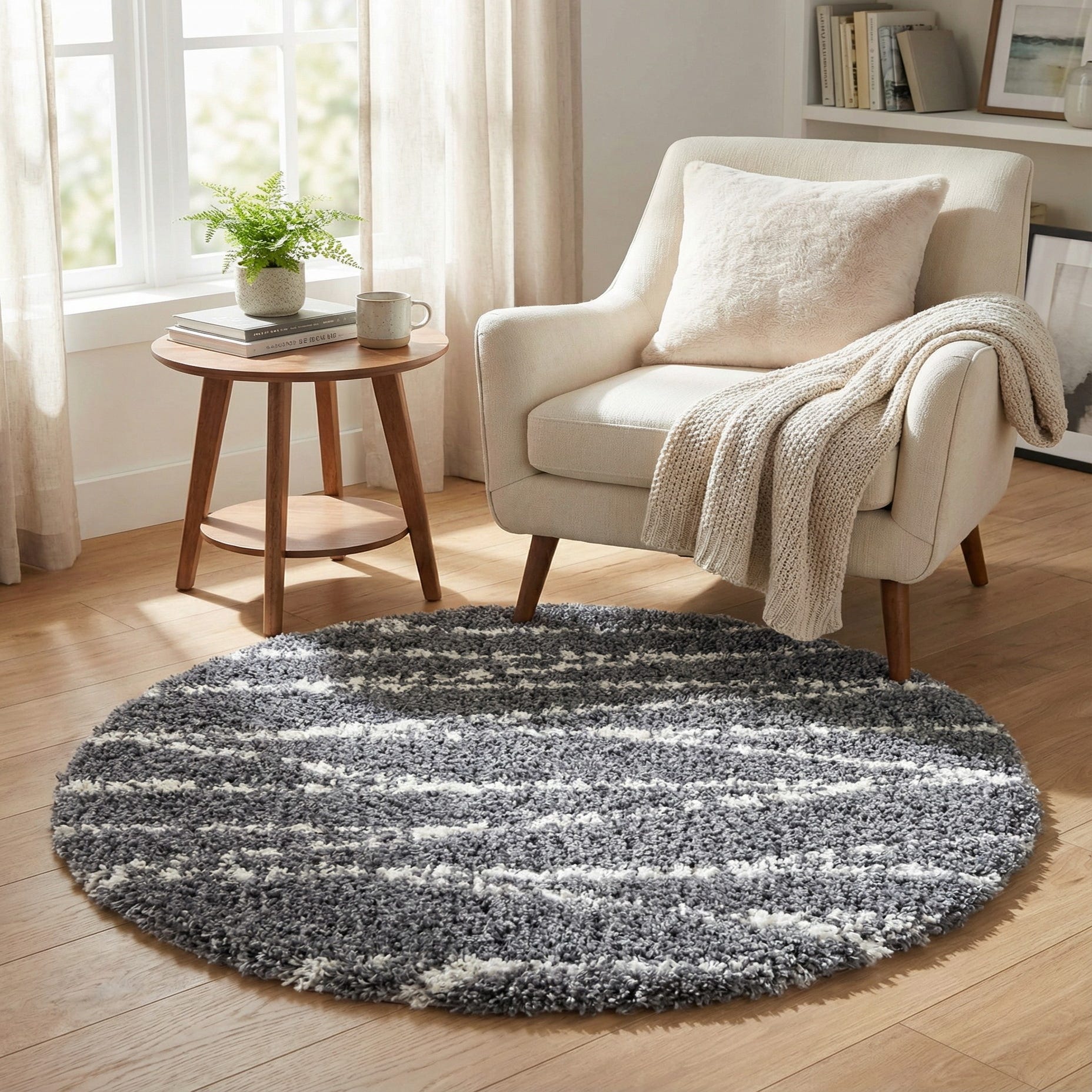The Serenity Shag Collection offers a contemporary 3 Ft Round rug crafted with machine-woven 100% polypropylene, ensuring durability and long-lasting visual appeal. This piece showcases a modern abstract pattern featuring dynamic linear strokes in ivory that stand out against a versatile gray background. The rug's deep shag texture invites a sense of warmth and comfort.