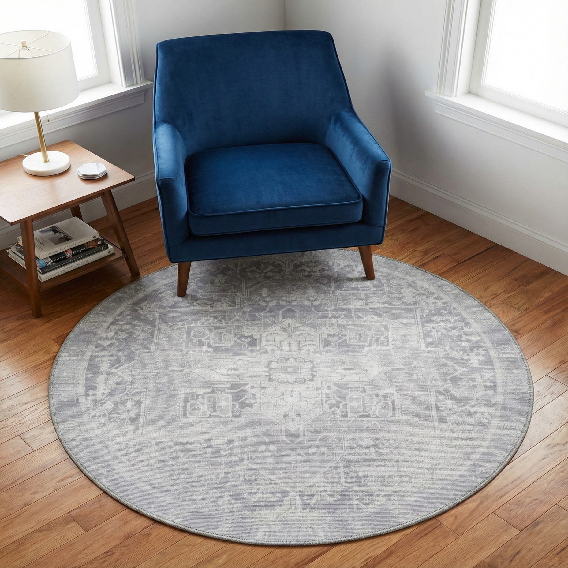 A soft gray ground hosts a faded medallion pattern worked in ivory, creating a refined, gently worn look that blends traditional motifs with a modern sensibility. The design pairs floral and geometric elements in a low-contrast, distressed finish that keeps the overall effect calm and understated. Machine-made from 100% polyester, the rug has a low pile with a smooth, slightly velvety hand that feels pleasant underfoot while maintaining a crisp pattern definition.