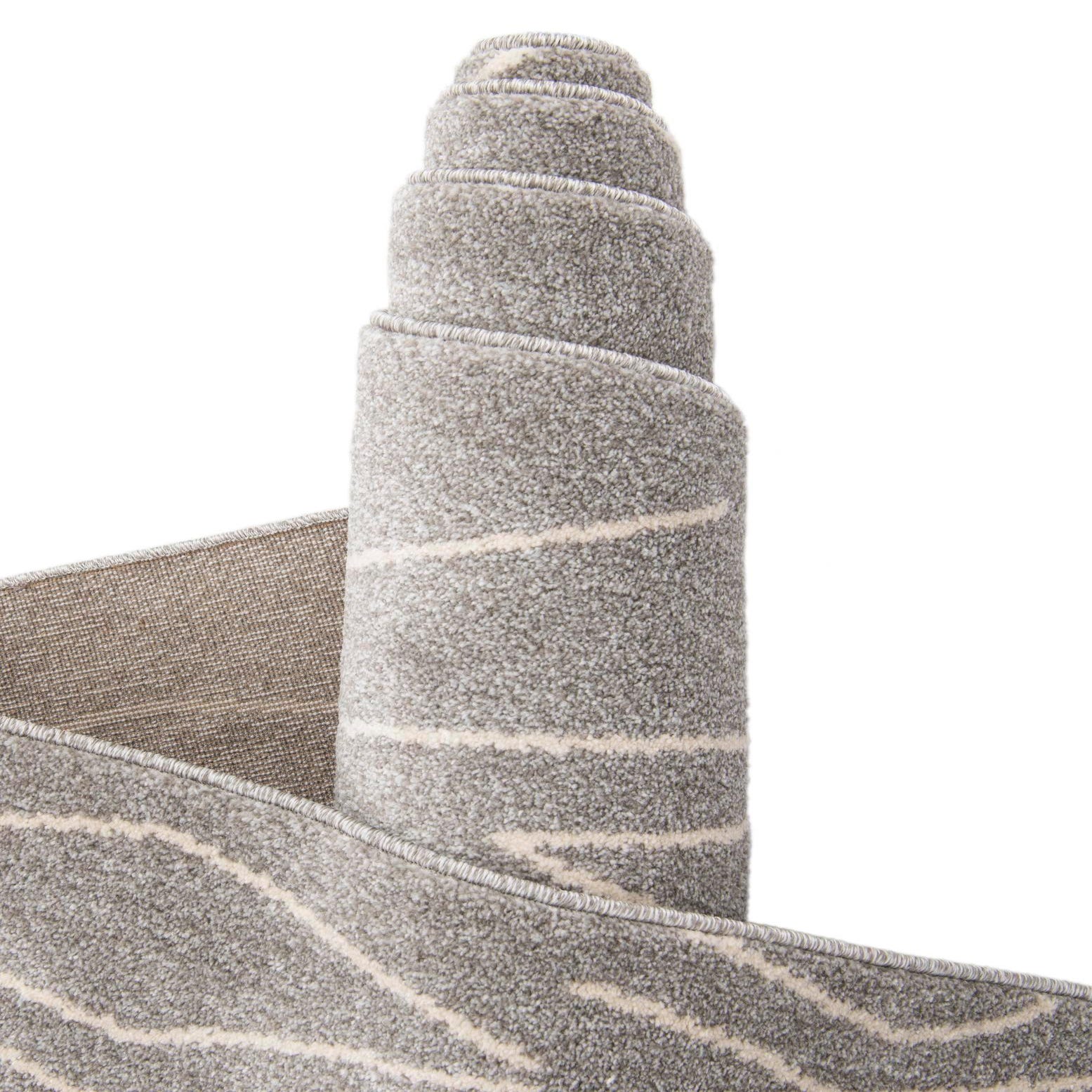 A soft gray field provides a calm backdrop for an all-over beige linear motif that forms elongated diamond and wave shapes across the surface. The repeating geometric pattern creates subtle movement while maintaining a refined, modern look. Machine-made from 100% polypropylene, the rug has a smooth, low-profile pile with a gentle, even hand and a muted textural contrast where the beige lines meet the gray ground.