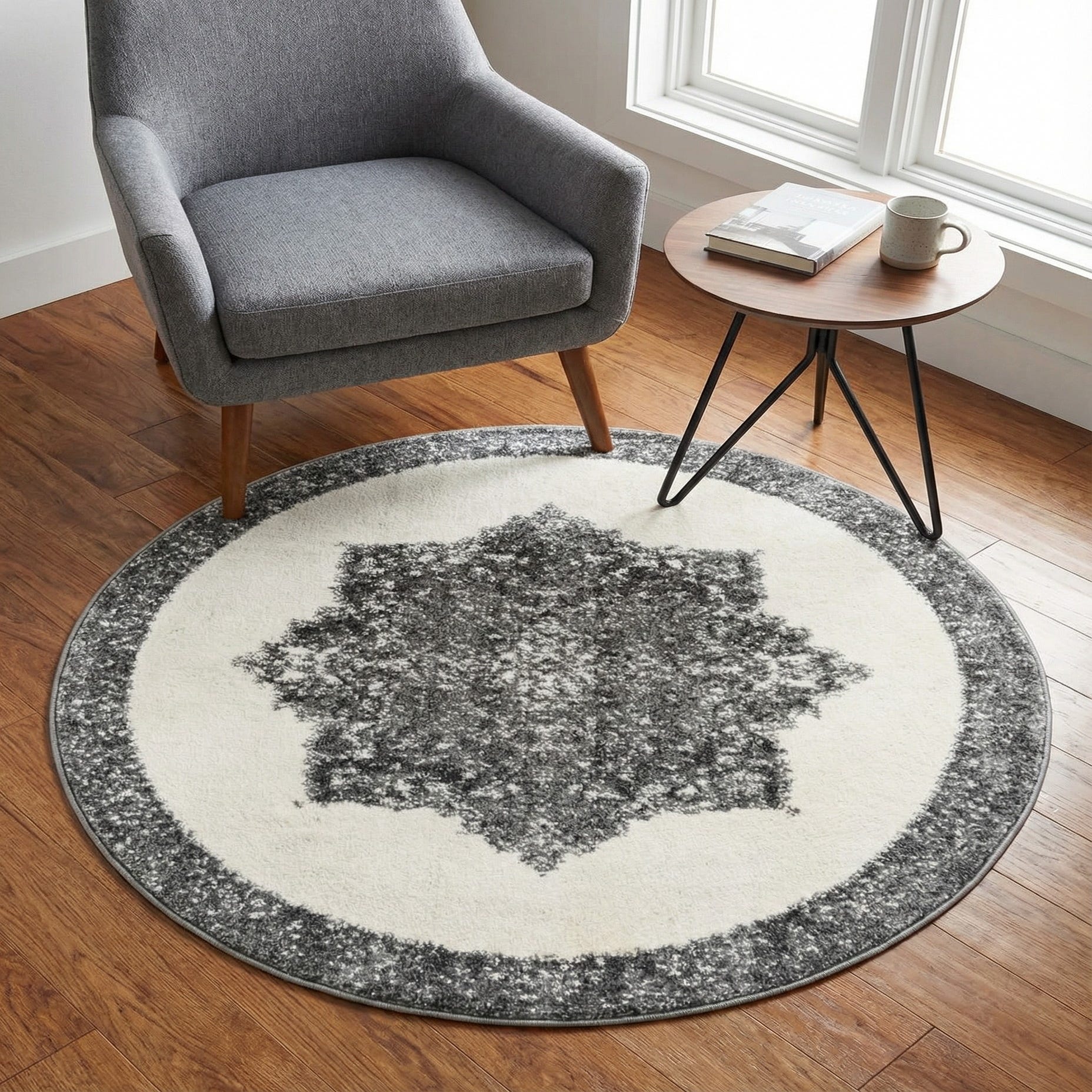 This round shape fits nicely in a small seating area, under a bistro or breakfast table, or placed at the foot of a bed to soften wood or tile floors. Its neutral gray and ivory palette pairs well with cool-toned furnishings, warm wood finishes, or metal accents, and it can be layered over a larger rug or used alone to anchor a compact space.