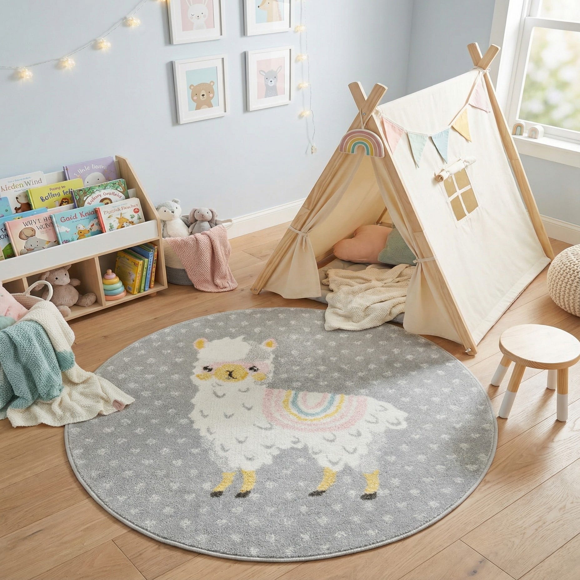 A playful round rug with a friendly llama motif centered on a soft gray field dotted with subtle ivory spots. The llama is rendered in ivory with delicate pink cheeks, a buttery yellow face and legs, and a pastel saddle of pink and light blue accents; small black details define the eyes and hooves. Machine-made from 100% polypropylene, the surface has a low-profile, softly tufted pile that feels gentle underfoot while keeping the illustrated design crisp and well-defined.