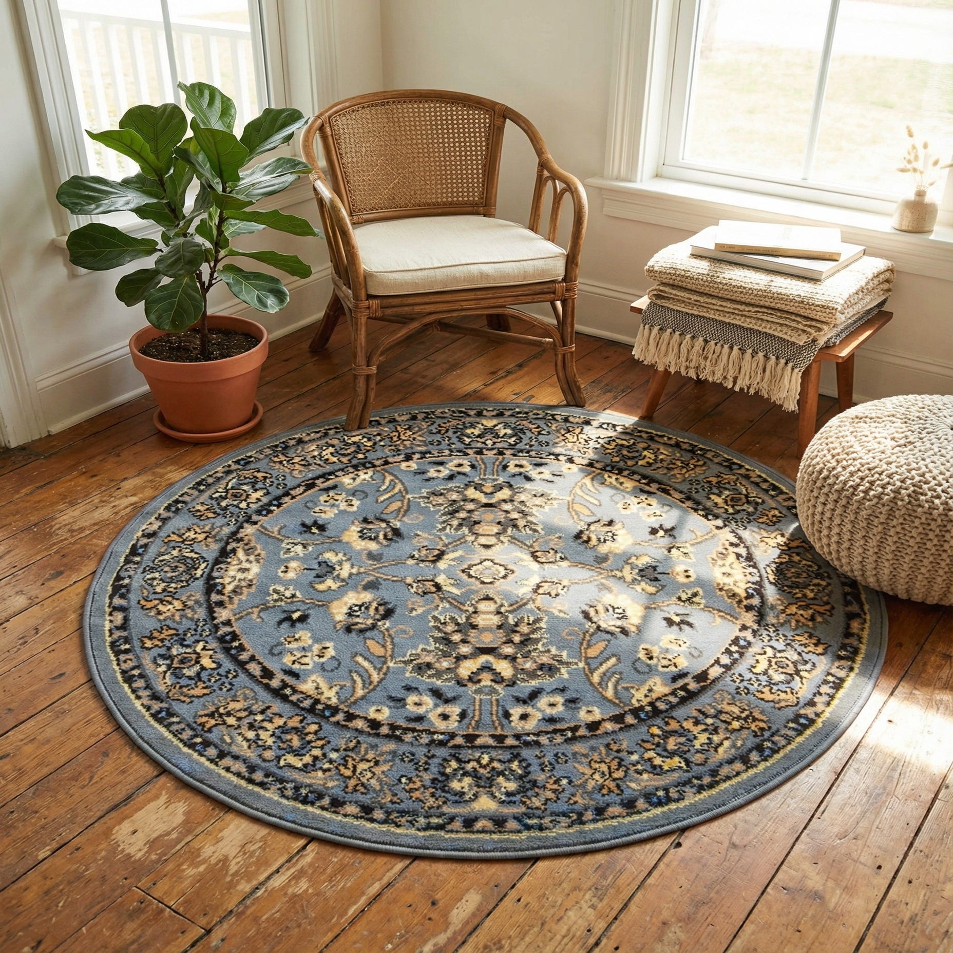 The round shape makes this piece ideal for anchoring a small dining nook, a cozy reading corner, or the entryway of a bedroom. Its traditional pattern and neutral gray palette pair well with warm wood finishes, brass or black metal accents, and layered textiles, working equally well in classic, transitional, or cottage-inspired interiors. The muted tones help ground brighter furnishings while the detailed motif adds a refined focal point without overpowering the room.
