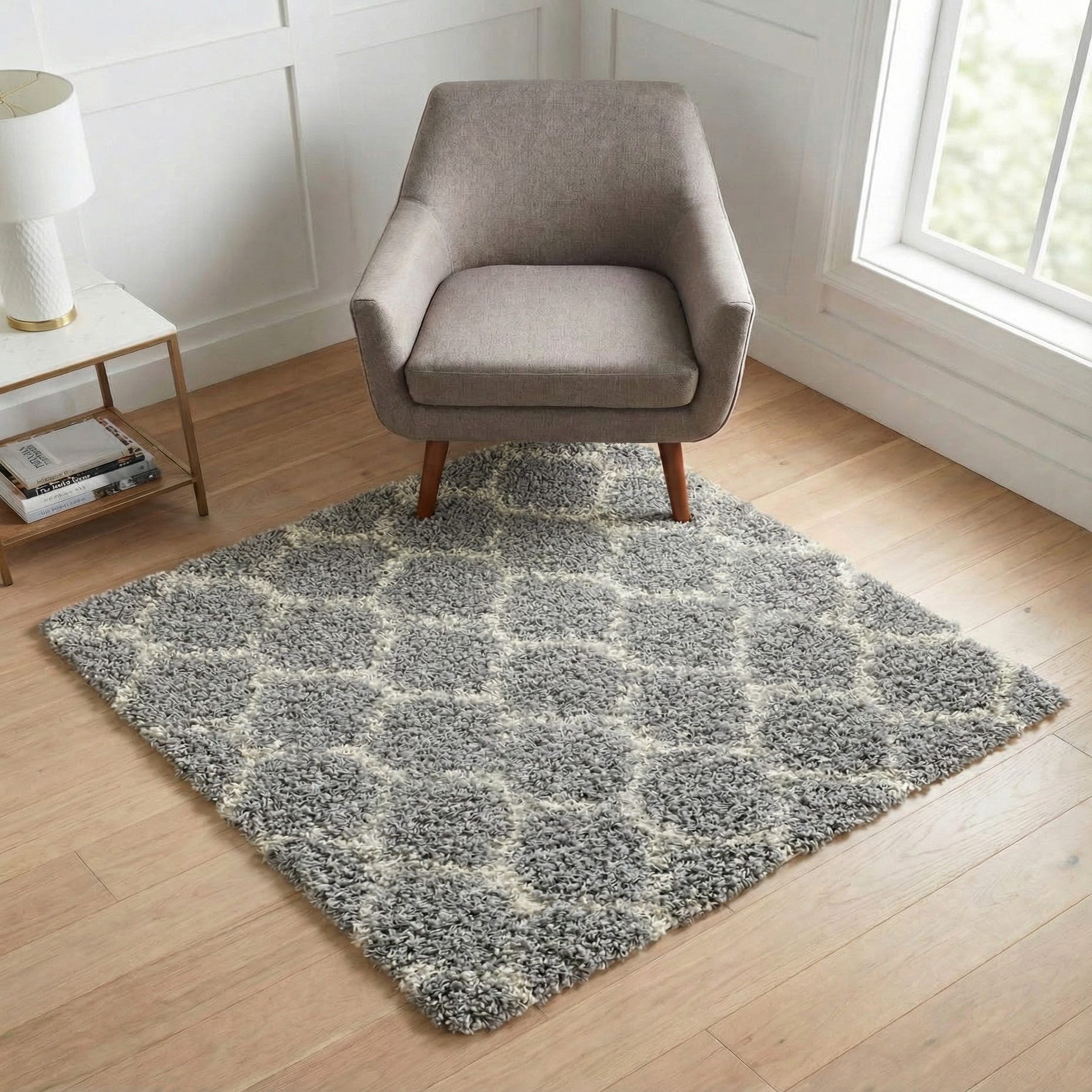 Plush, machine-made shag in 100% polypropylene creates a deep, cushiony surface that invites you to sink your feet in. The gray background provides a neutral, contemporary base while an ivory lattice forms a repeating diamond pattern across the pile, adding subtle geometric interest without overwhelming the room. The long, slightly twisted fibers give the rug a textured, tactile quality—soft to the touch with a gentle, shaggy profile that adds warmth and dimension to a floor.
