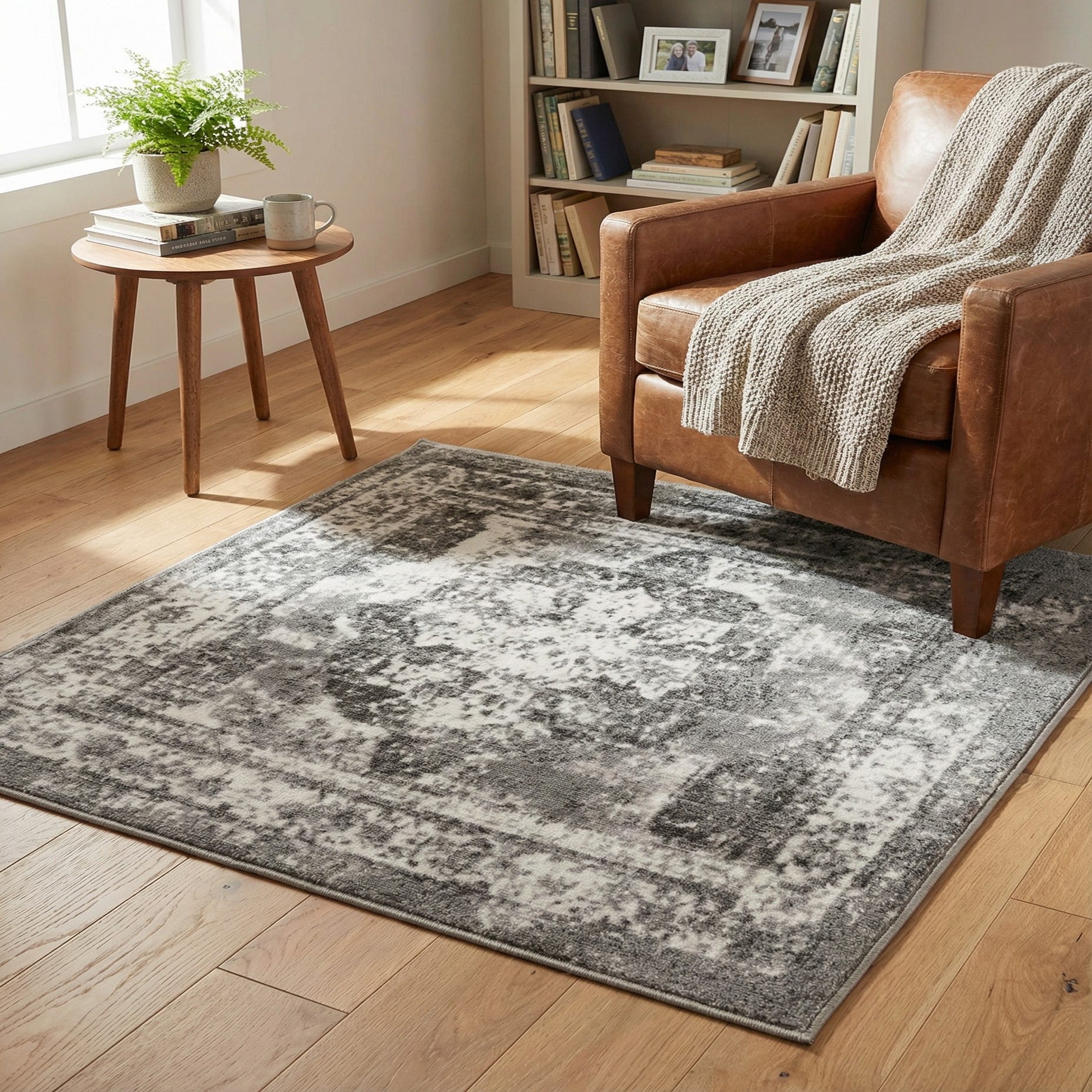 A softly distressed medallion pattern gives this rug a quietly traditional look with a modern update. The background is gray, while worn beige highlights define the central floral-inspired medallion and the surrounding rectangular border. The overall effect reads like a vintage find that’s been gently faded over time, with mottled tonal variations that add visual depth without overwhelming a room. The surface feels low-profile and smooth to the touch, with a subtle sheen where the polypropylene fibers catch the light.