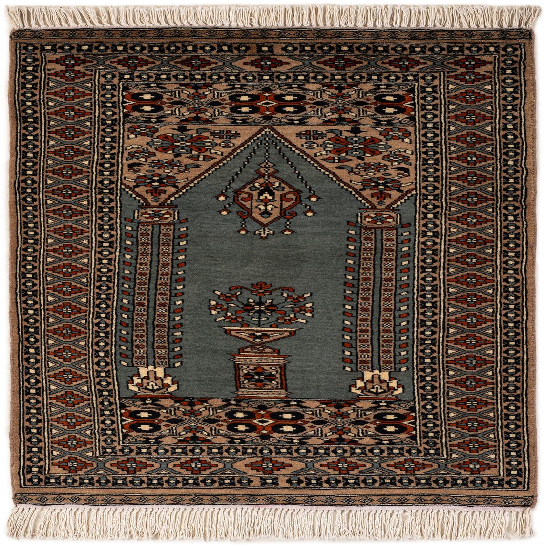 A 3x4 rectangular gray Bokhara wool rug with a traditional Oriental tribal pattern and decorative fringe.