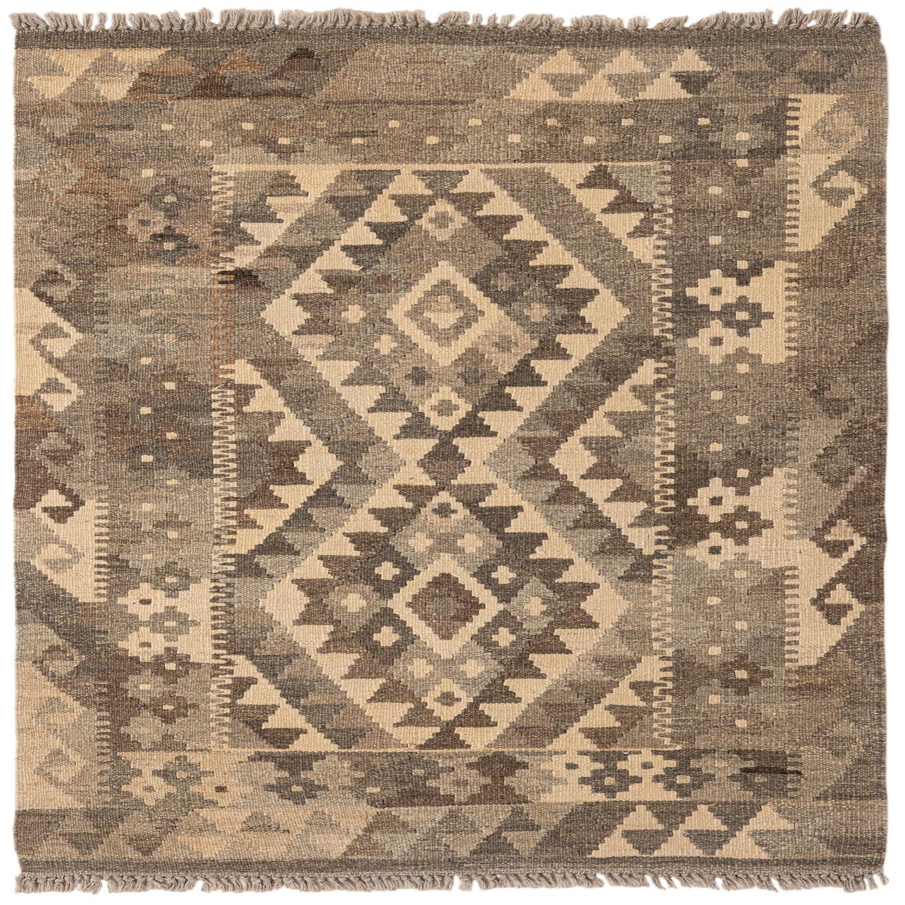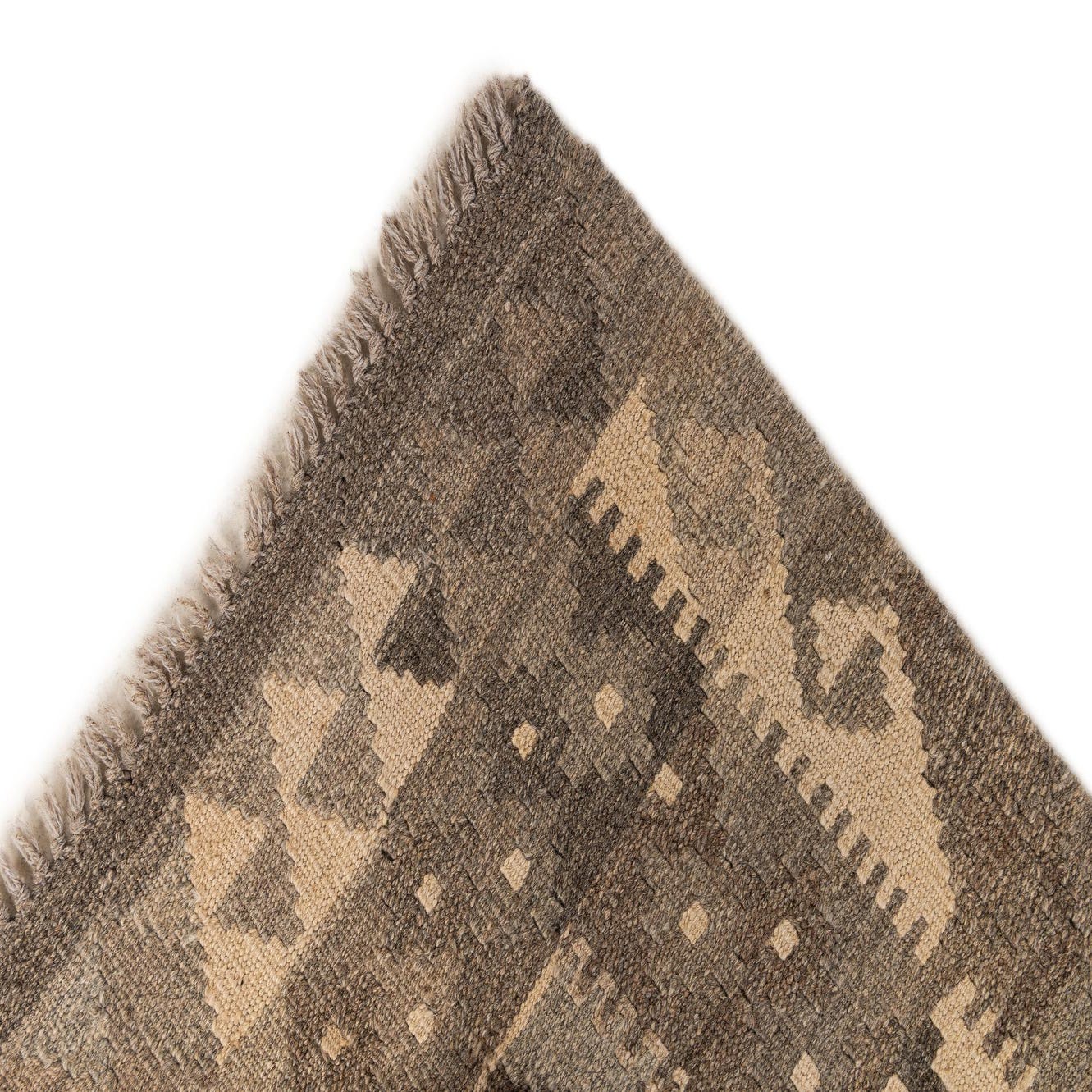 A 3x4 rectangular Kilim Maymana rug featuring a tribal geometric pattern in varying shades of gray and beige, with a flatweave texture.