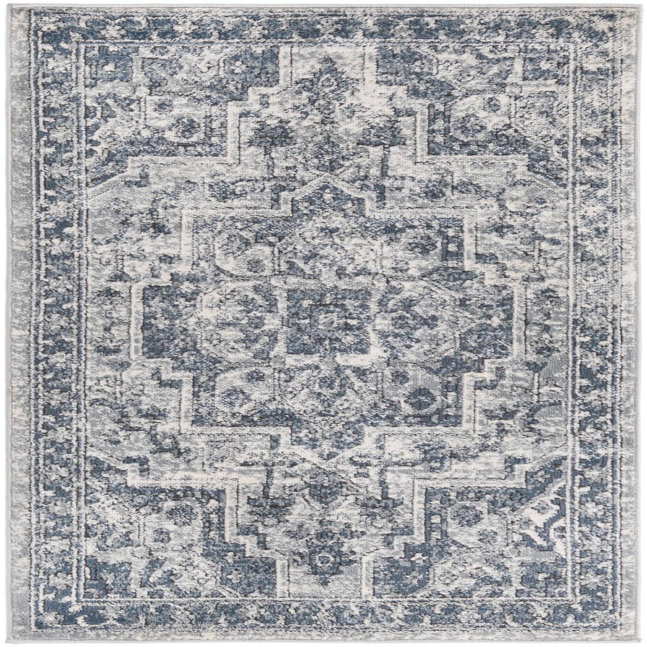 Primary color is Gray. Colors in this rug include: Gray, Blue, Ivory, Navy Blue, Light Blue.