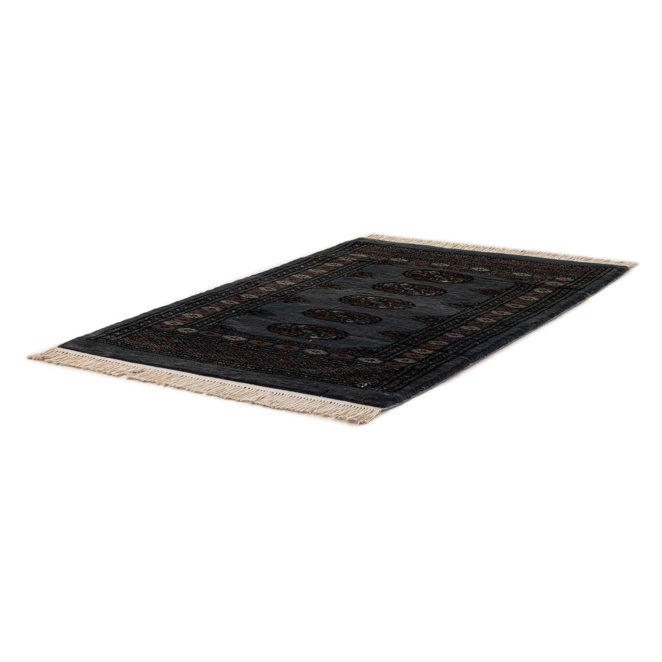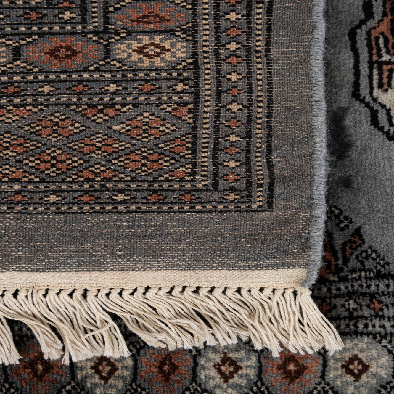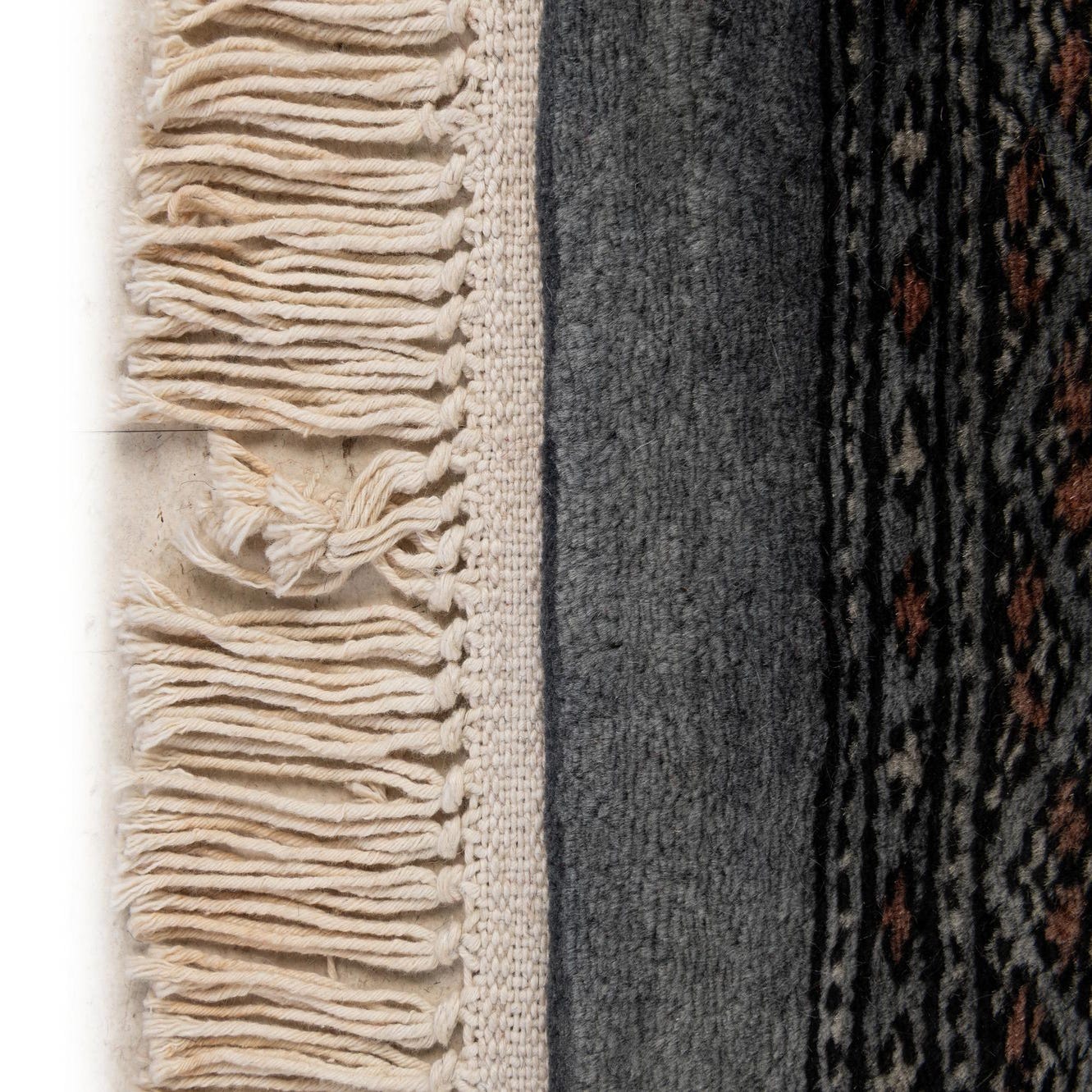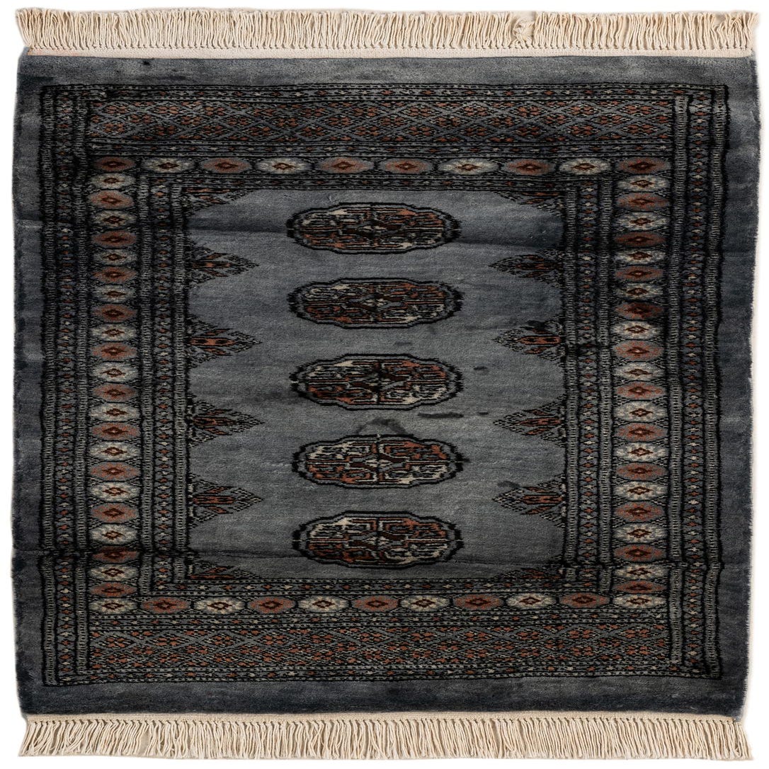 A 3x4 rectangular gray wool rug with a traditional Oriental pattern and fringe, ideal for indoor spaces.