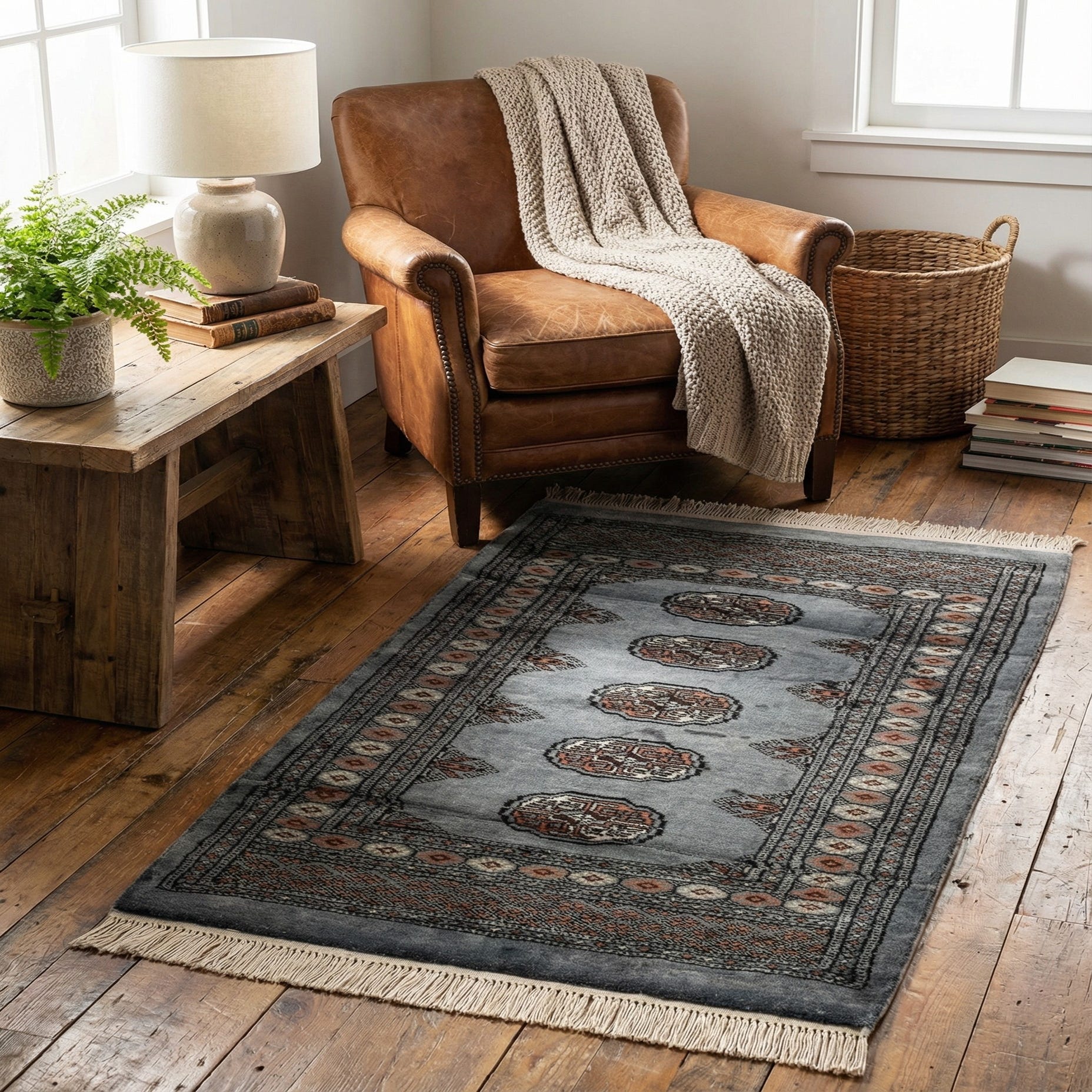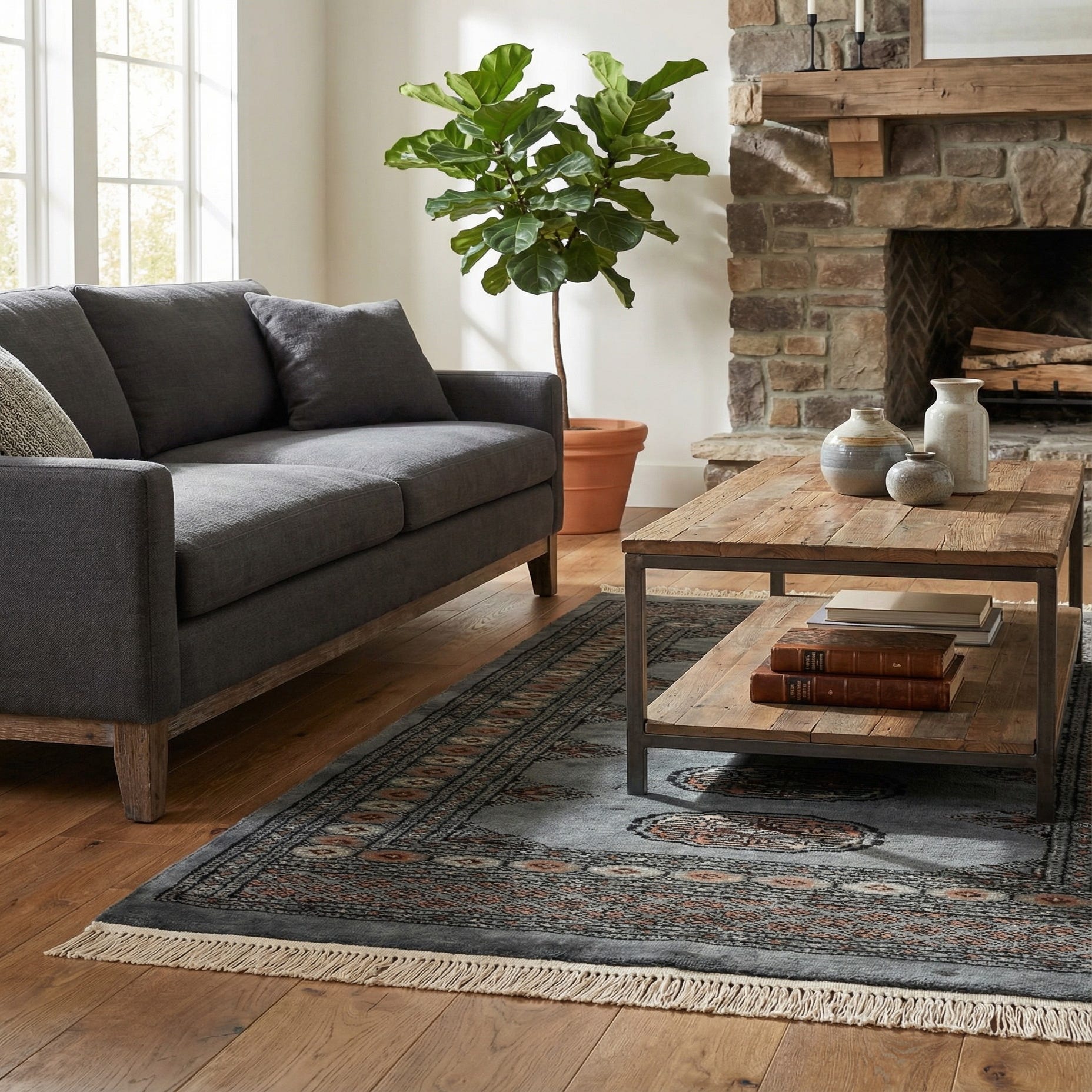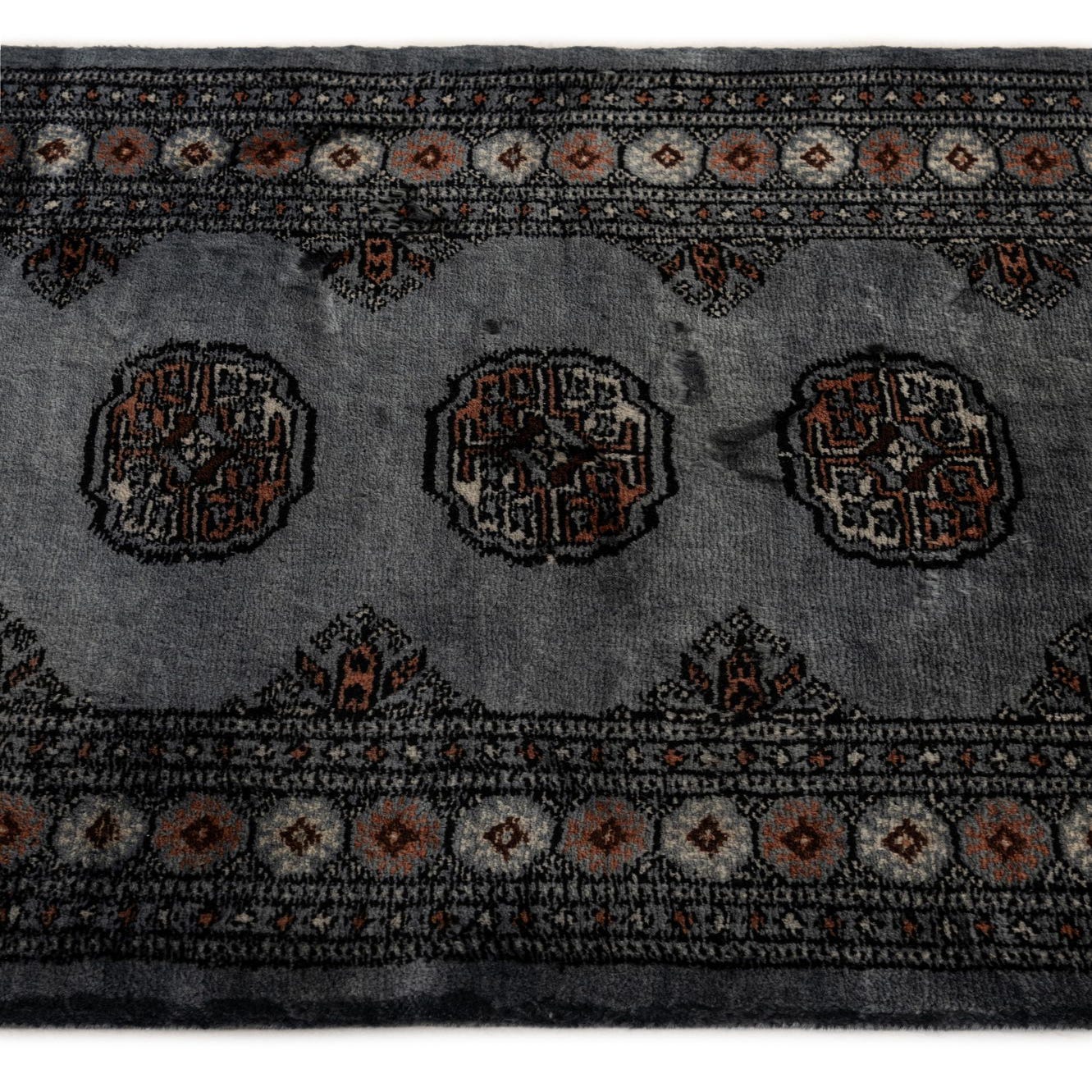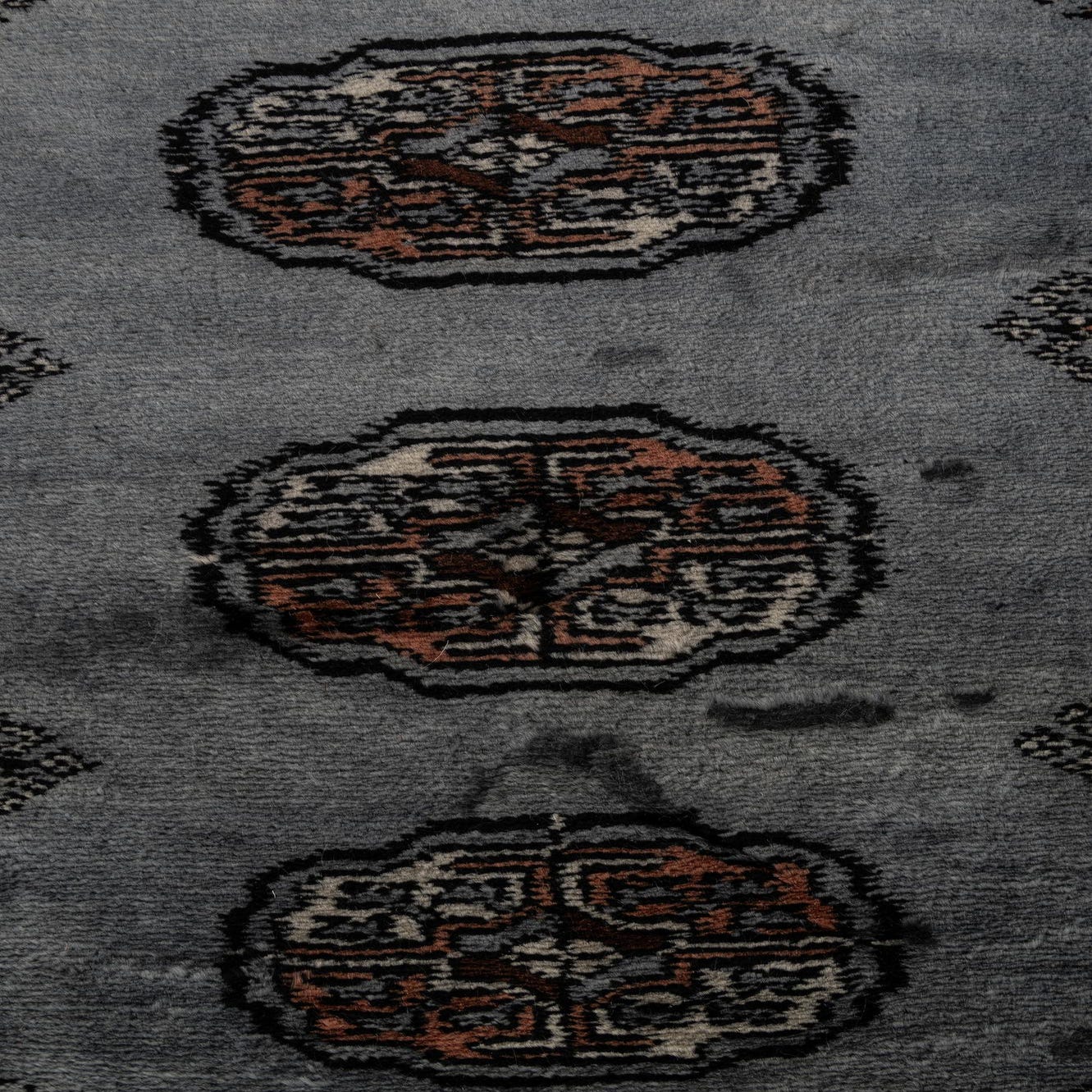 A 3x4 rectangular gray wool rug with a traditional Oriental pattern and fringe, ideal for indoor spaces.