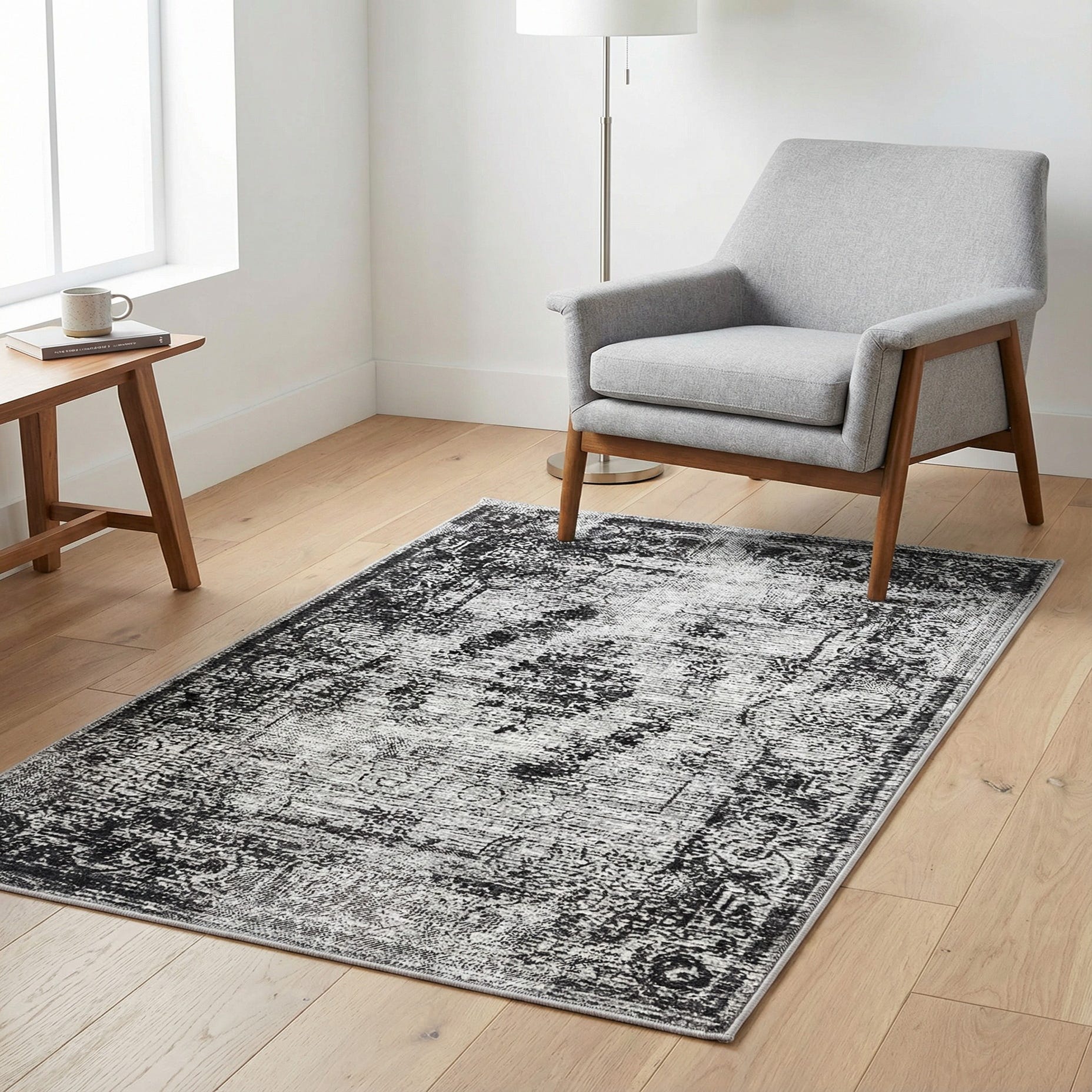 This versatile piece works well in contemporary, transitional, or modern farmhouse schemes — use it to ground a neutral living room grouping, add quiet pattern to a hallway or entry, or soften a home office without competing with furnishings. Pair it with light- to medium-toned woods, matte metal accents, and ivory or charcoal textiles to highlight the rug’s gray-and-ivory palette.