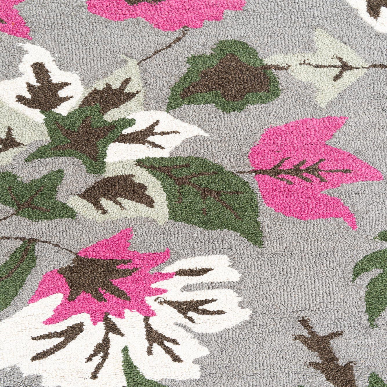 The Agra collection presents a hand-tufted wool and cotton rug, sized at a versatile 3x5, that showcases a vibrant floral pattern with a contemporary flair. The gray background provides a neutral canvas for the lush botanical design, featuring colors such as green, ivory, pink, olive, and additional gray tones that bring the imagery to life. The contrast between the vivid pink blooms and the more subdued olive and green leaves creates a visual interest that is both charming and sophisticated.