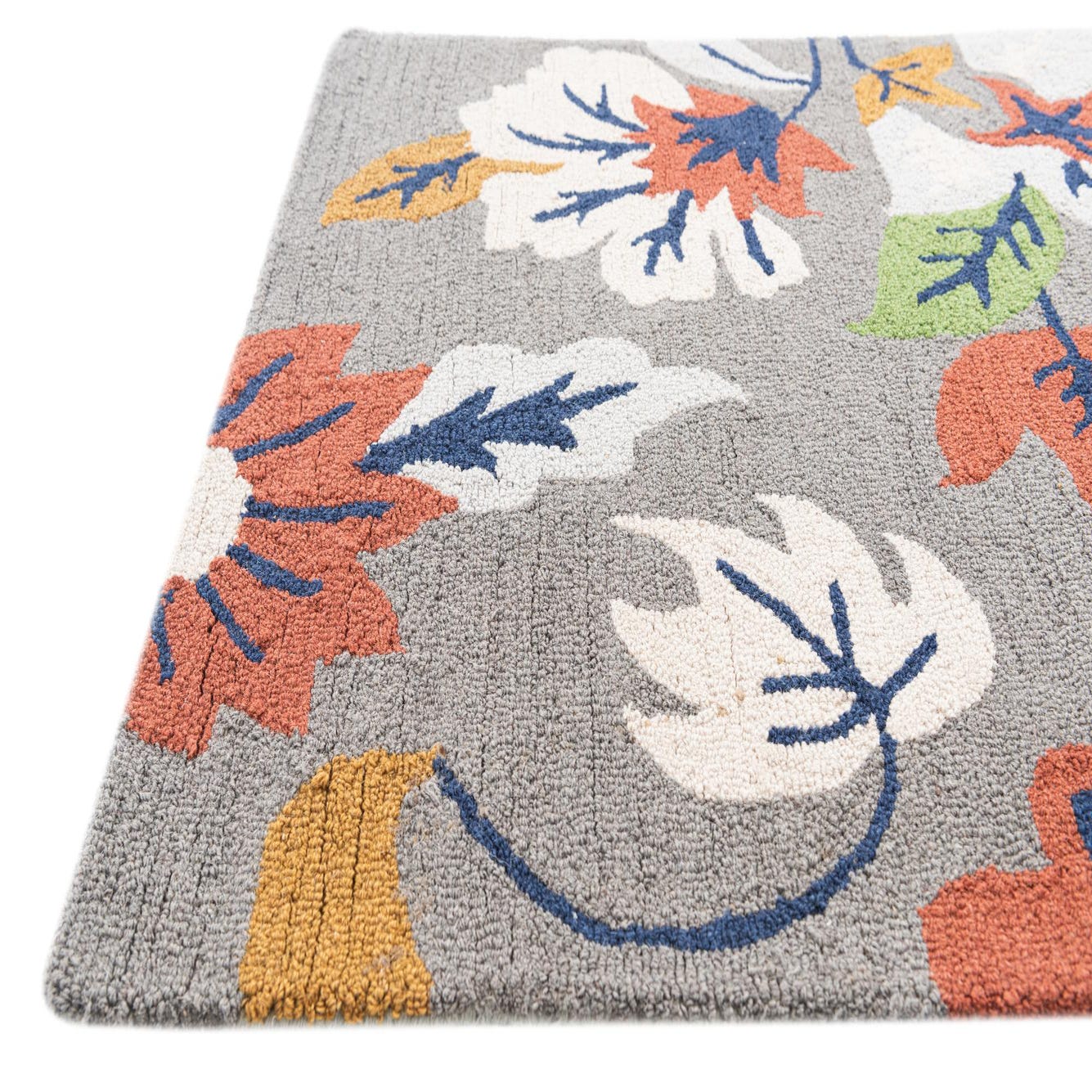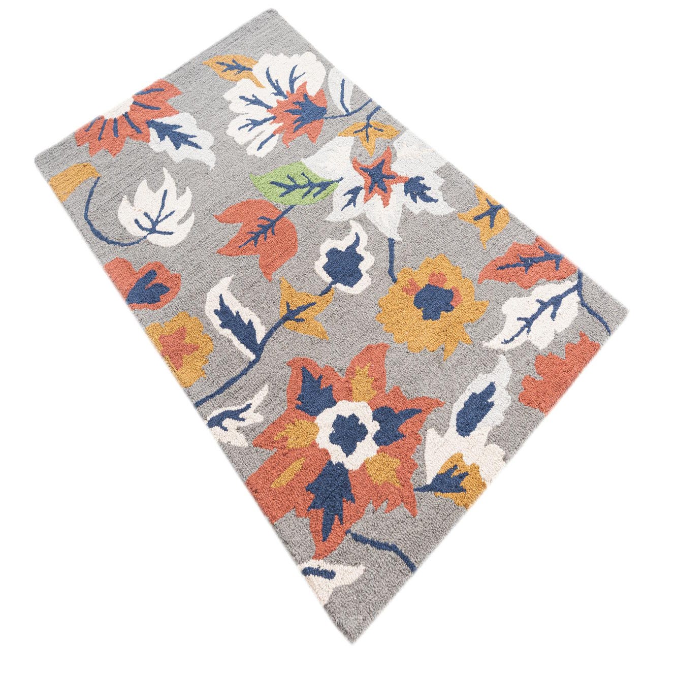 A 3x5 rectangular gray rug with a modern floral pattern in rust, mustard, navy, green, and cream, suitable for indoor use.