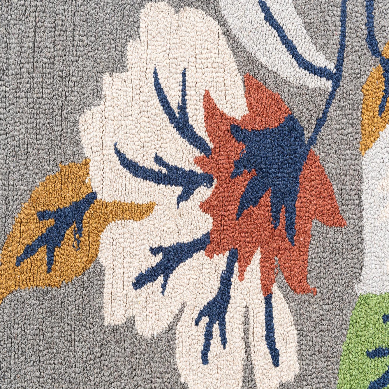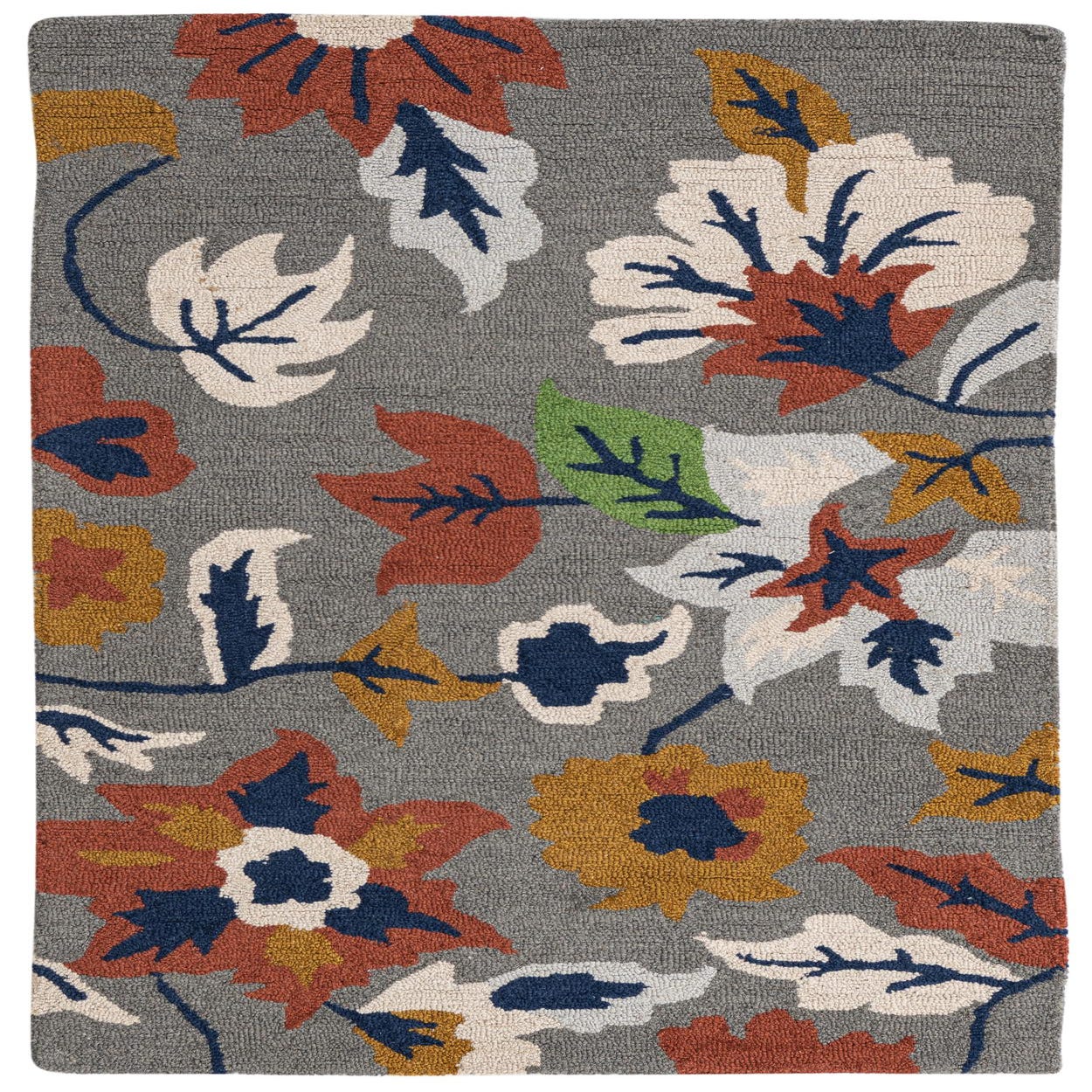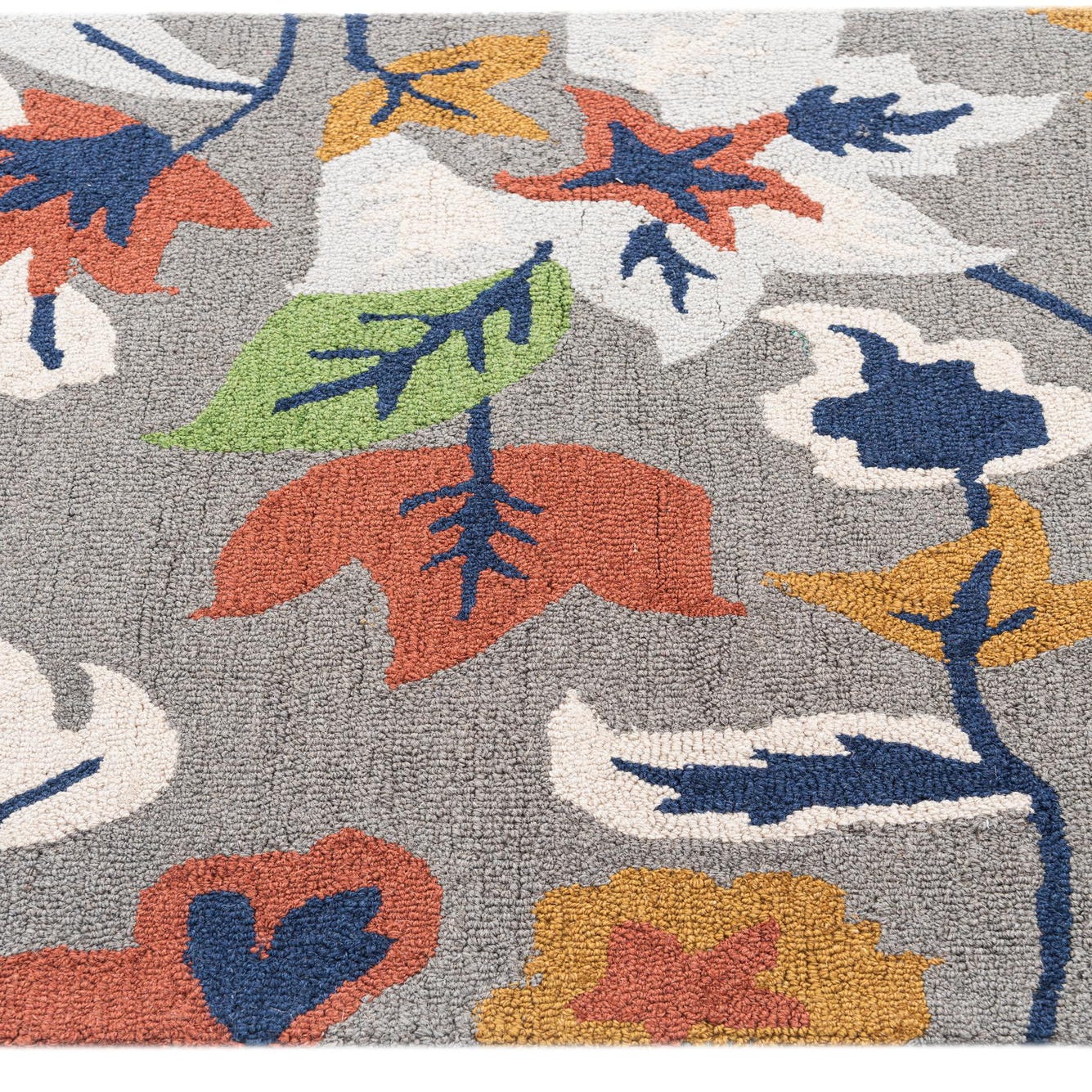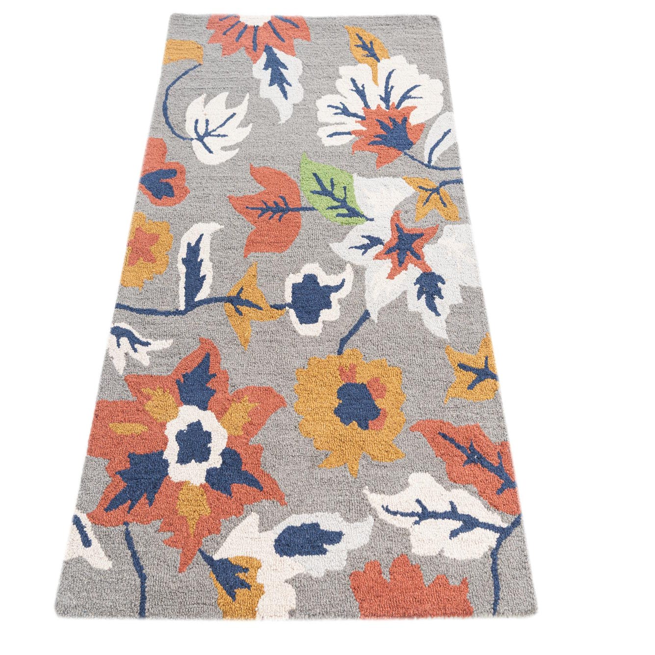 From the Agra collection, this 3x5 hand-tufted rug is a blend of wool and cotton, offering a plush, comfortable texture underfoot. The rug features a dynamic botanical pattern composed of stylized flowers and foliage. Its color palette includes shades of gray, brown, navy blue, terracotta, ivory, gold, and green, all set against a versatile gray background that anchors the design.