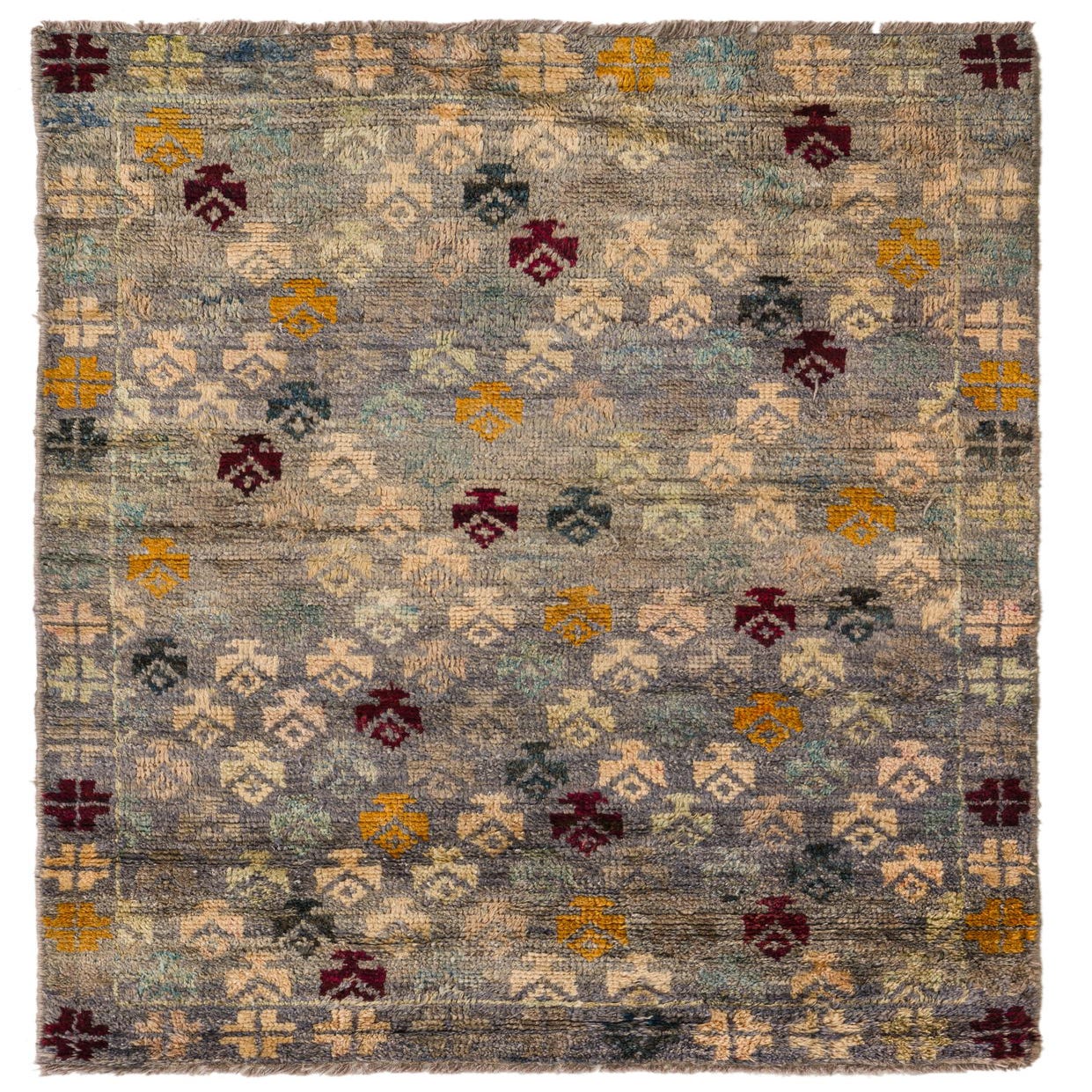 A 3x5 rectangular Balouch tribal rug featuring a gray background with multicolored geometric patterns in yellow, maroon, and cream.