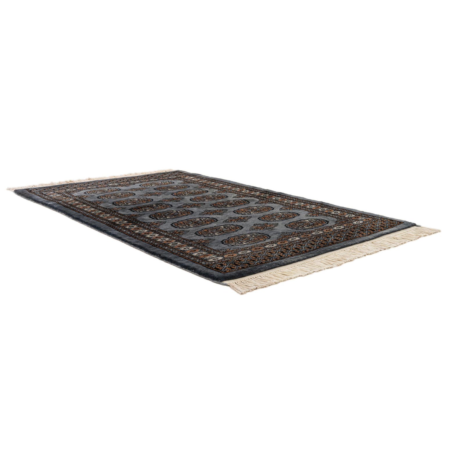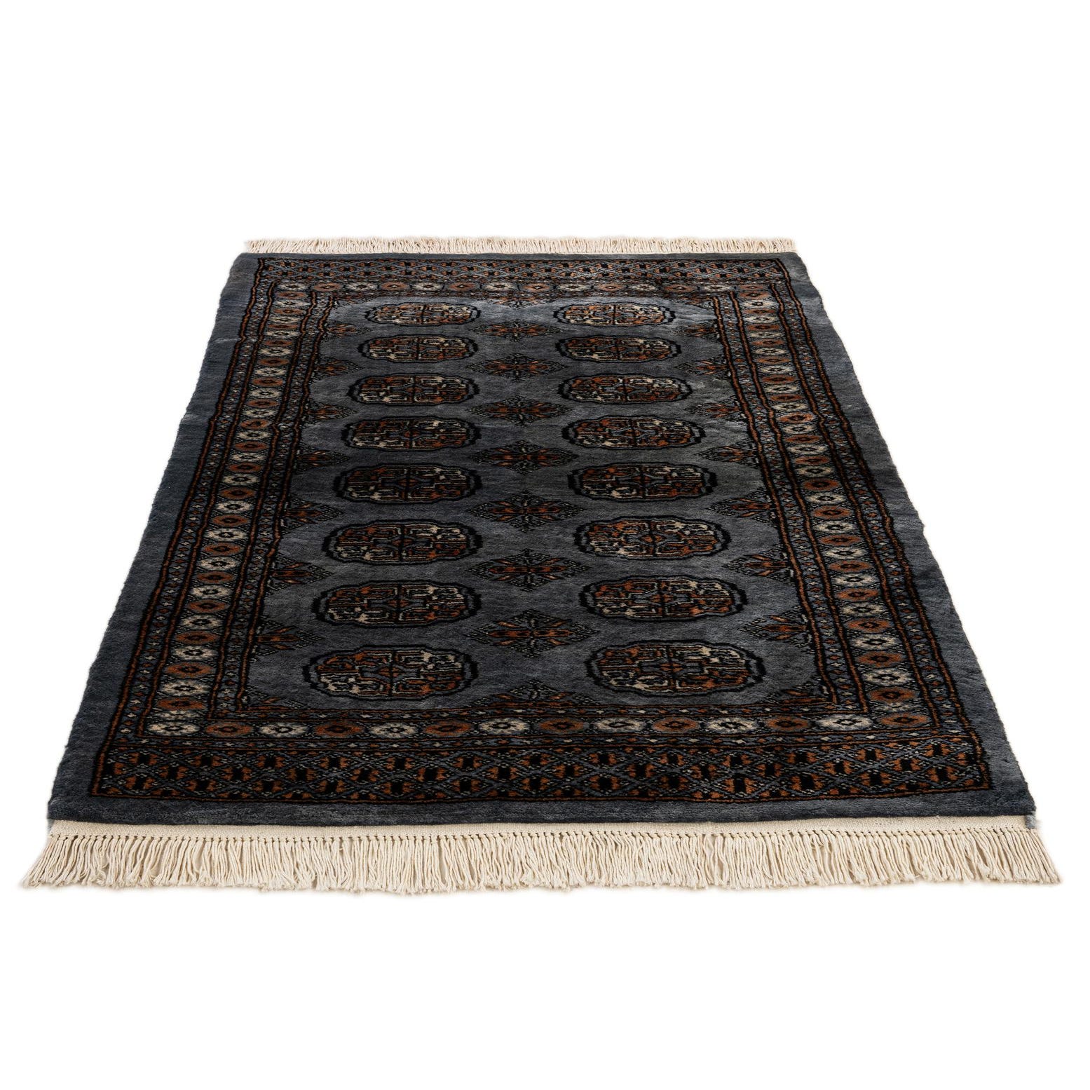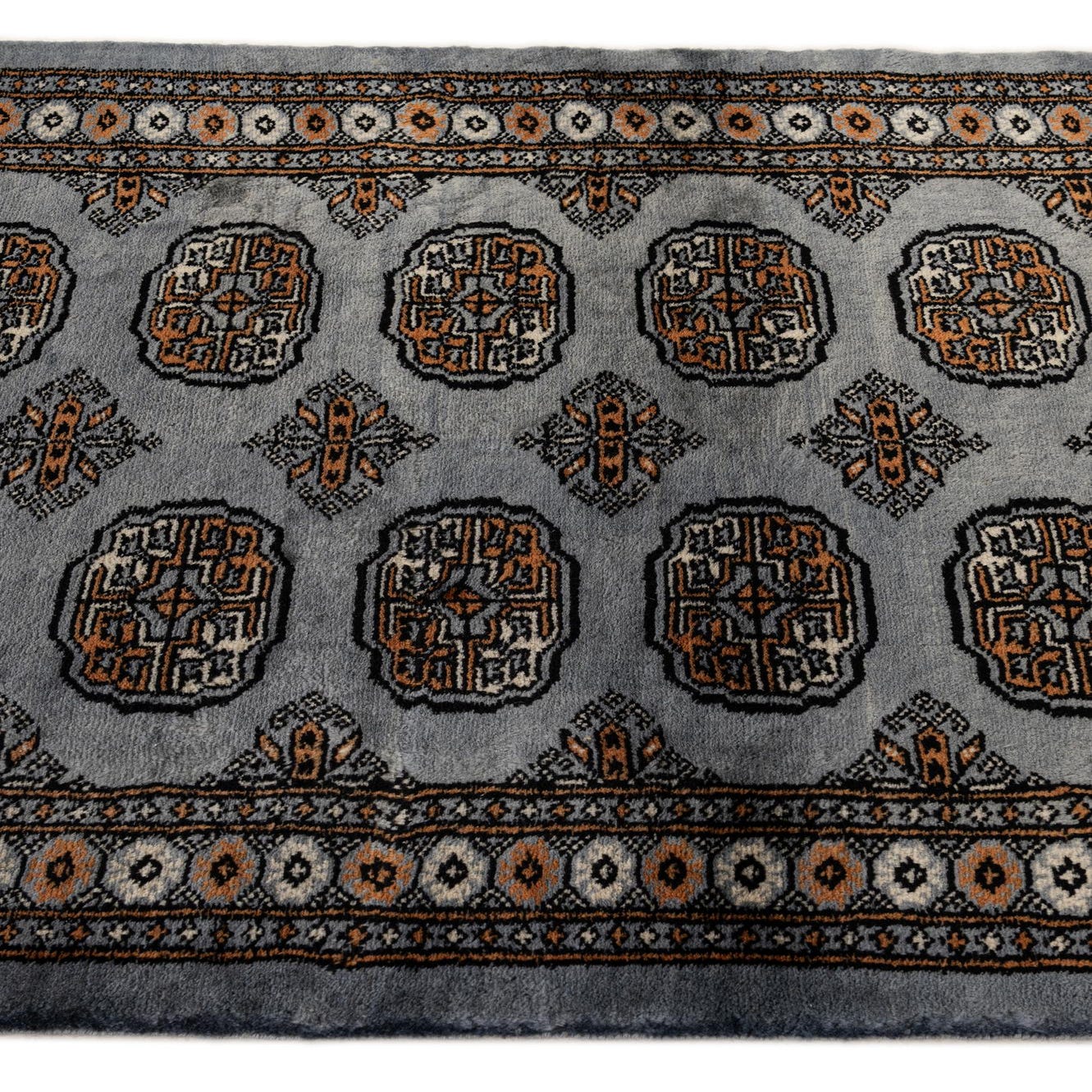 A 3x5 rectangular Bokhara rug in shades of gray and silver, featuring a tribal oriental pattern with intricate medallions and a fringed edge, suitable for an entryway.