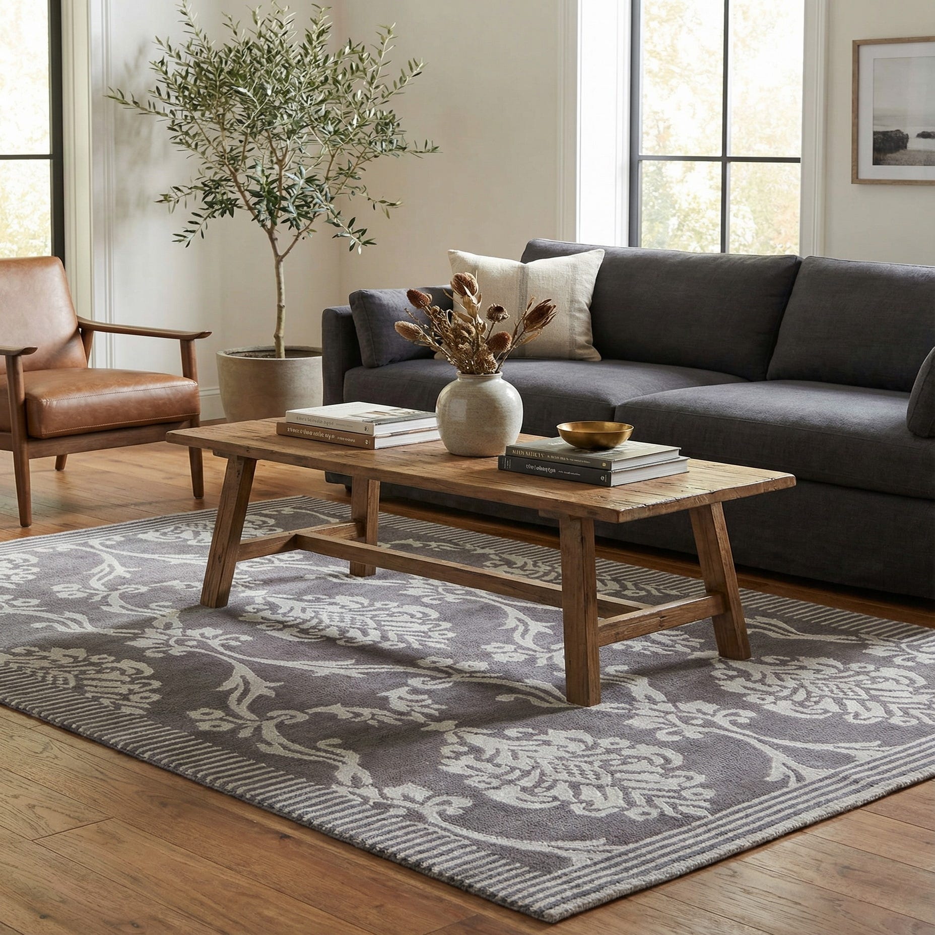 The Darya collection presents a sophisticated 3x5 hand-knotted rug crafted from 100% wool, ensuring both durability and softness underfoot. This rug showcases an elegant damask pattern, articulated through a harmonious blend of gray and silver hues, set against a gray background that offers both versatility and a serene aesthetic. The ornate design is intricately detailed, inviting closer inspection and appreciation of its craftsmanship.