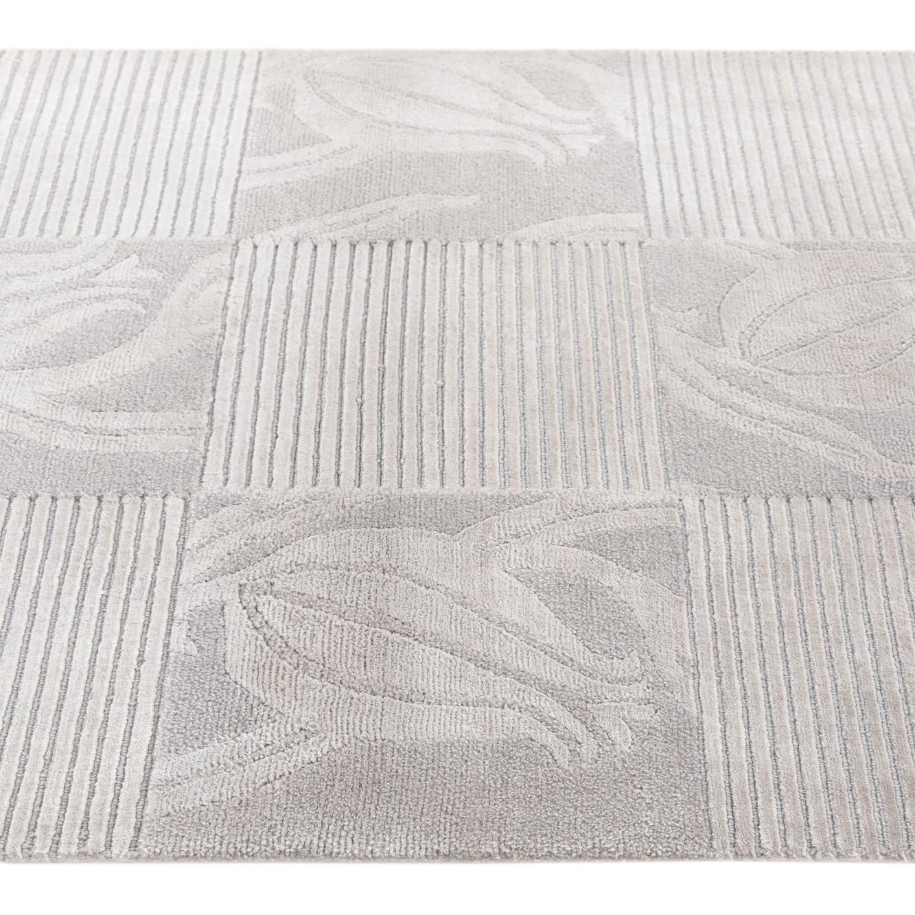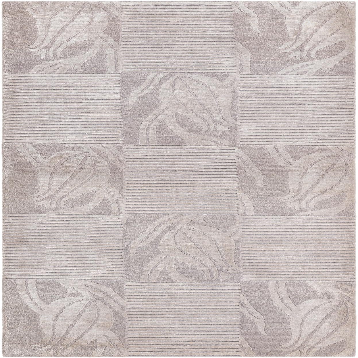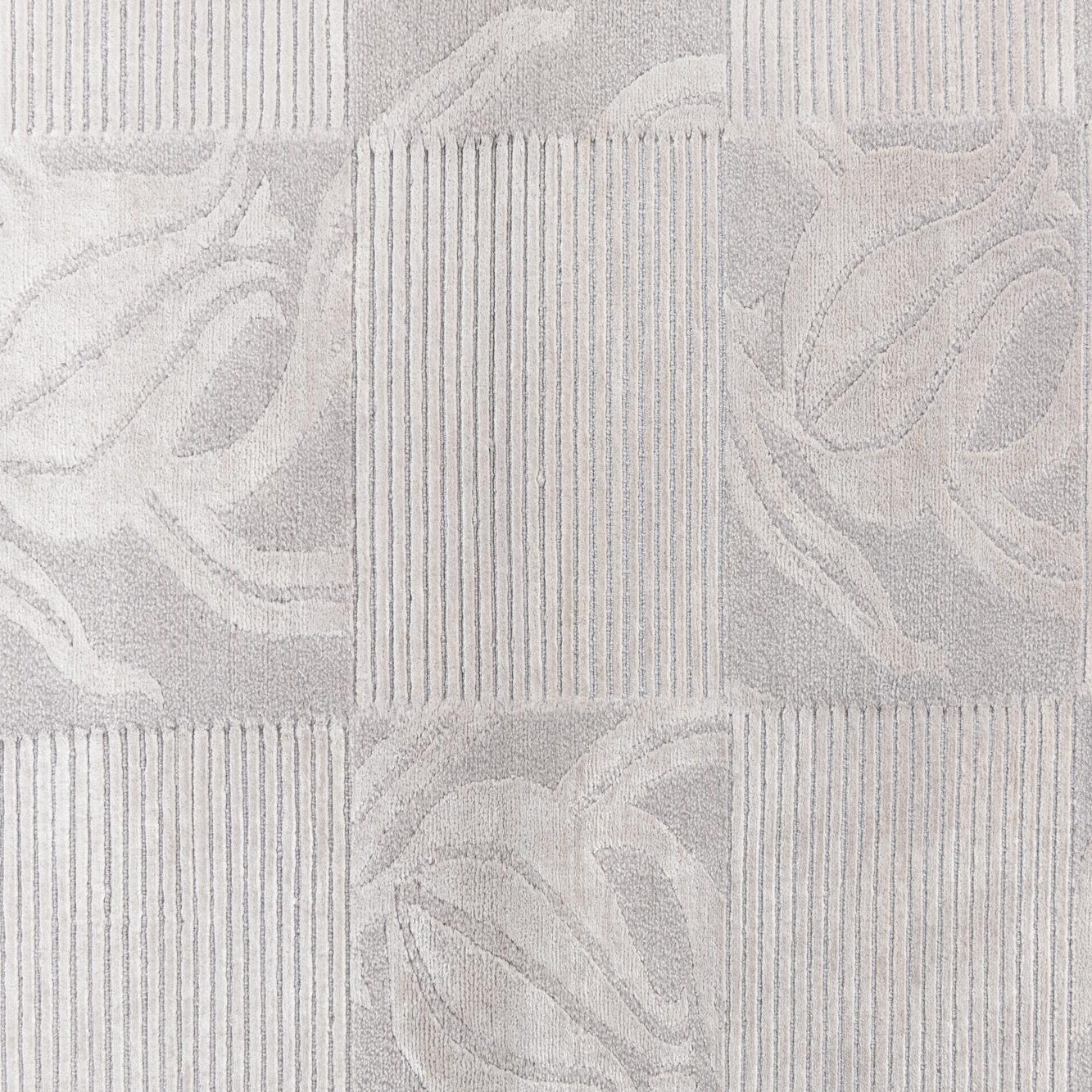 The Darya collection presents a sophisticated 3x5 hand-knotted rug crafted from 100% wool. This piece features a balanced pattern with blocks that alternate between a textured stripe design and elegant botanical motifs, creating a compelling visual and tactile contrast. The background color is a versatile gray, enriched with softer silver tones that define the intricate leaf-like designs.