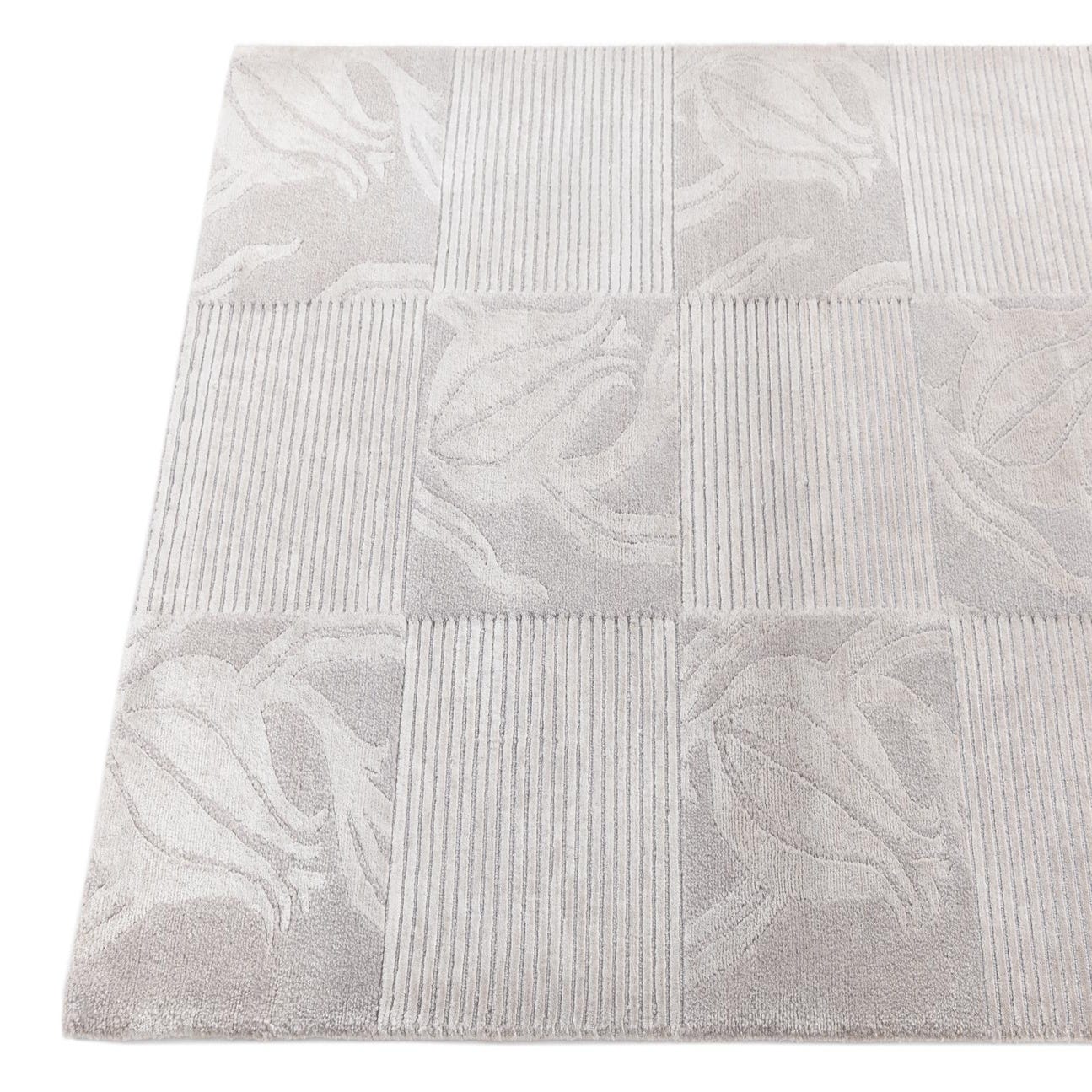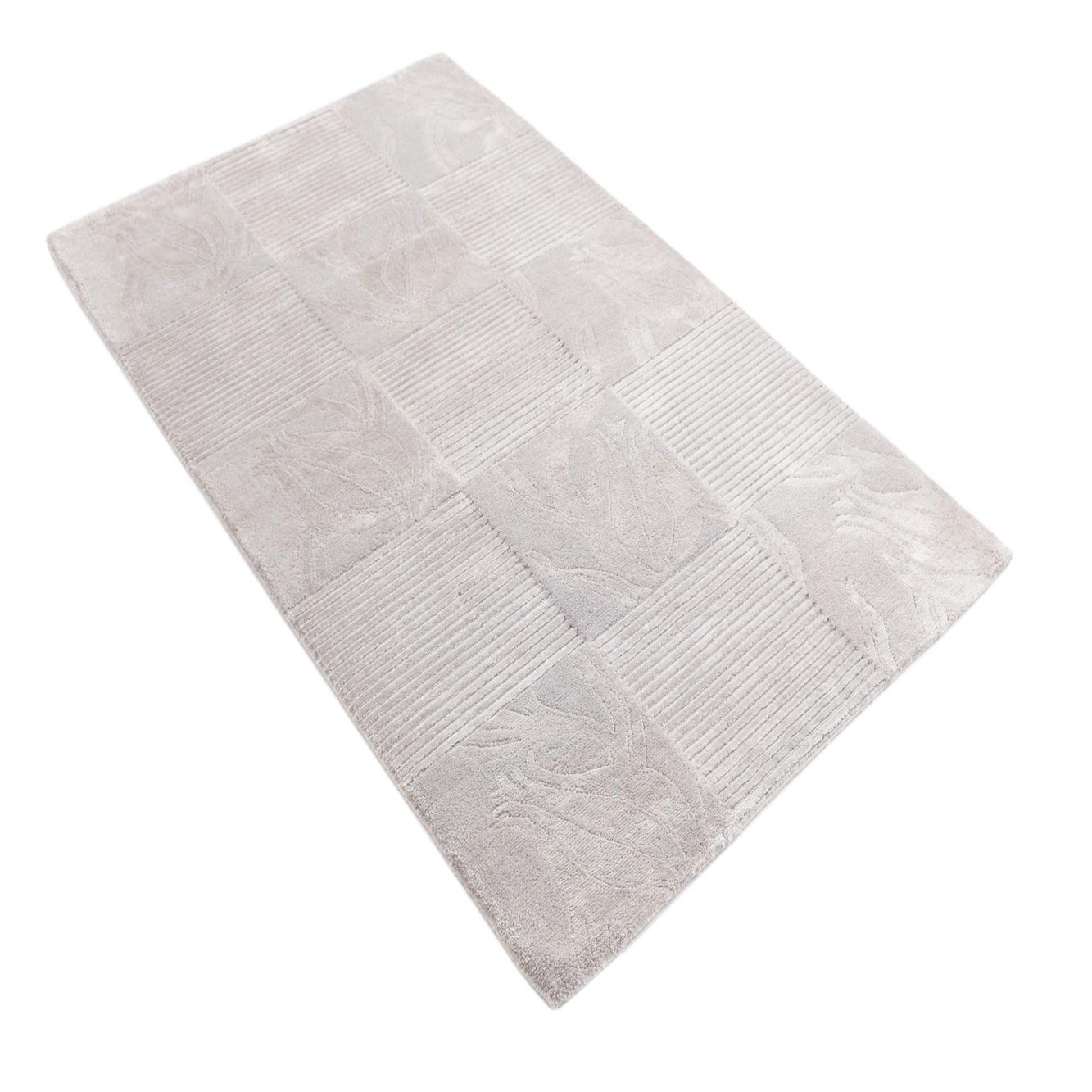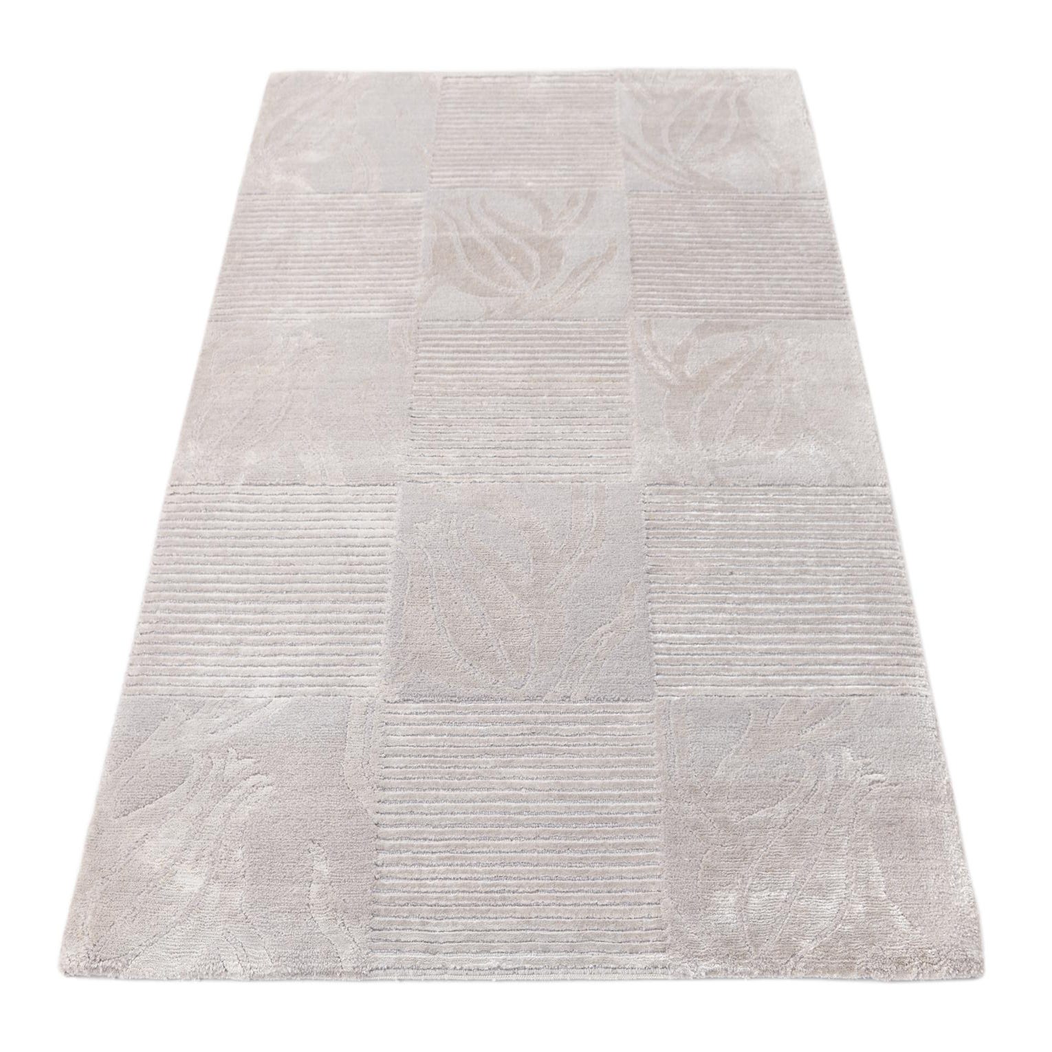 The Darya collection presents a sophisticated 3x5 hand-knotted rug crafted from 100% wool. This piece features a balanced pattern with blocks that alternate between a textured stripe design and elegant botanical motifs, creating a compelling visual and tactile contrast. The background color is a versatile gray, enriched with softer silver tones that define the intricate leaf-like designs.
