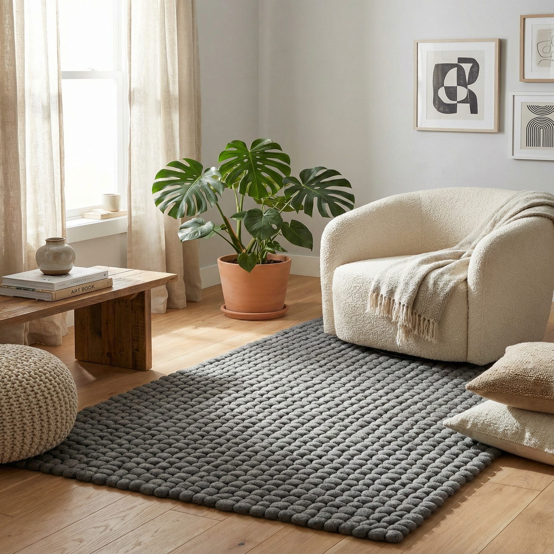 A dense field of hand-felted wool beads forms a tightly packed, honeycomb-like surface in a cool gray tone. Each rounded wool element creates a subtle, pebble-style pattern that reads as quiet texture from across the room and delivers a cushioned, tactile feel underfoot. The rug is handmade from 100% wool, so the pile has a soft, springy give and a matte finish that pairs easily with both warm and cool palettes.