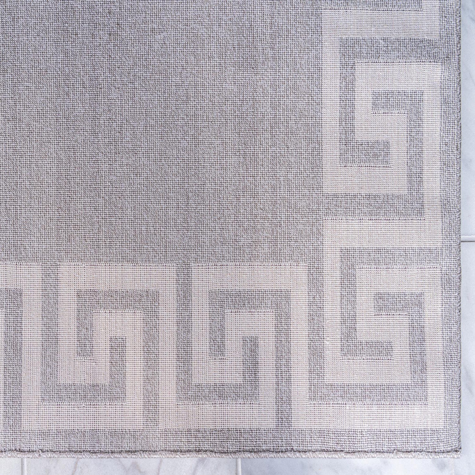 A clean Greek key border in soft beige frames a solid gray field, creating a crisp, architectural look that stays quietly modern. The geometric motif gives the rug a structured edge while the even, dense pile of the surface reads smooth underfoot. Machine-made from 100% polypropylene, the construction produces a consistent texture with a subtle sheen that catches light and highlights the contrast between the gray background and the beige border.