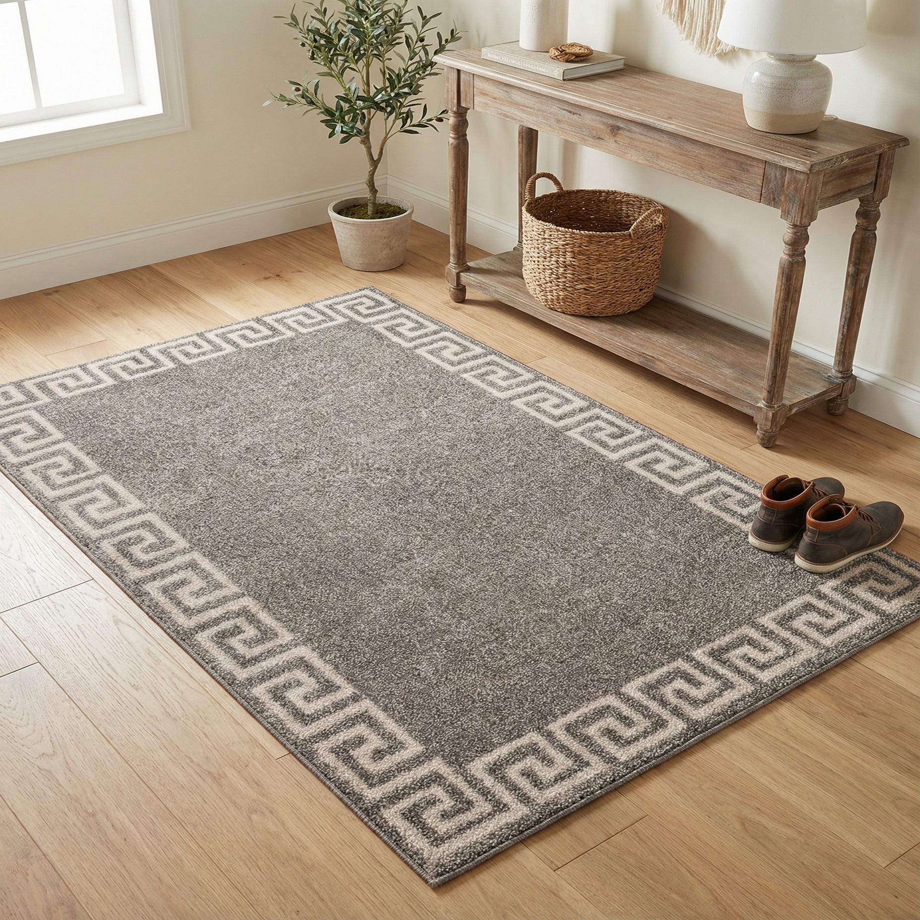 A clean Greek key border in soft beige frames a solid gray field, creating a crisp, architectural look that stays quietly modern. The geometric motif gives the rug a structured edge while the even, dense pile of the surface reads smooth underfoot. Machine-made from 100% polypropylene, the construction produces a consistent texture with a subtle sheen that catches light and highlights the contrast between the gray background and the beige border.