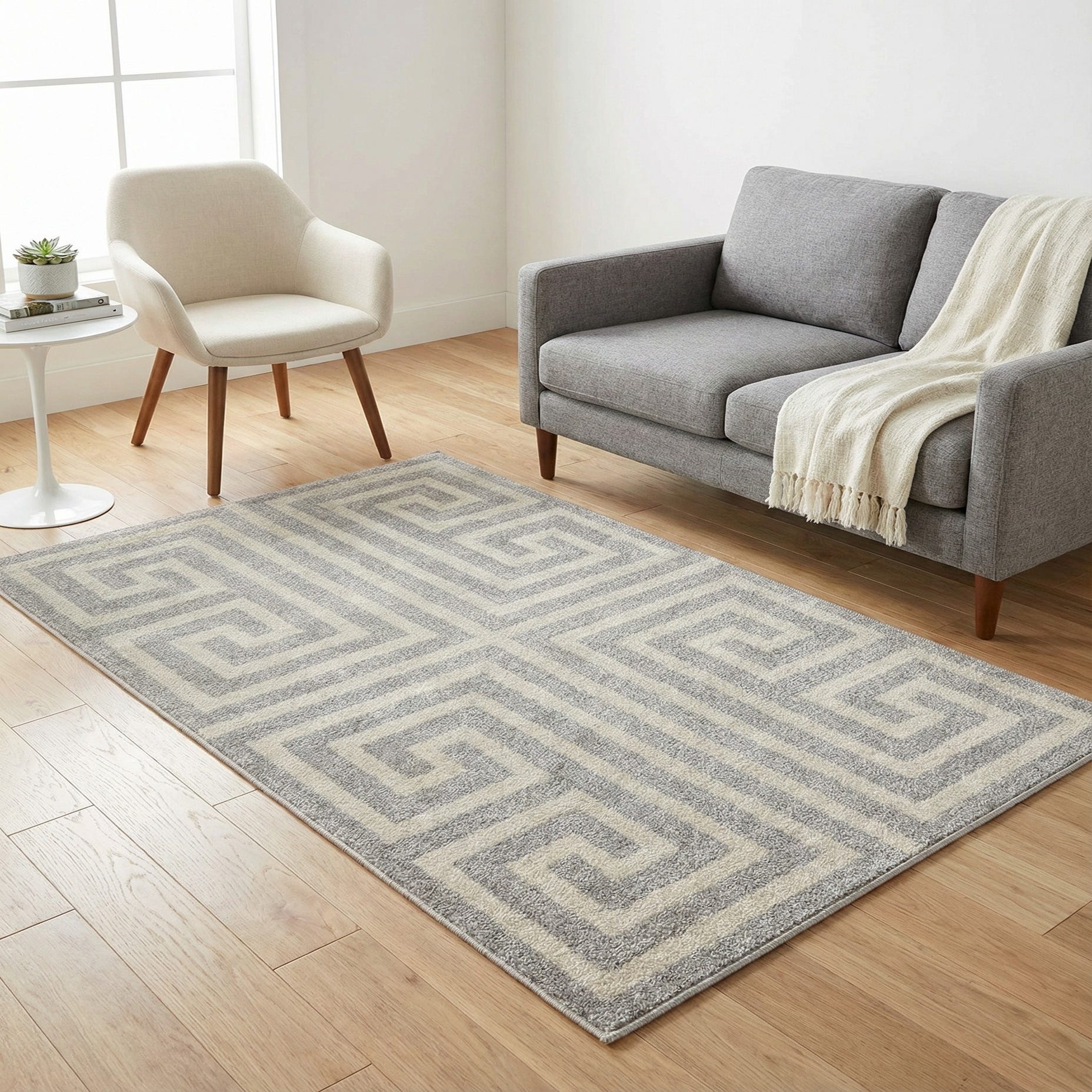 A clean, geometric Greek key motif in soft beige rests on a gray ground, forming a balanced, symmetrical layout that brings structure without dominating a room. Machine made from 100% polypropylene, the rug has a low-profile pile with a smooth, slightly plush hand and a subtle sheen that catches light gently. The alternating lines create a tactile contrast you can feel underfoot while keeping a refined, contemporary appearance.