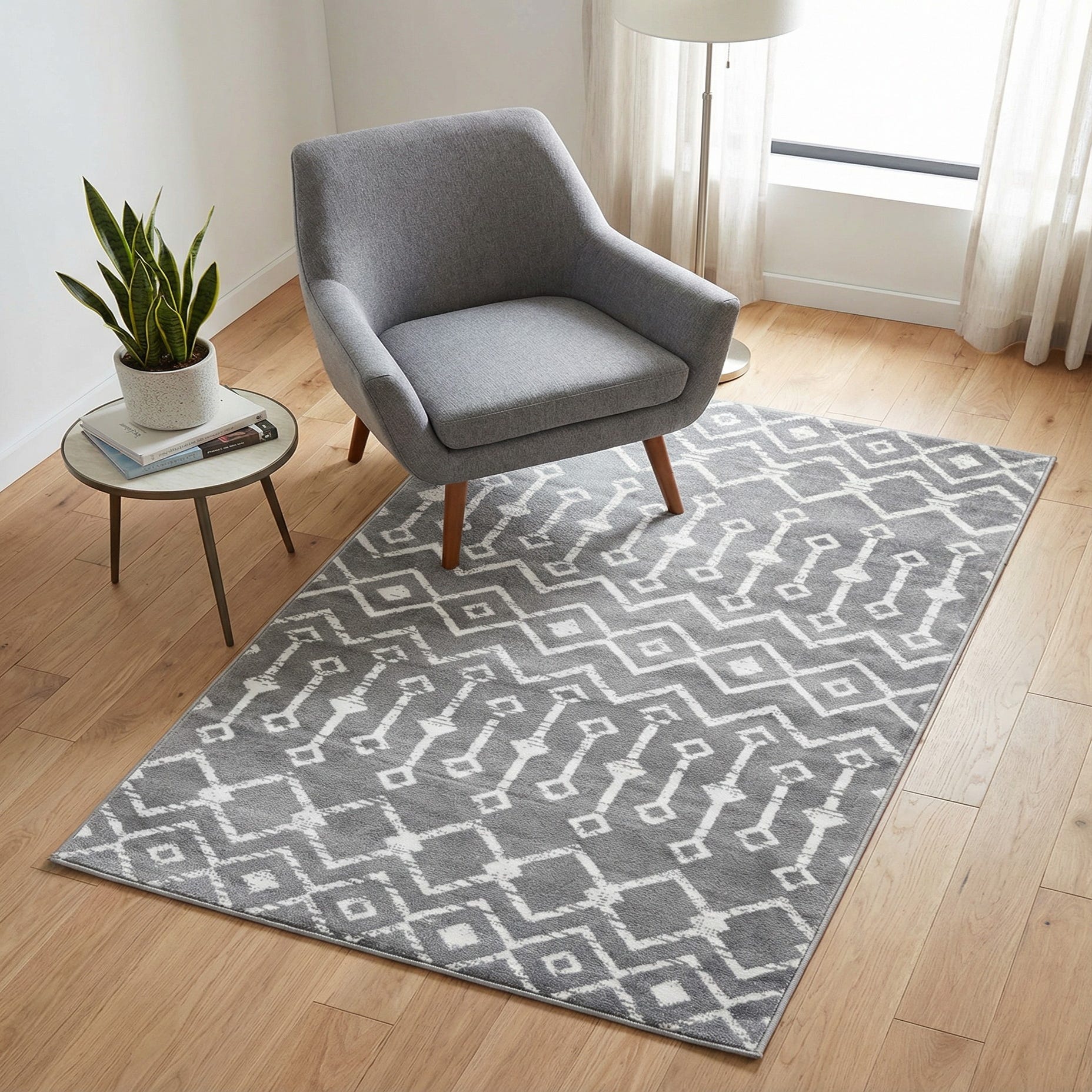 The neutral gray-and-ivory palette makes this rug versatile for many interiors — layer it with light wood furniture and airy textiles for a Scandinavian-inspired scheme, pair it with warm woods and rustic accents for a modern farmhouse feel, or keep lines clean and minimal for a contemporary living area. It works well to anchor a small seating group, bring softness to a bedroom, or add pattern and dimension to an entryway or home office.