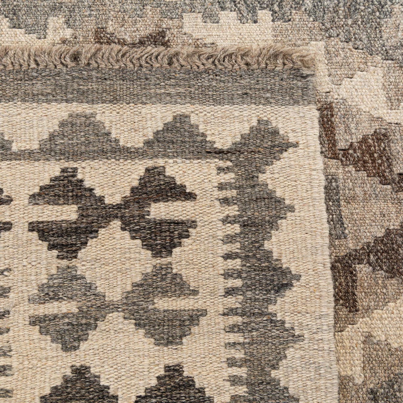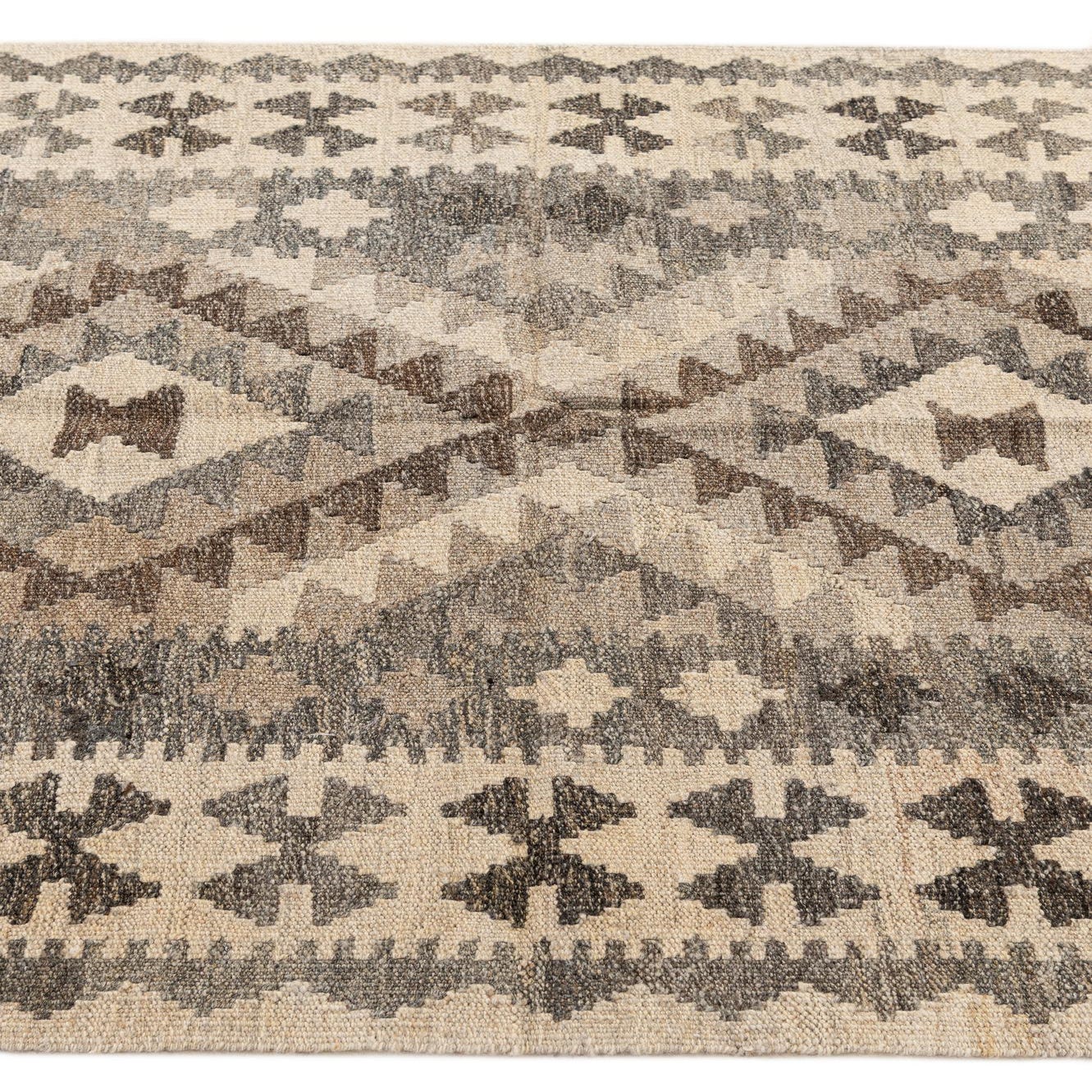 A 3x5 rectangular Kilim Maymana rug featuring tribal geometric patterns in shades of gray, silver, and beige.