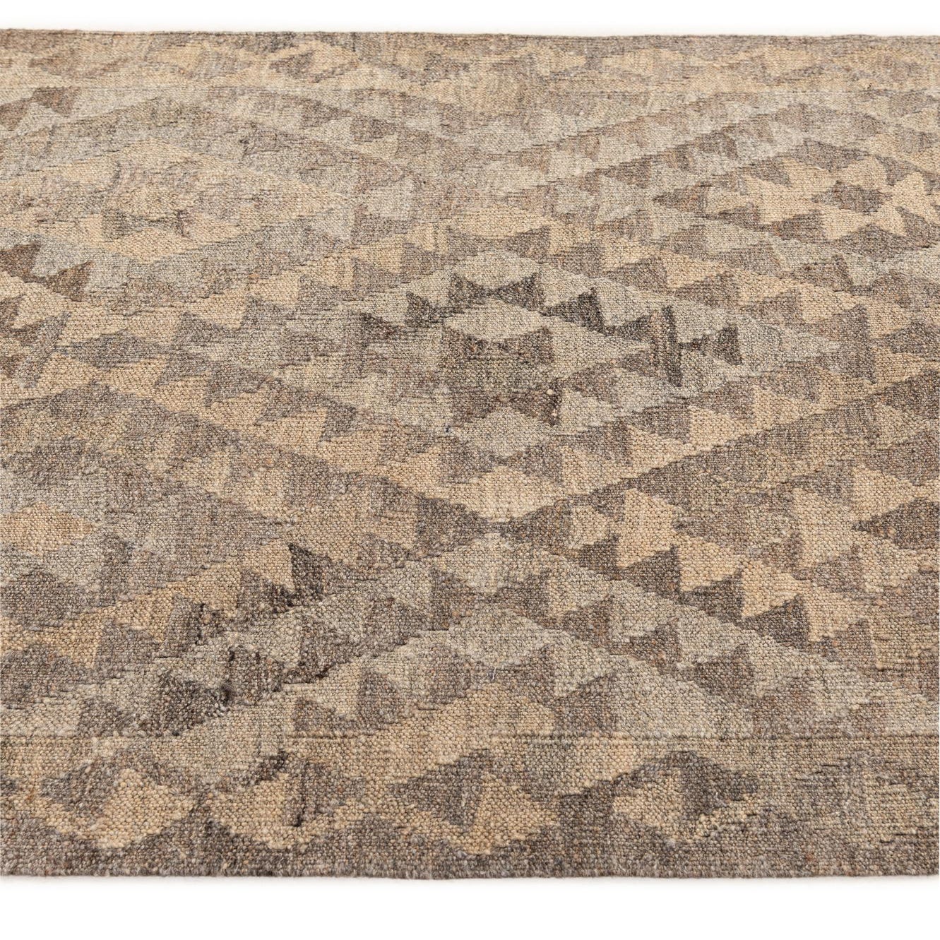 A 3x5 rectangular Kilim Maymana rug featuring a tribal geometric pattern in varying shades of gray and silver.