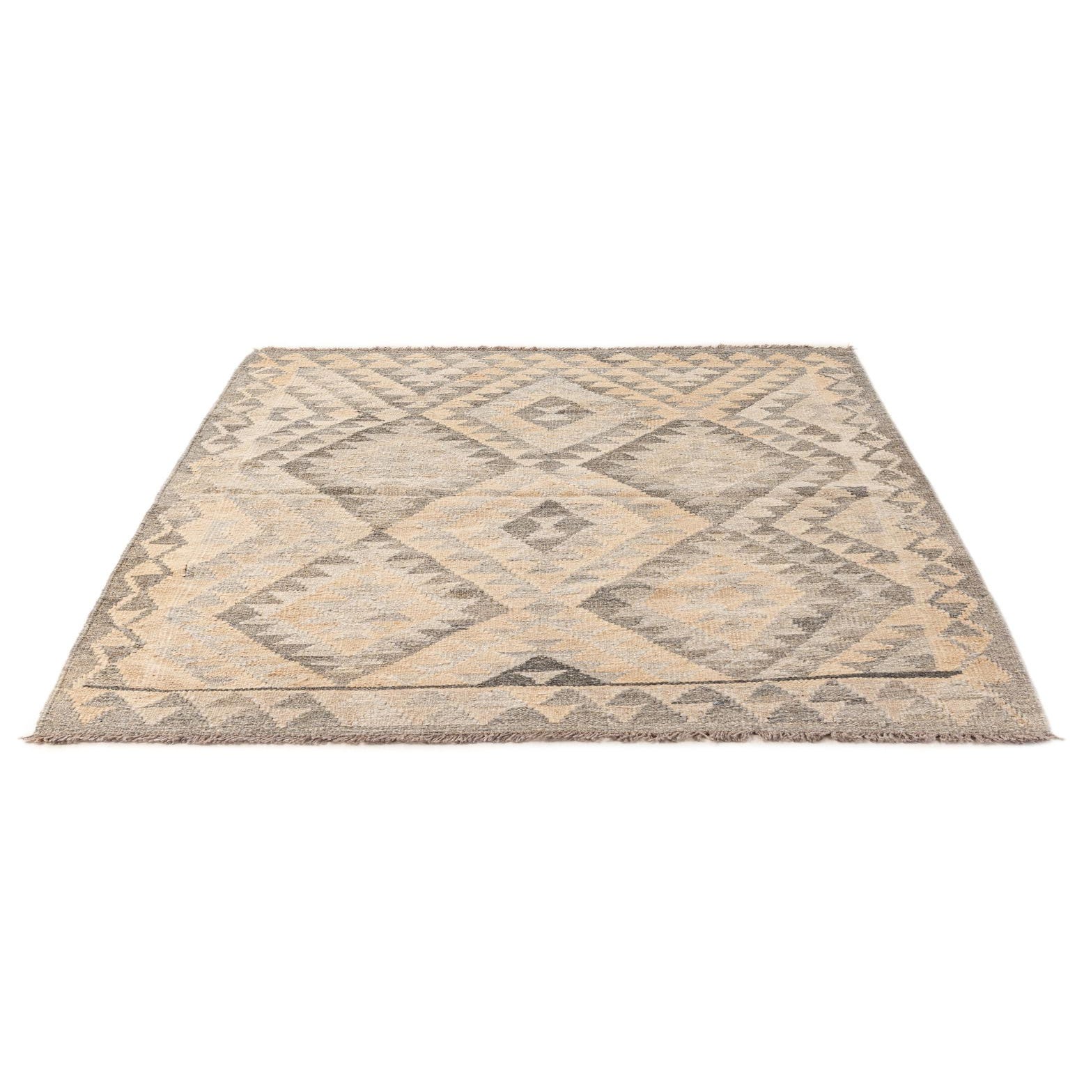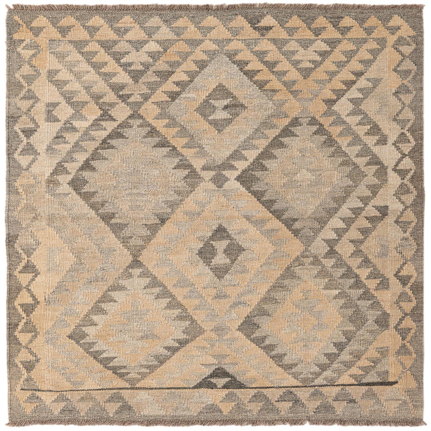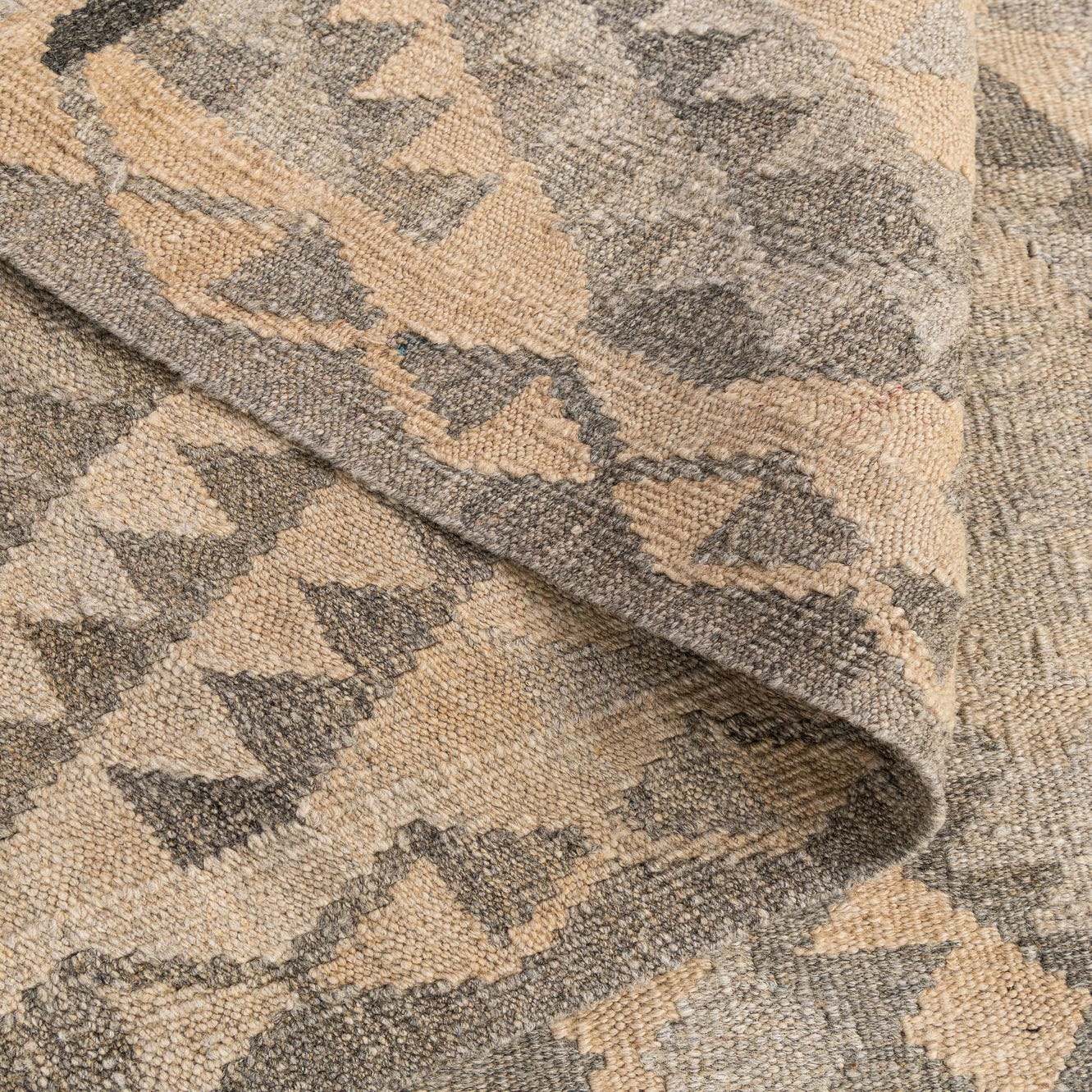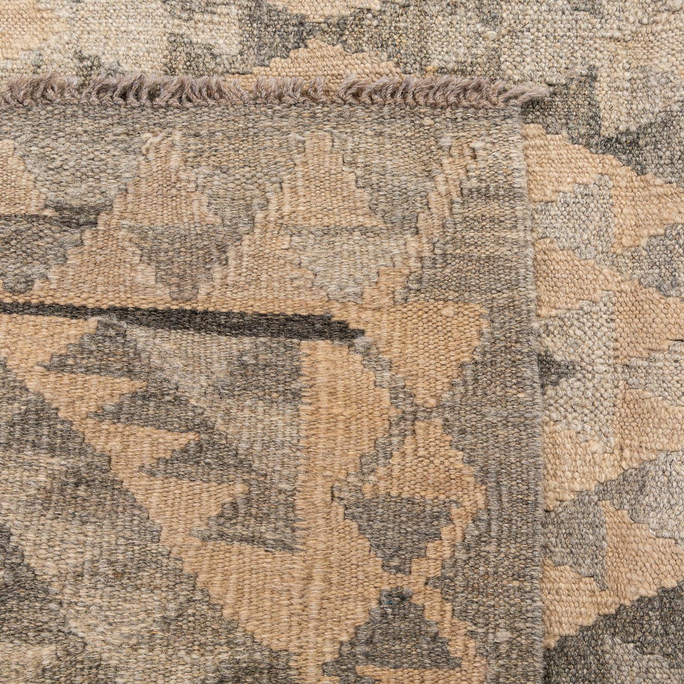 A 3x5 rectangular Kilim Maymana wool rug featuring a tribal geometric pattern in shades of gray and beige.