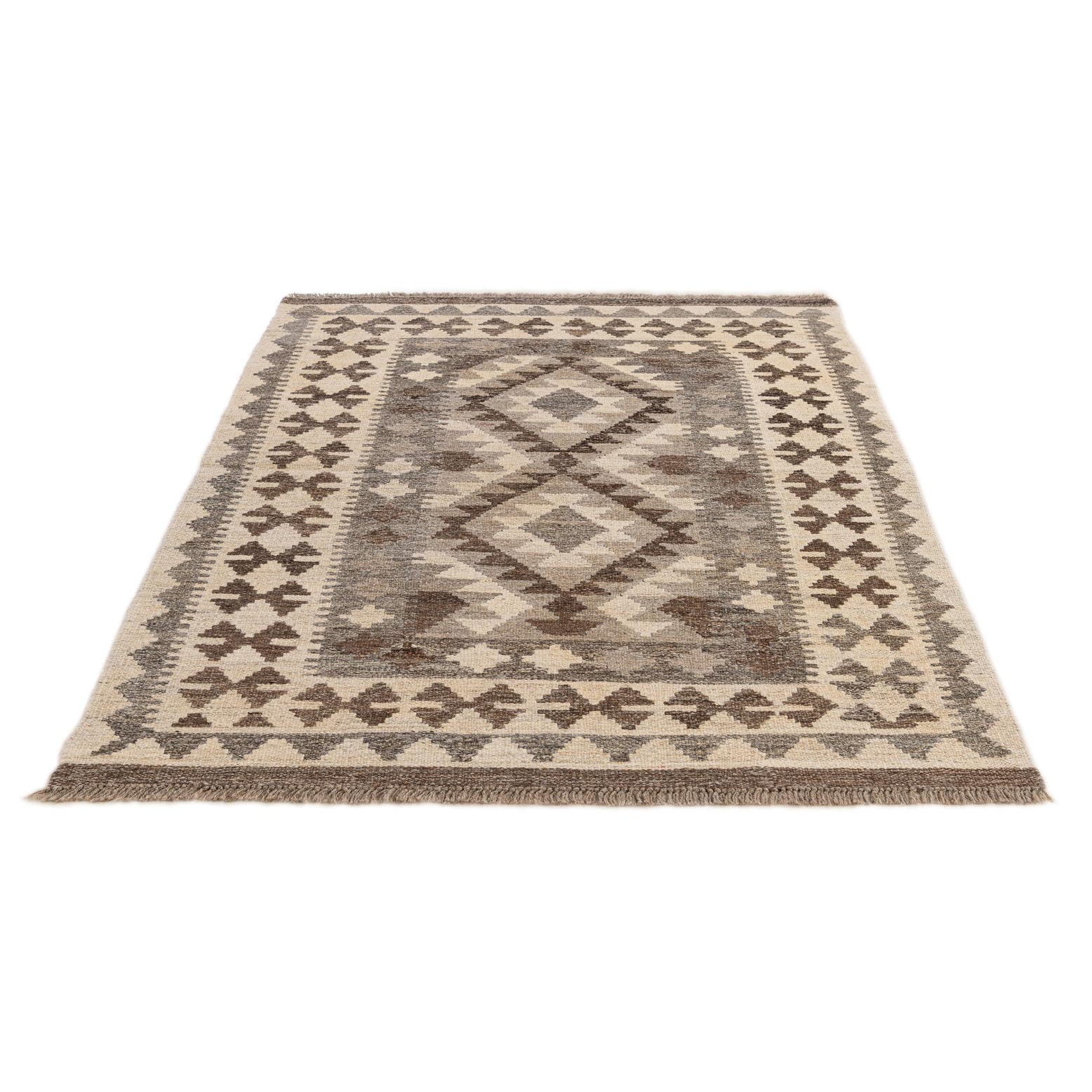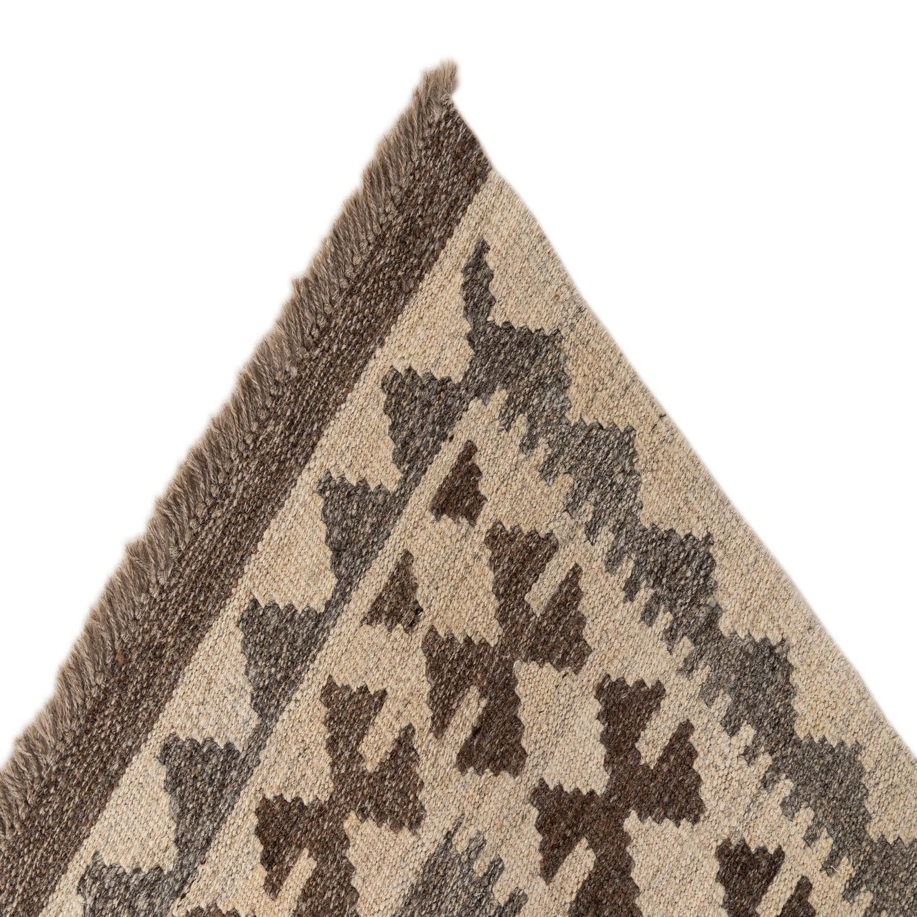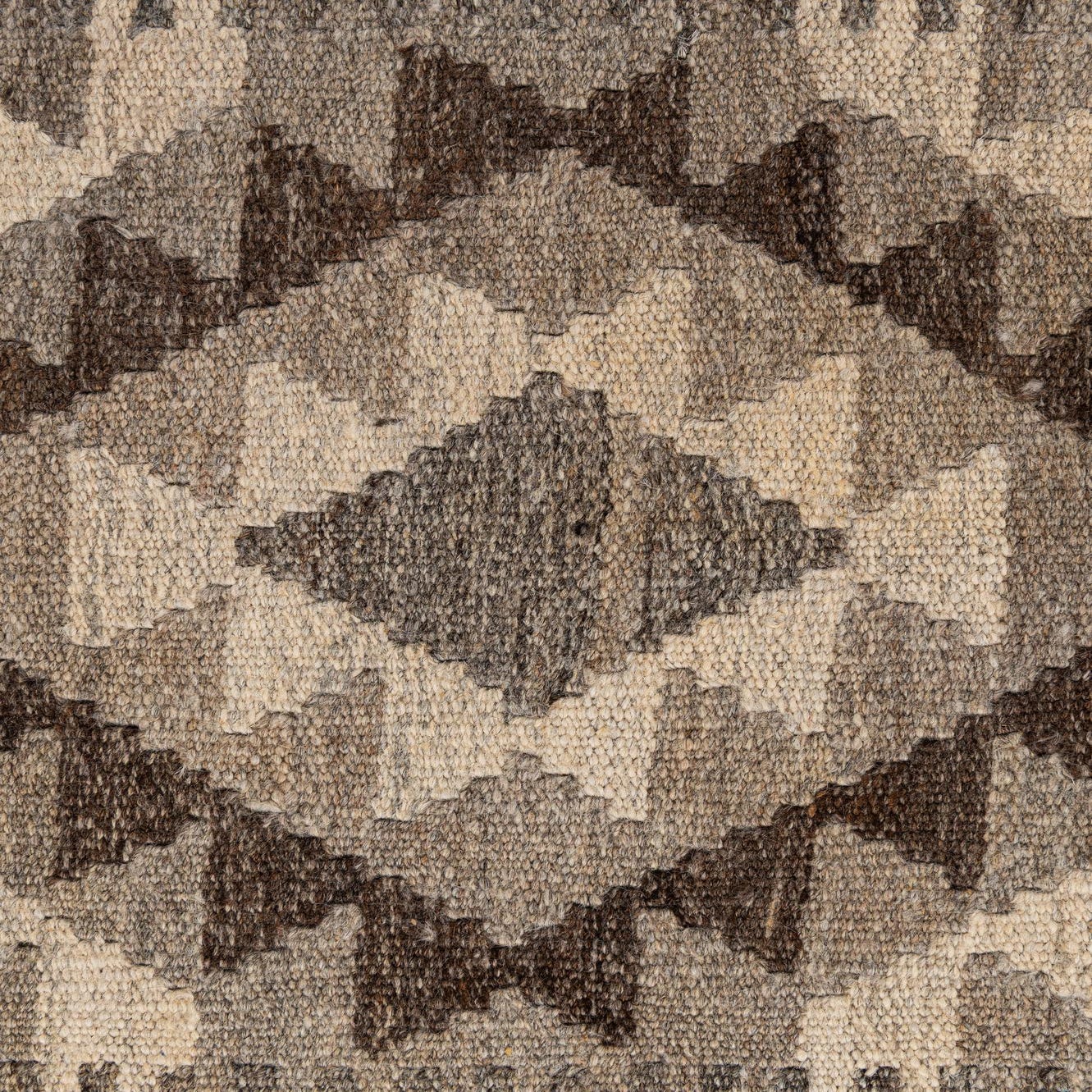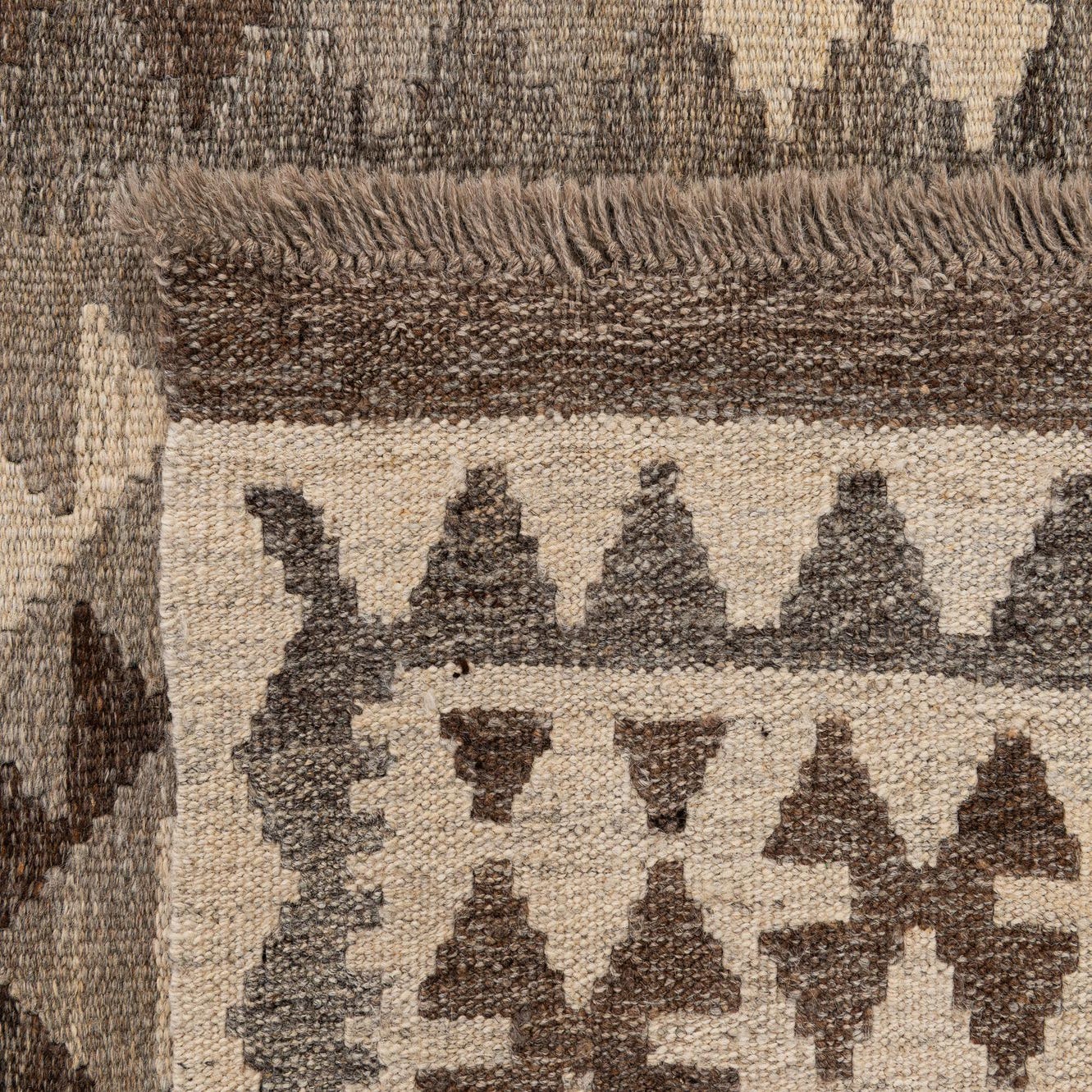 A 3x5 rectangular Kilim Maymana rug with tribal geometric patterns in shades of gray and silver, handmade from wool.