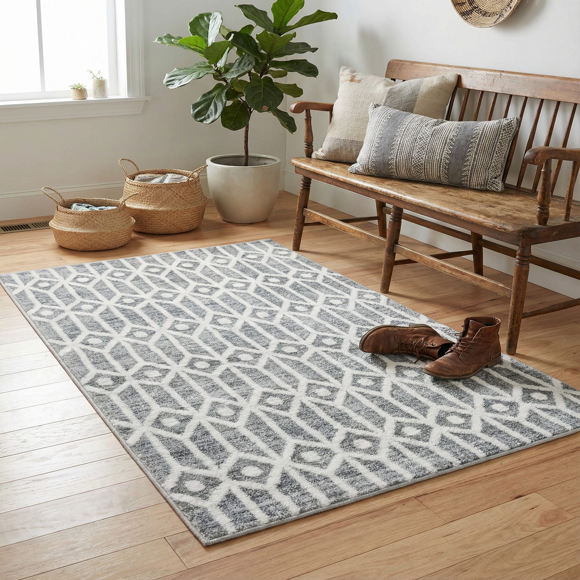 The neutral gray-and-ivory palette fits a range of interiors, from cool, contemporary schemes to more transitional rooms. Pair it with light wood furniture and matte black hardware for a modern look, or soften the room with linen upholstery and warm metallic accents. Sized for smaller areas, this piece works well in entryways, beside a bed, in front of a kitchen sink, or layered over a larger rug to introduce pattern and texture without overwhelming the space.