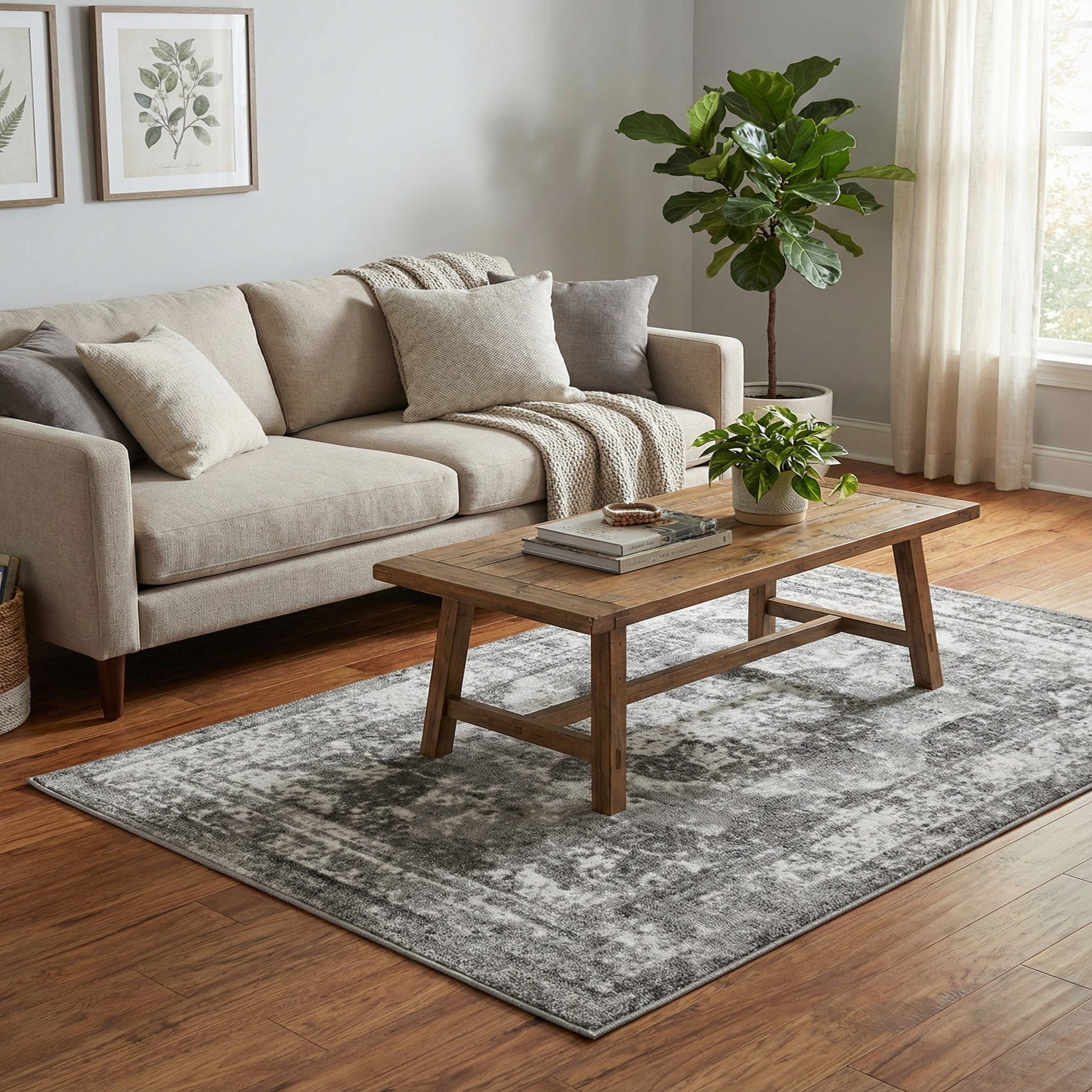 This piece works well beneath a coffee table in a transitional living room, layered at the foot of a bed for added texture in a neutral bedroom, or placed in an entryway to anchor pared-back decor. Pair it with cool-toned upholstery, warm wood furniture, or metal accents to balance its soft patina and bring a lived-in, comfortable feel to the room.