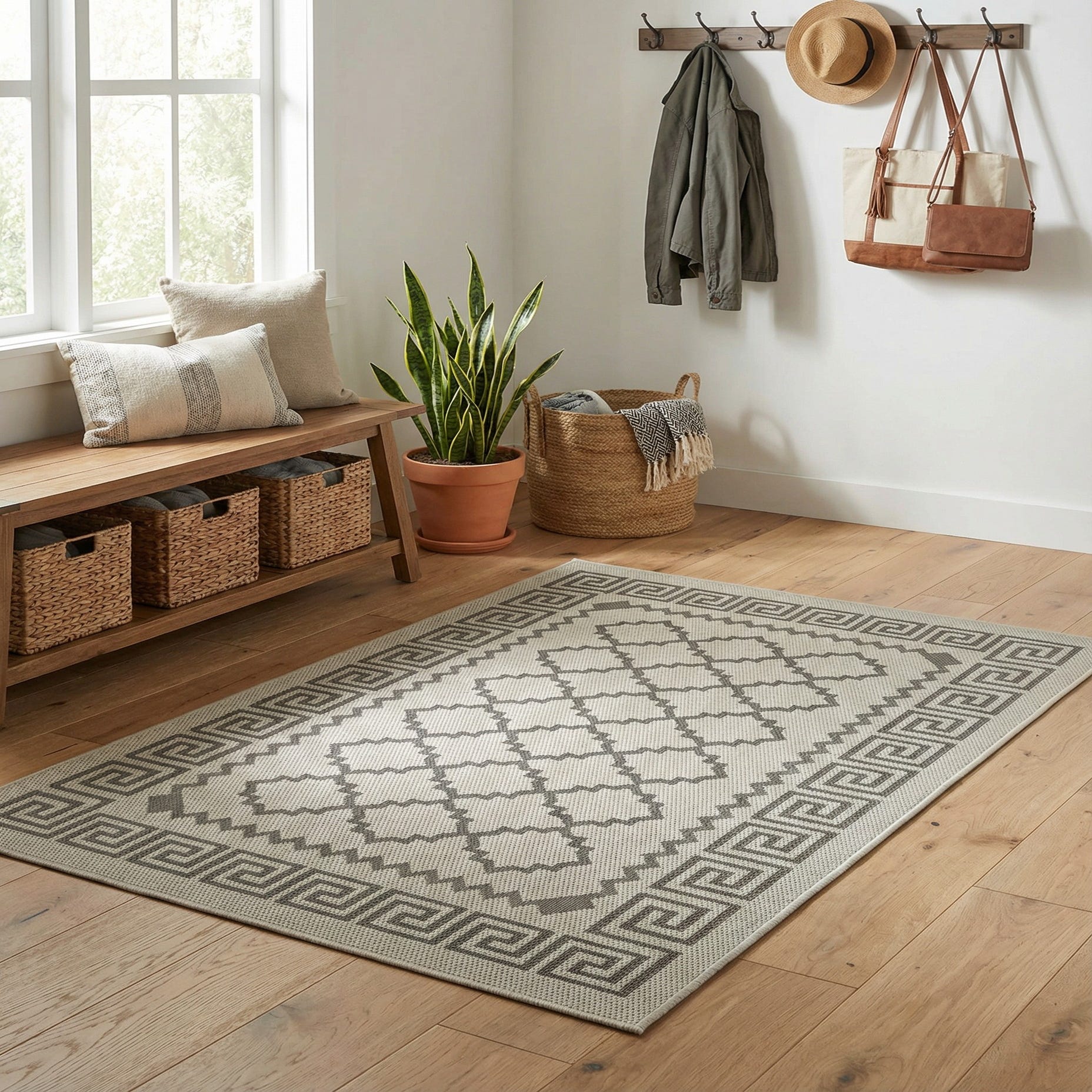 A crisp geometric design gives this polypropylene rug a clean, tailored look. A bold Greek?key border in silver frames a repeating stepped?lattice pattern across a gray background, creating a measured play between linear and angular motifs. The machine?made construction yields a low?profile, flatwoven texture that feels firm and slightly nubby underfoot, with a smooth surface that holds the pattern definition and color contrast well.