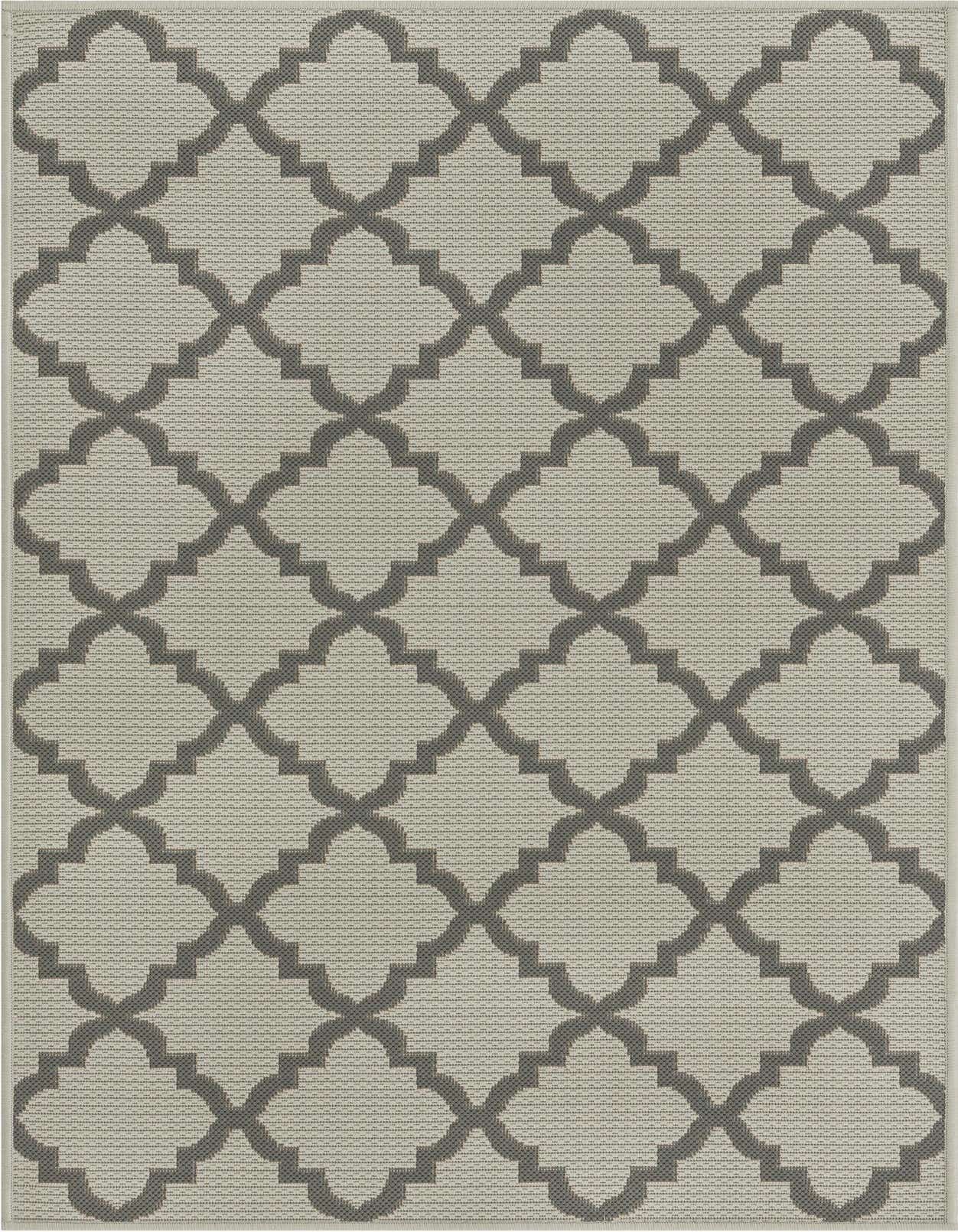 The Outdoor Lattice collection rug in a 3x5 size is a machine-woven piece crafted from 100% polypropylene, ensuring durability and easy maintenance. This rug features a striking lattice pattern that creates an interlocking design across its surface in shades of gray and silver, with the gray background harmonizing the piece. The polypropylene fibers give this rug a smooth texture and a flatweave construction that contribute to its neat appearance and practicality.
