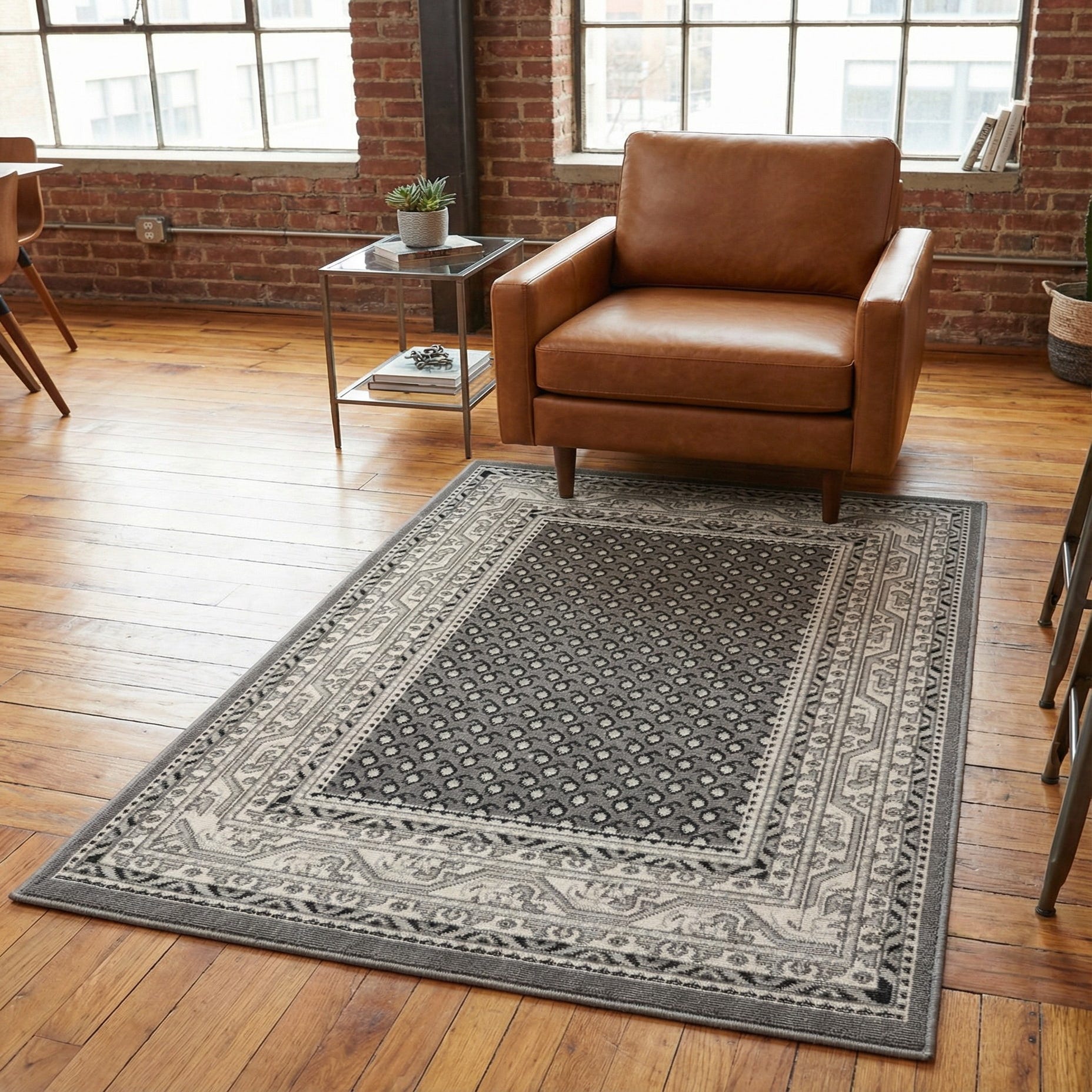 This rug fits well in transitional and modern-traditional interiors — place it in an entryway or hallway to ground a narrow space, layer it beneath a compact seating group, or use it to anchor a reading nook. It pairs nicely with warm wood furniture and matte black metal accents, and complements gray or ivory upholstery for a cohesive, tonal scheme.