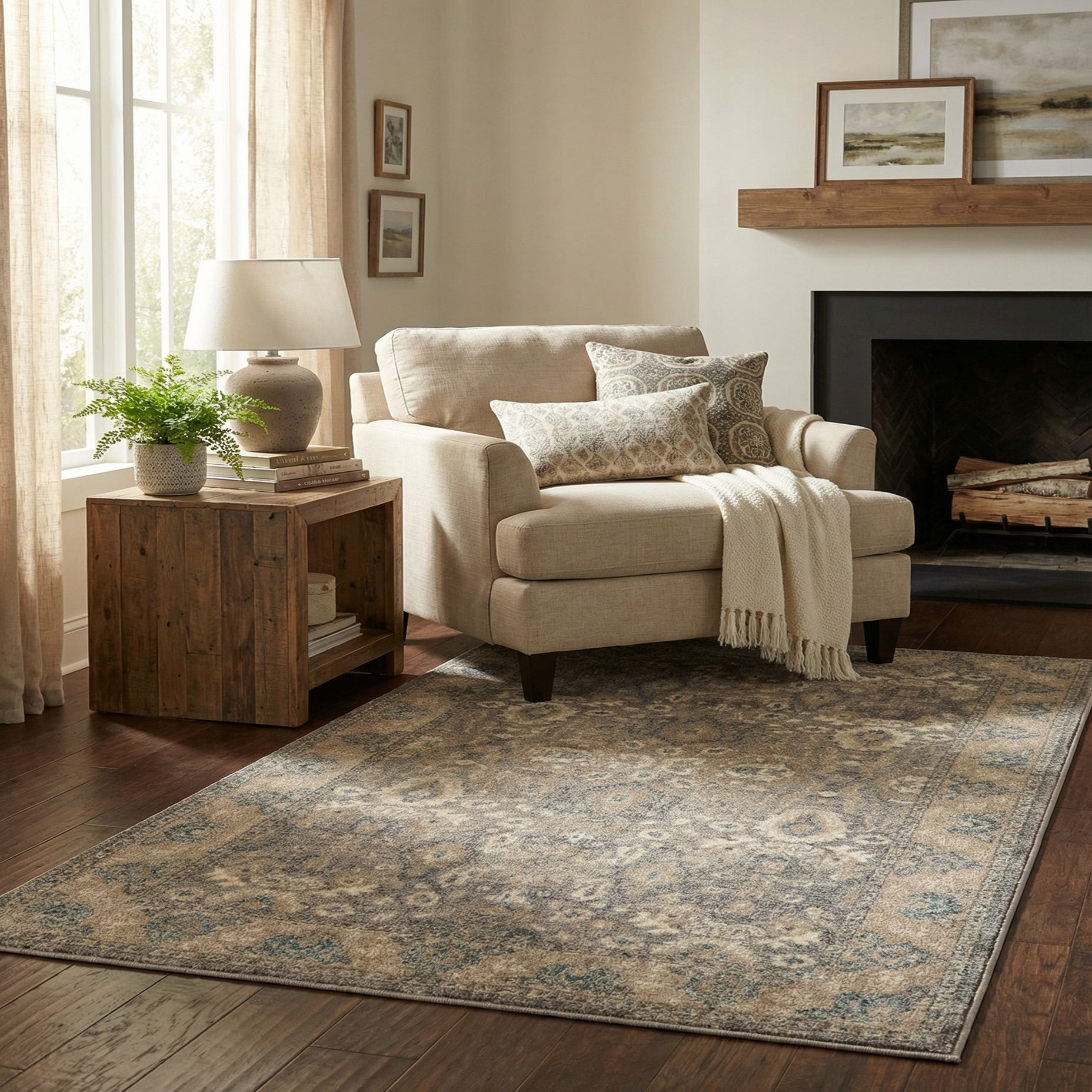 Machine-made from 100% polypropylene, the rug offers a low, dense pile that feels pleasantly cushioned underfoot and presents the pattern with clear definition. Its neutral palette works well in transitional or coastal interiors, pairing with weathered wood, light-gray upholstery, or crisp white trim. Use it to anchor a living area seating group, add softness to a bedroom, or place it beneath a small dining set for a subtle, pulled-together foundation.